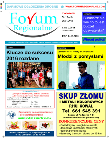 CMY K DARMOWE OG£OSZENIA DROBNE WWW.FORUMREGIONALNE.COM TYGODNIK Nr 17 (49) 29.04.2016 Cena 2.00 z³ (w tym 5 % VAT) ŒWIDWIN Burmistrz nie wie co to jest bud¿et obywatelski? ISSN 2449-7282 Wiêcej policji informacje, wydarzenia, kultura, zapowiedzi, historia, polemika, turystyka, ciekawostki, porady, sport, £OBEZ ŒWIDWIN Klucze do sukcesu M³odzi z pomys³ami 2016 rozdane Darmowe wi-fi i rowery dla wszystkich Szanowni Pañstwo! Uprzejmie informujemy, ¿e Filia kancelarii Adwokackiej Adwokata Artura Siewiorka znajduj¹ca siê przy ulicy 1 Maja 24 funkcjonuje w nowych godzinach: poniedzia³ek, czwartek: wtorek, œroda: pi¹tek: w Œwidwinie 9°° - 15°° 11°° - 17°° 9°° - 13°° Kontakt telefoniczny pod numerem: 781 900 800 lub +48 94 712 84 42 Str 2 Forum Regionalne ŒWIDWIN Nr 17 (49) 29.04.2016 ŒWIDWIN M³odzi z pomys³ami Burmistrz nie wie (ŒWIDWIN). W tym mieœcie nareszcie zaistnia³a rada, która rozumie zasady demokracji. Rada, która nie podnosi r¹k w g³osowaniu przy kolejnych pomys³ach burmistrza, ale sama z³o¿y³a propozycje nowych inicjatyw w mieœcie. Jest to M³odzie¿owa Rada Miasta. Problem w tym, ¿e nie dysponuje pieniêdzmi i to czy ich propozycje zostan¹ wdro¿one, zale¿y od Rady Miasta i samego burmistrza. Podczas sesji Rady Miasta, która odby³a siê 27 kwietnia o g³os poprosi³ przewodnicz¹cy M³odzie¿owej Rady Miasta Marcel Zych. W swoim wyst¹pieniu przedstawi³ zarówno dotychczasowe dzia³anie nowej rady, jak i plany na przysz³oœæ. Wœród nich s¹ takie, które zamierzaj¹ zrealizowaæ bez udzia³u pieniêdzy miejskich jak i takie, na które miasto musia³oby wy³o¿yæ w³asne œrodki. 8 marca radni M³odzie¿owej Rady Miasta wyszli na ulice, by wszystkim kobietom podarowaæ uœmiech. Panie otrzymywa³y kartki z ¿yczeniami. 22 kwietnia w liceum odby³ siê piknik, podczas którego m³odzi ludzie zbierali pieni¹dze na cel charytatywny w ramach akcji „Kilometry Dobra”. M³odzi ludzie zamierzaj¹ siê anga¿owaæ w kolejne pikniki na terenie œwidwiñskich szkó³, ale nie tylko. - Nasza M³odzie¿owa Rada Miasta bierze udzia³ w projekcie organizowanym przez Stowarzyszenie Carpe Diem. Wyszliœmy z projektem kina plenerowego. Planujemy zorganizowaæ seans filmowy. Szczegó³y s¹ jeszcze do przedyskutowania, jednak najpierw trzeba wygraæ konkurs. Nasi radni bêd¹ uczestniczyæ w forum samorz¹dowym, które odbêdzie siê od 1 do 3 czerwca 2016 roku w Ko³obrzegu. Naszym celem jest integracja z m³odzie¿owymi radami z ca³ego województwa, ale i zdobycie nowego doœwiadczenia, by nasza rada lepiej funkcjonowa³a. Planujemy zorganizowaæ w naszym mieœcie Dni M³odzie¿y czyli spotkanie m³odzie¿owych rad, aby zintegrowaæ siê i usprawniæ nasz¹ dzia³alnoœæ. Kolejnym pomys³em jest organizacja debaty oksfordzkiej, nie jako formy rywalizacji ale zabawy pomiêdzy uczniami œwidwiñskich szkó³, aby pokazaæ która szko³a jest lepsza w debatowaniu – powiedzia³ przewodnicz¹cy M³odzie¿owej Rady Miejskiej Marcel Zych. W dalszym wyst¹pieniu przekaza³ kolejne pomys³y. Ich realizacja zale¿y jednak ju¿ tylko od dobrej woli radnych i burmistrza. W imieniu M³odzie¿owej Rady Miasta i ca³ej œwidwiñskiej m³odzie¿y chcielibyœmy zwróciæ siê do pana burmistrza jak i do Rady Miasta w celu rozpatrzenia naszych dwóch pomys³ów. Pierwszy z nich: wprowadzenie w naszym mieœcie rowerów, jak i stanowisk. W ró¿nych miastach jest to bardzo pomocne, uzdrawia styl ¿ycia, poprawia kondycjê, jak i atmosferê. Jest pomys³, aby ustawiæ stanowiska w czterech g³ównych miejscach Œwidwina ogólnie dostêpnych: jedno przy Urzêdzie Miasta, kolejne w osiedlu, nastêpny przy ulicy Szczeciñskiej i Ko³obrzeskiej, s¹ to bardzo odleg³e miejsca w Œwidwinie. Drugim pomys³em jest, aby w mieœcie powsta³o darmowe wi-fi. Poniewa¿ z tego co mi wiadomo jest ale tylko w urzêdzie. Jesteœmy w dobie smartfonów, urz¹dzeñ przenoœnych i chcielibyœmy aby rada Miasta przeanalizowa³a ten pomys³ – doda³ Marcel Zych. Czêœæ radnych nie ukrywa³o, ¿e pomys³y m³odych ludzi s¹ atrakcyjne i warte wdro¿enia. Zapa³ czêœciowo zgasi³ przewodnicz¹cy Rady Miasta. – Jest to pomys³, który trzeba przetworzyæ, przedyskutowaæ, zapoznaæ siê w szczegó³ach, to jest jakby pierwszy etap tych zamierzeñ, forma informacyjna – uzna³ przewodnicz¹cy Rady Miasta Henryk Klaman. Przy takim zaanga¿owaniu pozostaje mieæ nadziejê, ¿e m³odzi ludzie w oczekiwaniu na wdro¿enie swoich pomys³ów, nazwanych tutaj „form¹ informacyjn¹” nie zdo³aj¹ przejœæ na emeryturê. Owa „forma informacyjna”, jak wynika³o z dopowiedzeñ m³odego radnego, to œciœle ju¿ przemyœlana, przedyskutowana propozycja. Jedyne co zostaje radnym miasta to poszukanie na ten cel pieniêdzy. MM co to jest bud¿et obywatelski? (ŒWIDWIN). Podczas sesji Rady Miejskiej Wies³aw Grzesiak reprezentuj¹cy Œwidwiñskie Stowarzyszenie Lotnictwa Rekreacyjnego powróci³o do kwestii wdro¿enia w ¿ycie bud¿etu obywatelskiego. W odpowiedzi us³ysza³ wiele s³ów, które mog³y zaskoczyæ niejednego s³uchacza. Odpowiedzi na pytanie W. Grzesiaka udzieli³ burmistrz miasta Jan Owsiak. – Jest to temat od kilku lat dynamicznie postêpuj¹cy, w naszym mieœcie raczkuje, tak powiem, aczkolwiek swego czasu wypowiada³em siê pozytywnie na temat takiego projektu. Co do skali z innymi miastami oczywiœcie mo¿emy mówiæ tu o rzêdzie kilkudziesiêciu tysiêcy z³ i tak¹ kwotê zadeklarowa³em. Przedstawiciel jednego stowarzyszenia nawet zwróci³ siê do mnie o podjêcie w tym kierunku jakichœ dzia³añ. Nie wykluczam, ¿e po dyskusji z Rad¹ Miasta taki projekt bud¿etu pojawi siê na rok 2017. Prosi³em tego pana, aby przedstawi³ mi kilka sugestii co ewentualnie mieszkañcy chcieliby zrobiæ. To jest istotne. Jeœli bêdzie to kolejny plac zabaw, a te¿ taki pomys³ by³, w sumie jedyny, to ja przepraszam bardzo. Wiemy doskonale, ¿e miasto w miarê mo¿li