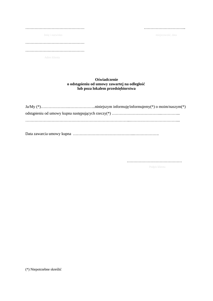 ……………………………………… ………………………….. Imię i nazwisko miejscowość, data ……………………………………… ……………………………………… Adres klienta Oświadczenie o odstąpieniu od umowy zawartej na odległość lub poza lokalem przedsiębiorstwa Ja/My (*)………………….………………..niniejszym informuję/informujemy(*) o moim/naszym(*) odstąpieniu od umowy kupna następujących rzeczy(*) ………………………………..…………... ……………………………………………………………………..………………………………... Data zawarcia umowy kupna ………………………………………..………………. …………………………………… Podpis klienta (*) Niepotrzebne skreślić