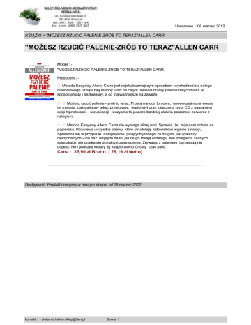 Utworzono : 06 marzec 2012 KSIĄŻKI > "MOŻESZ RZUCIĆ PALENIE-ZRÓB TO TERAZ"ALLEN CARR "MOŻESZ RZUCIĆ PALENIE-ZRÓB TO TERAZ"ALLEN CARR Model : "MOŻESZ RZUCIĆ PALENIE-ZRÓB TO TERAZ"ALLEN CARR Producent : � Metoda Easyway Allena Carra jest najskuteczniejszym sposobem wychodzenia z nałogu nikotynowego. Dzięki niej miliony ludzi na całym świecie rzuciły palenie natychmiast, w sposób prosty i bezbolesny, a co najważniejsze na zawsze. � � Możesz rzucić palenie - zrób to teraz. Prosta metoda to nowa, unowocześniona wersja tej metody. Uaktualniony tekst, przejrzysty, wartki styl oraz załączona płyta CD z nagraniem sesji hipnoterapii - wizualizacji - wszystko to jeszcze bardziej ułatwia palaczowi zerwanie z nałogiem. � � Metoda Easyway Allena Carra nie wymaga silnej woli. Sprawia, że mija nam ochota na papierosa. Rozwiewa wszystkie obawy, które utrudniają człowiekowi wyjście z nałogu. Sprawdza się w przypadku nałogowców palących jednego za drugim, jak i palaczy okazjonalnych - i to bez względu na to, jak długo trwają w nałogu. Nie polega na żadnych sztuczkach, nie ucieka się do taktyki zastraszenia. Zrywając z paleniem tą metodą nie utyjesz. No i podczas lektury tej książki wolno Ci cały czas palić. Cena : 35,90 zł Brutto ( 29,19 zł Netto) Dostępność: Produkt dostępny w naszym sklepie od 06 marzec 2012 kontakt : - [email protected] Strona 1
