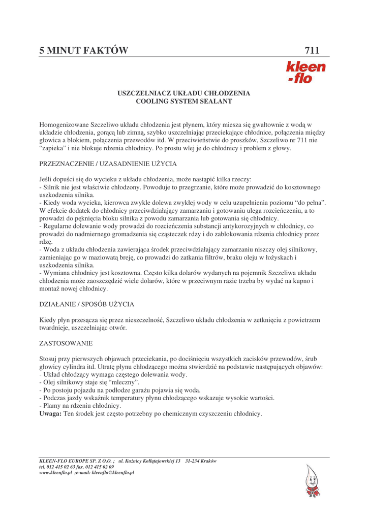 5 MINUT FAKTÓW 711 USZCZELNIACZ UKŁADU CHŁODZENIA COOLING SYSTEM SEALANT Homogenizowane Szczeliwo układu chłodzenia jest płynem, który miesza si gwałtownie z wod w układzie chłodzenia, gor c lub zimn , szybko uszczelniaj c przeciekaj ce chłodnice, poł czenia mi dzy głowica a blokiem, poł czenia przewodów itd. W przeciwie stwie do proszków, Szczeliwo nr 711 nie “zapieka” i nie blokuje rdzenia chłodnicy. Po prostu wlej je do chłodnicy i problem z głowy. PRZEZNACZENIE / UZASADNIENIE U YCIA Je li dopu ci si do wycieku z układu chłodzenia, mo e nast pi kilka rzeczy: - Silnik nie jest wła ciwie chłodzony. Powoduje to przegrzanie, które mo e prowadzi do kosztownego uszkodzenia silnika. - Kiedy woda wycieka, kierowca zwykle dolewa zwykłej wody w celu uzupełnienia poziomu “do pełna”. W efekcie dodatek do chłodnicy przeciwdziałaj cy zamarzaniu i gotowaniu ulega rozcie czeniu, a to prowadzi do p kni cia bloku silnika z powodu zamarzania lub gotowania si chłodnicy. - Regularne dolewanie wody prowadzi do rozcie czenia substancji antykorozyjnych w chłodnicy, co prowadzi do nadmiernego gromadzenia si cz steczek rdzy i do zablokowania rdzenia chłodnicy przez rdz . - Woda z układu chłodzenia zawieraj ca rodek przeciwdziałaj cy zamarzaniu niszczy olej silnikowy, zamieniaj c go w maziowat brej , co prowadzi do zatkania filtrów, braku oleju w ło yskach i uszkodzenia silnika. - Wymiana chłodnicy jest kosztowna. Cz sto kilka dolarów wydanych na pojemnik Szczeliwa układu chłodzenia mo e zaoszcz dzi wiele dolarów, które w przeciwnym razie trzeba by wyda na kupno i monta nowej chłodnicy. DZIAŁANIE / SPOSÓB U YCIA Kiedy płyn przes cza si przez nieszczelno , Szczeliwo układu chłodzenia w zetkni ciu z powietrzem twardnieje, uszczelniaj c otwór. ZASTOSOWANIE Stosuj przy pierwszych objawach przeciekania, po doci ni ciu wszystkich zacisków przewodów, rub głowicy cylindra itd. Utrat płynu chłodz cego mo na stwierdzi na podstawie nast puj cych objawów: - Układ chłodz cy wymaga cz stego dolewania wody. - Olej silnikowy staje si “mleczny”. - Po postoju pojazdu na podłodze gara u pojawia si woda. - Podczas jazdy wska nik temperatury płynu chłodz cego wskazuje wysokie warto ci. - Plamy na rdzeniu chłodnicy. Uwaga: Ten rodek jest cz sto potrzebny po chemicznym czyszczeniu chłodnicy. KLEEN-FLO EUROPE SP. Z O.O. ; ul. Ku nicy Kołł tajowskiej 13 31-234 Kraków tel. 012 415 02 63 fax. 012 415 02 09 www.kleenflo.pl ;e-mail: [email protected] 5 MINUT FAKTÓW KORZY CI DLA NABYWCY / ODBIORCY - Uszczelnia, smaruje i zwalcza korozj – potrójne działanie. - Płyn nie powoduje “zapiekania” ani zatykania rdzenia chłodnicy. - Działa kiedy ty jedziesz. - Oszcz dno czasu i pieni dzy. - Łatwe w u yciu, po prostu trzeba je doda do chłodnicy. - Koncentrat. - Współdziała z wszystkimi markowymi rodkami zapobiegaj cymi zamarzaniu i gotowaniu. - Powstrzymuje ska enie oleju. OPAKOWANIA: Nr katalogowy 711 - 12 x 250 ml KLEEN-FLO EUROPE SP. Z O.O. ; ul. Ku nicy Kołł tajowskiej 13 31-234 Kraków tel. 012 415 02 63 fax. 012 415 02 09 www.kleenflo.pl ;e-mail: [email protected] 711