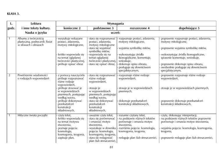 KLASA 3. L. godz. 1 2 1 Lektura i inne teksty kultury. Nauka o j´zyku Albumy z twórczoÊcià plastycznà, podr´cznik Âwiat w s∏owach i obrazach Powtórzenie wiadomoÊci o rodzajach wypowiedzeƒ Mityczne Êwiata poczàtki konieczne 2 Wymagania podstawowe 3 uczeƒ: - stara si´ rozpoznawaç postaci, zdarzenia, motywy mitologiczne - stara si´ wyjaÊniaç symbolik´ mitów, - krótko wypowiada si´ - wypowiada si´ na temat oglàdanej na temat oglàdanej twórczoÊci plastycznej, twórczoÊci plastycznej, - stara si´ opisaç obraz, - próbuje opisaç obraz - wyszukuje wskazane postaci, zdarzenia, motywy mitologiczne, rozszerzone 4 - rozpoznaje postaci, zdarzenia, motywy mitologiczne, - poprawnie rozpoznaje postaci, zdarzenia, motywy mitologiczne, - wyjaÊnia symbolik´ mitów, - poprawnie wyjaÊnia symbolik´ mitów, - wykorzystujàc êród∏a ikonograficzne, komentuje, wnioskuje, - dokonuje opisu obrazu, - pos∏uguje si´ s∏ownictwem specjalistycznym, - wykorzystujàc êród∏a ikonograficzne, sprawnie komentuje, wnioskuje, - z pomocà nauczyciela - stara si´ rozpoznawaç - rozpoznaje ró˝ne rodzaje ró˝ne rodzaje wypowiedzeƒ, próbuje rozpoznawaç wypowiedzeƒ, ró˝ne rodzaje wypowiedzeƒ, - stosuje je - stosuje je w wypowiedziach - próbuje stosowaç je w wypowiedziach pisemnych, w wypowiedziach pisemnych, post´pujàc pisemnych, post´pujàc wed∏ug wzoru, wed∏ug wzoru, - stara si´ dokonywaç - dokonuje przekszta∏ceƒ - próbuje dokonywaç przekszta∏ceƒ konstrukcji sk∏adniowych, przekszta∏ceƒ konstrukcji konstrukcji sk∏adniowych, sk∏adniowych, - czyta tekst, - krótko wypowiada si´ na temat motywu stworzenia, - poznaje poj´cia: kosmologia, kosmogonia, teogonia, - zapisuje plan, - uwa˝nie czyta tekst, - stara si´ porównywaç i omawiaç motyw stworzenia, - wyszukuje w s∏owniku poj´cia: kosmologia, kosmogonia, teogonia, - stara si´ redagowaç plan (lub streszczenie), 81 dope∏niajàce 5 - rozumie czytany tekst, - na podstawie ró˝nych tekstów porównuje i omawia motyw stworzenia, - rozró˝nia poj´cia: kosmologia, kosmogonia, teogonia, - poprawnie dokonuje opisu obrazu, - swobodnie pos∏uguje si´ s∏ownictwem specjalistycznym, - poprawnie rozpoznaje ró˝ne rodzaje wypowiedzeƒ, - stosuje je w wypowiedziach pisemnych, - poprawnie dokonuje przekszta∏ceƒ konstrukcji sk∏adniowych, - czyta, dokonujàc interpretacji, - na podstawie ró˝nych tekstów poprawnie porównuje i omawia motyw stworzenia, - wyjaÊnia poj´cia: kosmologia, kosmogonia, teogonia, - redaguje plan (lub streszczenie), - poprawnie redaguje plan (lub streszczenie), - pos∏uguje si´ s∏ownikiem wyrazów obcych, 1 Inne teksty mitologiczne o powstaniu Êwiata Jak wy˝ej 2 Biblia-Stary Testament: Historia - doskonali technik´ poczàtków Êwiata i ludzkoÊci czytania, - zna ró˝ne motywy, - czyta wskazane fragmenty tekstu, - wie, ˝e w Biblii wyst´pujà ró˝ne gatunki, - wie, ˝e istnieje styl biblijny, - zapisuje argumenty, 2 Wypowiedzenie wielokrotnie z∏o˝one - pos∏uguje si´ s∏ownikiem wyrazów obcych, jak wy˝ej - pos∏uguje si´ wydawnictwami encyklopedycznymi, jak wy˝ej - stara si´ czytaç z zachowaniem pauzowania, intonacji, - stara si´ rozpoznawaç motywy (tak˝e o znaczeniu symbolicznym), - dostrzega ró˝ne uj´cia fabularne, motywy, j´zyk, - wyszukuje wskazane fragmenty tekstu, - sprawnie pos∏uguje si´ wydawnictwami encyklopedycznymi, Jak wy˝ej - czyta z zachowaniem pauzowania, intonacji, - czyta z zachowaniem w∏aÊciwego pauzowania, intonacji, - rozumie czytany tekst, - rozpoznaje i nazywa motywy (tak˝e o znaczeniu symbolicznym), - porównuje uj´cia fabularne, motywy, j´zyk, - czyta, dokonujàc interpretacji, - rozpoznaje, nazywa i wyjaÊnia motywy (tak˝e o znaczeniu symbolicznym), - poprawnie porównuje uj´cia fabularne, motywy, j´zyk, - dostrzega, ˝e Biblia jest êród∏em - wyjaÊnia, dlaczego Biblia jest êród∏em gatunków, gatunków, - dostrzega cechy stylu biblijnego, - wyjaÊnia cechy stylu biblijnego, - stara si´ argumentowaç, - próbuje rozpoznawaç - stara si´ rozpoznawaç wypowiedzenia wypowiedzenia wielokrotnie z∏o˝one, wielokrotnie z∏o˝one, - stara si´ omówiç ich - próbuje omówiç ich budow´, budow´, - stara si´ dokonaç - próbuje dokonaç analizy sk∏adniowej, analizy sk∏adniowej, - próbuje tworzyç zdania, - stara si´ tworzyç zdania i je przekszta∏caç, 82 - argumentuje, broniàc tezy, - samodzielnie argumentuje, broniàc tezy, - rozpoznaje wypowiedzenia wielokrotnie z∏o˝one, - poprawnie rozpoznaje wypowiedzenia wielokrotnie z∏o˝one, - omawia ich budow´, - samodzielnie omawia ich budow´, - dokonuje analizy sk∏adniowej, - poprawnie dokonuje analizy sk∏adniowej, - tworzy zdania i celowo je przekszta∏ca, - poprawnie tworzy zdania i celowo je przekszta∏ca, 1 M. Heller Niech si´ stanie - uwa˝nie czyta tekst, - próbuje streszczaç czyjeÊ poglàdy, - krótko wypowiada si´ na temat poruszanych problemów, - rozpoznaje szkic [esej], - stara si´ rozpoznaç szkic [esej], - streszcza czyjeÊ poglàdy, - stara si´ streszczaç czyjeÊ poglàdy, - stara si´ uczestniczyç - uczestniczy w wymianie poglàdów, rozmowie, w wymianie poglàdów, rozmowie, - wyjaÊnia, czym jest szkic [esej], - poprawnie streszcza czyjeÊ poglàdy, - swobodnie prowadzi wymian´ poglàdów, rozmow´, - ujawnia w∏asne refleksje inspirowane tekstami biblijnymi i mitologicznymi, 1 1 2 M. Bia∏oszewski Przesuwa si´, - czyta wskazane przegwie˝d˝a fragmenty tekstu, - stara si´ rozpoznaç „ja” liryczne, okreÊliç to˝samoÊç osoby mówiàcej i autora tekstu, - stara si´ rozpoznaç - wie, czym jest aluzja aluzje literackie, literacka, - krótko wypowiada si´ - wyszukuje wskazane fragmenty tekstu, na temat tekstu, - uwa˝nie czyta tekst, - próbuje redagowaç opis - stara si´ redagowaç opis prze˝yç, prze˝yç, Przepis na interpretacj´ J. Kochanowski Psalmy - doskonali technik´ czytania, - pr