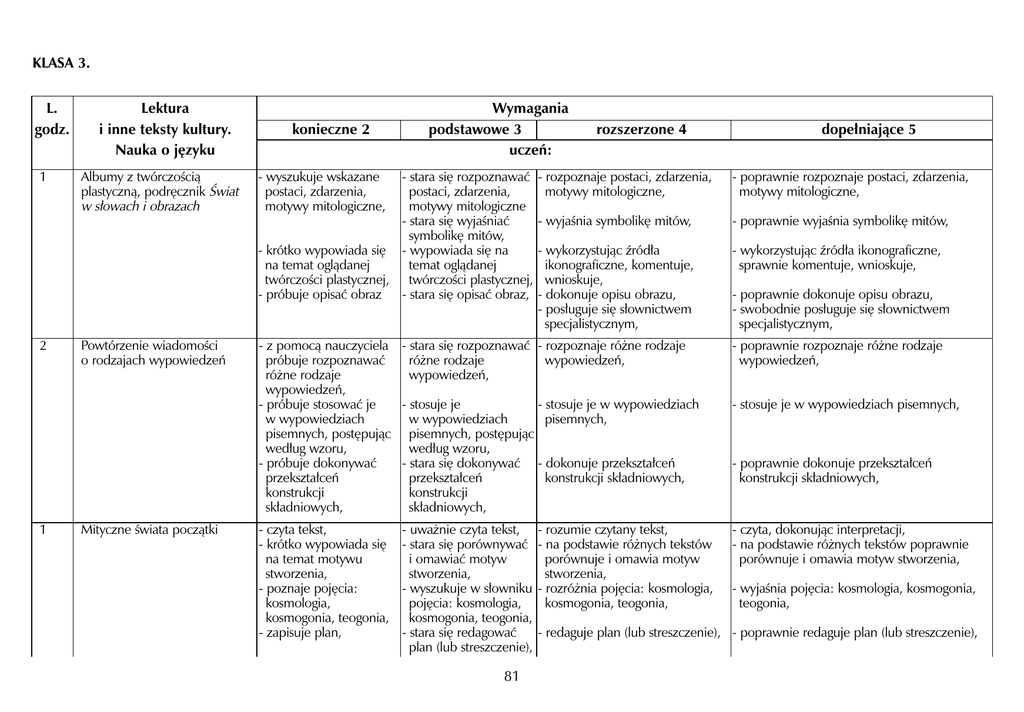 81 KLASA 3. L. Lektura Wymagania godz. i inne teksty kultury