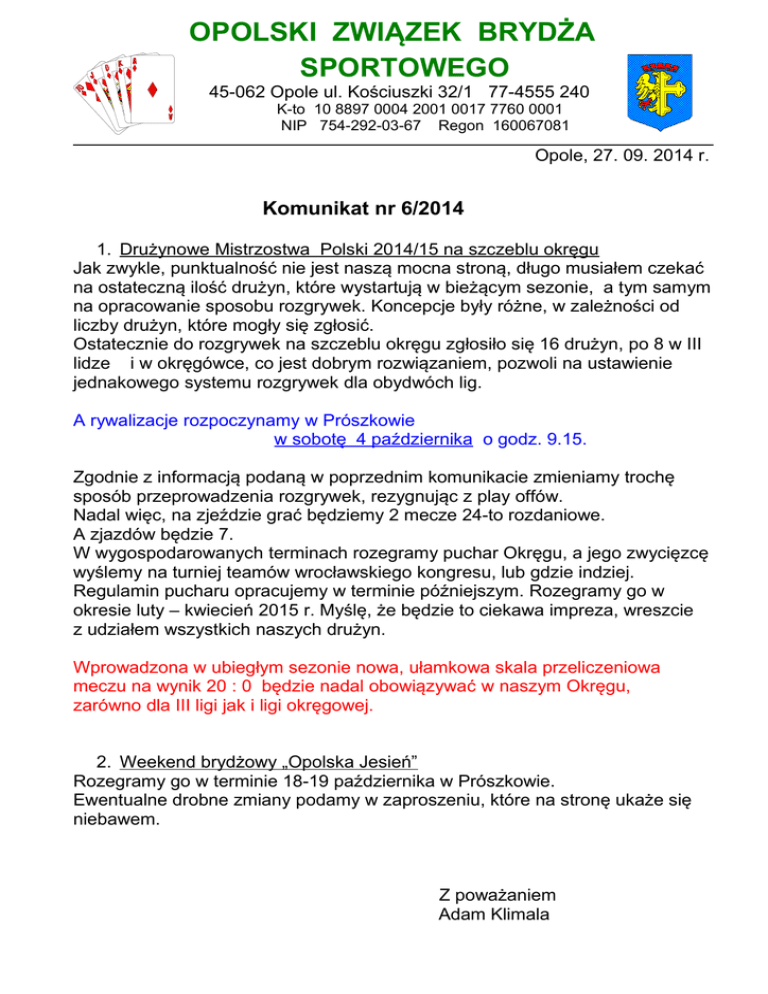 Pobierz/otwórz komunikat - Opolski Związek Brydża Sportowego