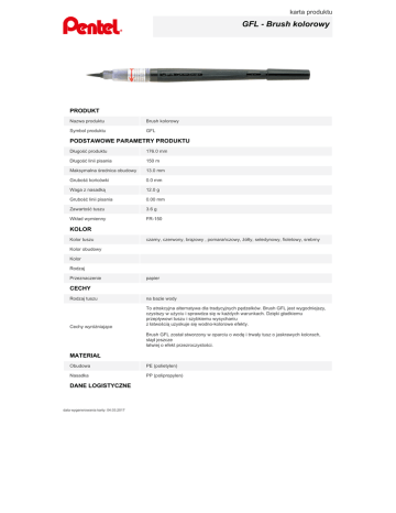 karta produktu GFL - Brush kolorowy PRODUKT Nazwa produktu Brush kolorowy Symbol produktu GFL PODSTAWOWE PARAMETRY PRODUKTU Długość produktu 176.0 mm Długość linii pisania 150 m Maksymalna średnica obudowy 13.0 mm Grubość końcówki 0.0 mm Waga z nasadką 12.0 g Grubość linii pisania 0.00 mm Zawartość tuszu 3.6 g Wkład wymienny FR-150 KOLOR Kolor tuszu czarny, czerwony, brązowy , pomarańczowy, żółty, seledynowy, fioletowy, srebrny Kolor obudowy Kolor Rodzaj Przeznaczenie papier CECHY Rodzaj tuszu Cechy wyróżniające na bazie wody To atrakcyjna alternatywa dla tradycyjnych pędzelków. Brush GFL jest wygodniejszy, czystszy w użyciu i sprawdza się w każdych warunkach. Dzięki gładkiemu przepływowi tuszu i szybkiemu wysychaniu z łatwością uzyskuje się wodno-kolorowe efekty. Brush GFL został stworzony w oparciu o wodę i trwały tusz o jaskrawych kolorach, stąd jeszcze łatwiej o efekt przezroczystości. MATERIAŁ Obudowa PE (polietylen) Nasadka PP (polipropylen) DANE LOGISTYCZNE data wygenerowania karty: 04.03.2017