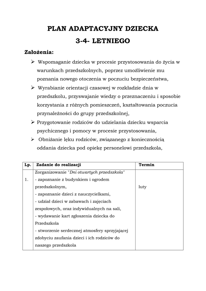 PLAN ADAPTACYJNY DZIECKA 3-4- LETNIEGO Założenia: Wspomaganie dziecka w procesie przystosowania do życia w warunkach przedszkolnych, poprzez umożliwienie mu poznania nowego otoczenia w poczuciu bezpieczeństwa, Wyrabianie orientacji czasowej w rozkładzie dnia w przedszkolu, przyswajanie wiedzy o przeznaczeniu i sposobie korzystania z różnych pomieszczeń, kształtowania poczucia przynależności do grupy przedszkolnej, Przygotowanie rodziców do udzielania dziecku wsparcia psychicznego i pomocy w procesie przystosowania, Obniżanie lęku rodziców, związanego z koniecznością oddania dziecka pod opiekę personelowi przedszkola, Lp. Zadanie do realizacji Termin Zorganizowanie "Dni otwartych przedszkola" 1. - zapoznanie z budynkiem i ogrodem przedszkolnym, - zapoznanie dzieci z nauczycielkami, - udział dzieci w zabawach i zajęciach zespołowych, oraz indywidualnych na sali, - wydawanie kart zgłoszenia dziecka do Przedszkola - stworzenie serdecznej atmosfery sprzyjającej zdobyciu zaufania dzieci i ich rodziców do naszego przedszkola luty 1. Spotkanie z rodzicami dzieci, które po raz 2. pierwszy przekraczają próg przedszkolny czerwiec -spotkanie rodziców z dyrektorem przedszkola – informacje na temat funkcjonowania przedszkola -zapoznanie rodziców z rozkładem dnia w przedszkolu, omówienie wszystkich spraw organizacyjnych, przebiegu procesu kształcenia i wychowania dzieci, - zwiedzanie przedszkola: zapoznanie z rozkładem sali, szatni, łazienki, holu, - omówienie przebiegu dni adaptacyjnych organizowanych w sierpniu 3. Dni adaptacyjne dla dzieci 3 -4 letnich - zabawy, gry dydaktyczne z dziećmi i z sierpień rodzicami, - zabawy przy piosenkach, - zabawy na placu zabaw, 4. - Zorganizowanie cyklu spotkań integracyjnych dla całej grupy, w celu lepszego poznania się Wrzesień/październik dzieci i wykształcenia w nich poczucia przynależności do wspólnoty grupowej, - organizowanie każdemu dziecku uroczystego "Dnia Urodzin"- wprowadzenie rodzinnego Cały rok nastroju w naszej grupie i lepsze zintegrowanie jej ze sobą, - częste chwalenie i nagradzanie dzieci za Wrzesień/cały rok najmniejsze osiągnięcia - wykorzystanie w tym celu dyplomiku "grzeczny przedszkolak" 5. Zorganizowanie spotkania organizacyjnego z rodzicami. Zapoznanie rodziców z: wrzesień a) harmonogramem dnia dzieci w tej grupie, b) Podstawą Programową oraz przyjętym przez placówkę programem c) Planem dydaktyczno - wychowawczym na bieżący rok szkolny, - Przygotowanie dla rodziców do wypełnienia ankiety informacyjne o dziecku, - Odczytanie "Listu do rodziców" opracowanego na okres adaptacji dzieci w przedszkolu, zawierającego ważne wskazówki, jak postępować z dzieckiem w pierwszych dniach jego pobytu w przedszkolu i zawieszenie go na tablicy ogłoszeń. 6. - Ustalenie terminów kontaktów indywidualnych z rodzicami „Harmonogram spotkań z Wrzesień/cały rok rodzicami” - Aktualizowanie tablicy informacyjnej dla rodziców, zamieszczając : propozycje zadań edukacyjnych i wychowawczych do pracy z dziećmi na dany miesiąc, stopień ich realizacji, repertuar wierszy i piosenek do pracy z dziećmi aktualności z życia grupy (zdjęcia z imprez i uroczystości grupowych) propozycje literatury pedagogicznej np. dotyczącej adaptacji i rozwoju emocjonalnospołecznego dzieci w wieku przedszkolnym, (oraz inne aktualne tematy) 8. - Zorganizowanie prelekcji dla rodziców z udziałem specjalistów- stworzenie okazji do Wrzesień/październik rozmowy na nurtujące ich problemy, dotyczące wstępnej adaptacji dzieci. 8. - organizowanie zajęć otwartych dla rodziców -umożliwienie obserwacji dzieci na tle grupy Cały rok rówieśniczej, - zaprezentowanie rodzicom metod pracy z dziećmi 9. - organizowanie uroczystości i imprez cały rok wg przedszkolnych w celu zintegrowania rodziców z Kalendarza Imprez przedszkolem, na dany rok - zaprezentowanie efektów pracy nauczycieli z dziećmi PIERWSZEGO DNIA DO PRZEDSZKOLA NALEŻY PRZYNIEŚĆ: Dziecko: - pantofelki, podpisane inicjałami dziecka, - misia lub inną " przytulankę" która będzie stanowić "namiastkę domu" i pomoże znieść rozstanie z mamą, - uśmiech na buzi i dobry humor. Szanowni Państwo, Rodzice pierwszego dnia przynoszą ze sobą: - pewność, że dziecko sobie poradzi, - zaufanie do nauczycielek i personelu przedszkola, - uśmiech na twarzy, która będzie bardzo obserwowana przez dziecko i z której dziecko szybko potrafi wyczytać dobre i złe emocje. We wrześniu rodzice wypełniają ankietę na temat adaptacji dziecka do przedszkola.