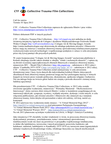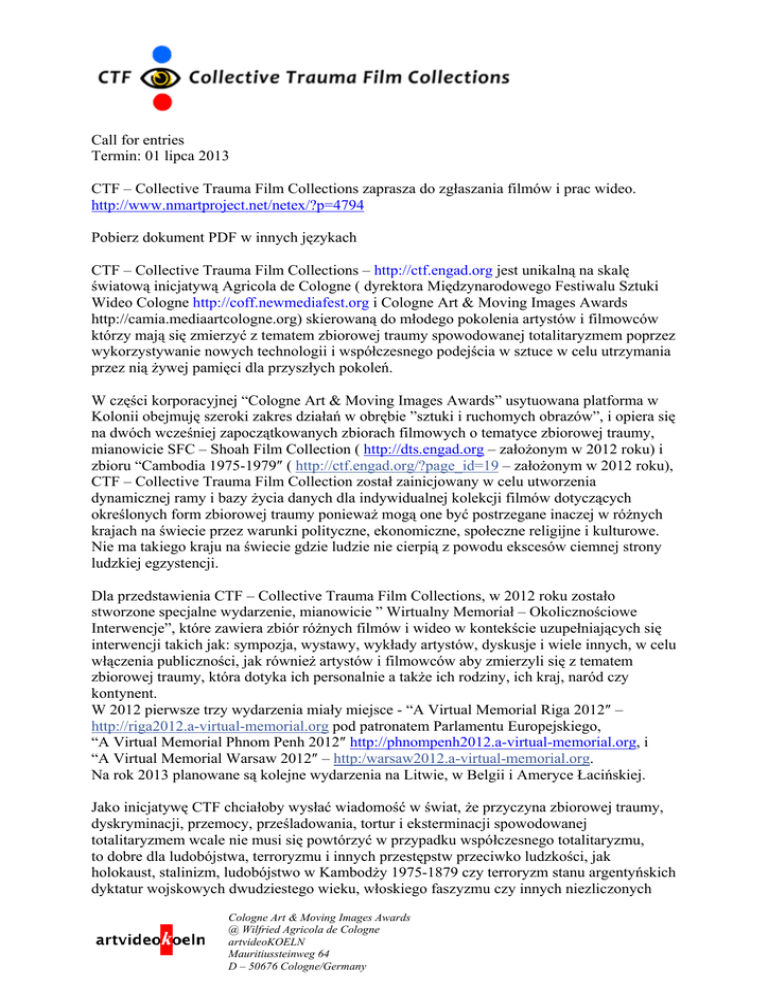 Call for entries Termin: 01 lipca 2013 CTF – Collective Trauma Film Collections zaprasza do zgłaszania filmów i prac wideo. http://www.nmartproject.net/netex/?p=4794 Pobierz dokument PDF w innych językach CTF – Collective Trauma Film Collections – http://ctf.engad.org jest unikalną na skalę światową inicjatywą Agricola de Cologne ( dyrektora Międzynarodowego Festiwalu Sztuki Wideo Cologne http://coff.newmediafest.org i Cologne Art & Moving Images Awards http://camia.mediaartcologne.org) skierowaną do młodego pokolenia artystów i filmowców którzy mają się zmierzyć z tematem zbiorowej traumy spowodowanej totalitaryzmem poprzez wykorzystywanie nowych technologii i współczesnego podejścia w sztuce w celu utrzymania przez nią żywej pamięci dla przyszłych pokoleń. W części korporacyjnej “Cologne Art & Moving Images Awards” usytuowana platforma w Kolonii obejmuję szeroki zakres działań w obrębie ”sztuki i ruchomych obrazów”, i opiera się na dwóch wcześniej zapoczątkowanych zbiorach filmowych o tematyce zbiorowej traumy, mianowicie SFC – Shoah Film Collection ( http://dts.engad.org – założonym w 2012 roku) i zbioru “Cambodia 1975-1979″ ( http://ctf.engad.org/?page_id=19 – założonym w 2012 roku), CTF – Collective Trauma Film Collection został zainicjowany w celu utworzenia dynamicznej ramy i bazy życia danych dla indywidualnej kolekcji filmów dotyczących określonych form zbiorowej traumy ponieważ mogą one być postrzegane inaczej w różnych krajach na świecie przez warunki polityczne, ekonomiczne, społeczne religijne i kulturowe. Nie ma takiego kraju na świecie gdzie ludzie nie cierpią z powodu ekscesów ciemnej strony ludzkiej egzystencji. Dla przedstawienia CTF – Collective Trauma Film Collections, w 2012 roku zostało stworzone specjalne wydarzenie, mianowicie ” Wirtualny Memoriał – Okolicznościowe Interwencje”, które zawiera zbiór różnych filmów i wideo w kontekście uzupełniających się interwencji takich jak: sympozja, wystawy, wykłady artystów, dyskusje i wiele innych, w celu włączenia publiczności, jak również artystów i filmowców aby zmierzyli się z tematem zbiorowej traumy, która dotyka ich personalnie a także ich rodziny, ich kraj, naród czy kontynent. W 2012 pierwsze trzy wydarzenia miały miejsce - “A Virtual Memorial Riga 2012″ – http://riga2012.a-virtual-memorial.org pod patronatem Parlamentu Europejskiego, “A Virtual Memorial Phnom Penh 2012″ http://phnompenh2012.a-virtual-memorial.org, i “A Virtual Memorial Warsaw 2012″ – http:/warsaw2012.a-virtual-memorial.org. Na rok 2013 planowane są kolejne wydarzenia na Litwie, w Belgii i Ameryce Łacińskiej. Jako inicjatywę CTF chciałoby wysłać wiadomość w świat, że przyczyna zbiorowej traumy, dyskryminacji, przemocy, prześladowania, tortur i eksterminacji spowodowanej totalitaryzmem wcale nie musi się powtórzyć w przypadku współczesnego totalitaryzmu, to dobre dla ludobójstwa, terroryzmu i innych przestępstw przeciwko ludzkości, jak holokaust, stalinizm, ludobójstwo w Kambodży 1975-1879 czy terroryzm stanu argentyńskich dyktatur wojskowych dwudziestego wieku, włoskiego faszyzmu czy innych niezliczonych Cologne Art & Moving Images Awards @ Wilfried Agricola de Cologne artvideoKOELN Mauritiussteinweg 64 D – 50676 Cologne/Germany przyczyn zbiorowej traumy dziejącej się w przeszłości a nawet obecnie w dzisiejszych czasach na naszych oczach w ogrodzie naszego sąsiada albo przekazywane codziennie za pomocą mediów takich jak prasa, telewizja czy internet. Indywidualna trauma pozostaje bardzo często podstawowym warunkiem życia. Zbiorowa trauma stanowi również zbiorowy uraz psychologiczny narodu przez wiele stuleci, jeśli ludzie nie starają się jej aktywnie przezwyciężyć. Od początku ludzkiej cywilizacji sztuka była rodzajem medium, które przenosiło indywidualną i zbiorową pamięć o przeszłości i teraźniejszości do przyszłości. Nie ma lepszego sposobu na utrzymanie żywej pamięci o zbiorowej traumie poprzez uwrażliwianie ludzi przez sztukę i żadna inna ekspresja artystyczna nie jest bardziej predestynowana do reprezentowania procesów niż ruchome obrazy. Bez względu na to jaki rodzaj przestępstwa stoi przeciwko ludzkości, wszystkie z nich muszą być rozumiane jako krótszy bądź dłuższy okres trwania jaki dana osoba przechodzi, zaczynając już w najmniejszym jądrze społecznym np.: rodzina, dyskryminacja w szkole lub brak szacunku do ludzi z różnych środowisk społecznych, kulturowych, etnicznych czy religijne konteksty, nietolerancja a więc warunki codziennego życia, z którymi wszyscy ludzie na świecie mogą się identyfikować. Te powoli bądź szybko rosnące procesy w pewnych okolicznościach politycznych, ekonomicznych, społecznych i kulturowych mogą prowadzić do najgorszych ekscesów jakich jest człowiek zdolny. Działy się one w dwudziestym wieku, w nowych formach uprzemysłowionych takich jak holokaust. W artystycznym sensie, ostateczne wyniki tych ekscesów są mniej interesujące niż zagłębianie się w eskalacje procesów np. co dzieje się z jednostką na różnych etapach w trakcie tych procesów, rosnącej dyskryminacji, przemocy, prześladowań i tortur. Bardzo często współczesne warunki życia w rodzinie lub społeczeństwie reprezentują lustro procesów historycznych. W ten sposób zmierzanie się z obecnością może dać artyście dostęp do zrozumienia przeszłości, tak samo jako widzowi oglądającemu sztukę. CTF – Collective Trauma Film Collections Pragnie zmotywować artystów i filmowców z całego świata do poszukiwania nowych ekscytujących wizji i strategii, w niezliczonych trudnych emocjonalnie i intelektualnie aspektów , z którymi ludzie mogą się identyfikować. CTF – Collective Trauma Film Collections Poszukuje różnych form artystycznych z wykorzystaniem wideo np. eksperymentalnych filmów, sztuki w