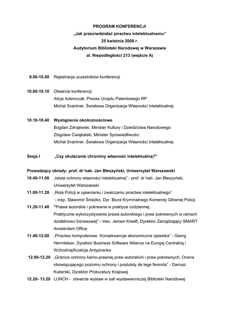 PROGRAM KONFERENCJI „Jak przeciwdziałać piractwu intelektualnemu” 25 kwietnia 2008 r. Audytorium Biblioteki Narodowej w Warszawie al. Niepodległości 213 (wejście A) 9.00-10.00 10.00-10.10 Rejestracja uczestników konferencji Otwarcie konferencji Alicja Adamczak, Prezes Urzędu Patentowego RP Michal Svantner, Światowa Organizacja Własności Intelektualnej 10.10-10.40 Wystąpienia okolicznościowe Bogdan Zdrojewski, Minister Kultury i Dziedzictwa Narodowego Zbigniew Ćwiąkalski, Minister Sprawiedliwości Michal Svantner, Światowa Organizacja Własności Intelektualnej Sesja I „Czy skutecznie chronimy własność intelektualną?” Prowadzący obrady: prof. dr hab. Jan Błeszyński, Uniwersytet Warszawski 10.40-11.00 „Istota ochrony własności intelektualnej” - prof. dr hab. Jan Błeszyński, Uniwersytet Warszawski 11.00-11.20 „Rola Policji w ujawnianiu i zwalczaniu piractwa intelektualnego” - insp. Sławomir Śnieżko, Dyr. Biura Kryminalnego Komendy Głównej Policji 11.20-11.40 "Prawa autorskie i pokrewne w praktyce codziennej. Praktyczne wykorzystywanie prawa autorskiego i praw pokrewnych w ramach dzialalnosci biznesowej" - mec. Jeroen Kreeft, Dyrektor Zarządzający SMART Amsterdam Office 11.40-12.00 „Piractwo komputerowe. Konsekwencje ekonomiczne zjawiska” - Georg Herrnleben, Dyrektor Business Software Alliance na Europę Centralną i Wchodnią/Koalicja Antypiracka 12.00-12.20 „Granice ochrony karno-prawnej praw autorskich i praw pokrewnych. Ocena obowiązującego poziomu ochrony i postulaty de lege ferenda” - Dariusz Kuberski, Dyrektor Prokuratury Krajowej 12.20- 13.20 LUNCH - otwarcie wystaw w sali wystawienniczej Biblioteki Narodowej Sesja II „Własność intelektualna to też własność” Prowadzący obrady: prof. dr hab. Michał du Vall, Uniwersytet Jagielloński 13.20-13.35 „Autoryzowane i nieautoryzowane nośniki optyczne oraz inne formy rozpowszechniania – Internet” - Jan Bałdyga, (ZPAV)/Koalicja Antypiracka 13.35-13.50 „Rola ZAiKS –u w zakresie zbiorowego zarządzania prawami autorskimi” - prof. Henryk Kuźniak, Stowarzyszenie Autorów ZAiKS 13.50-14.05 „Ochrona praw artystów wykonawców” - Krzysztof Kumor, Prezes Związku Artystów Scen Polskich 14.05-14.20 „Majątkowa wartość własności przemysłowej” - dr Alicja Adamczak, Prezes Urzędu Patentowego RP 14.20-14.35 „Własność intelektualna w teorii i praktyce bibliotek cyfrowych" – Katarzyna Ślaska, Zastępca Dyrektora Biblioteki Narodowej 14.35-14.50 „Ochrona praw autorskich twórców filmowych w Polsce” - Jacek Bromski, Prezes Stowarzyszenia Filmowców Polskich 14.50-15.05 „Ochrona praw artystów wykonawców w zakresie stosowania przepisów części karnej ustawy o prawie autorskim i prawach pokrewnych” – Jerzy Róziewicz, Prezes Związku Artystów Wykonawców 15.05-15.25 przerwa kawowa Panel dyskusyjny 15.25 - 17.00 „Dokąd zmierza prawo autorskie we współczesnym świecie? Jaki jest pożądany kierunek rozwoju nowoczesnego społeczeństwa informacyjnego w kontekście roli jaką odgrywa prawo autorskie?” Uczestnicy panelu: Jerzy Badowski (ZAiKS), dr hab. Anna Wojciechowska (Instytut Prawa Własności Intelektualnej Uniwersytetu Jagiellońskiego), prof. dr hab. Jan Błeszyński (Uniwersytet Warszawski), Dariusz Kuberski (Prokuratura Krajowa), podinsp. Dariusz Poniatowski (Komenda Główna Policji), Krzysztof Sadowski ( Polskie Stowarzyszenie Jazzowe), Marek Staszewski (ZPAV), Ewa Ziemiszewska ( Ministerstwo Kultury i Dziedzictwa Narodowego), mec. Wojciech Hryniewicz (Stowarzyszenie Sygnał) Panel prowadzić będą: prof. dr hab. Michał du Vall, Uniwersytet Jagielloński, Bartłomiej Witucki, Business Software Alliance