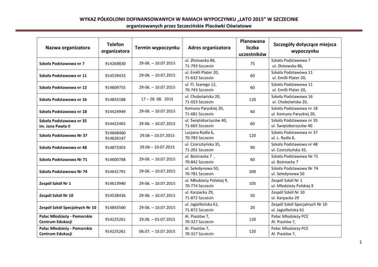 WYKAZ PÓŁKOLONII DOFINANSOWANYCH W RAMACH WYPOCZYNKU „LATO 2015” W SZCZECINIE organizowanych przez Szczecińskie Placówki Oświatowe Nazwa organizatora Telefon Termin wypoczynku organizatora Szkoła Podstawowa nr 7 914269830 29-06. – 10.07.2015 Szkoła Podstawowa nr 11 914539433 29-06. – 10.07.2015 Szkoła Podstawowa nr 12 914609755 29-06. – 10.07.2015 Szkoła Podstawowa nr 16 914833188 17 – 28. 08. 2015 Szkoła Podstawowa nr 18 914424949 29-06. – 10.07.2015 Szkoła Podstawowa nr 35 im. Jana Pawła II 914422465 29-06. – 10.07.2015 Szkoła Podstawowa Nr 37 914668460 914626147 29.06 – 10.07.2015 Szkoła Podstawowa nr 48 914873303 29.06 – 10.07.2015 Szkoła Podstawowa Nr 71 914600788 29-06. – 10.07.2015 Szkoła Podstawowa Nr 74 914631791 29-06. – 10.07.2015 Zespół Szkół Nr 1 914613940 29-06. – 10.07.2015 Zespół Szkół Nr 10 914538436 29-06. – 10.07.2015 Zespół Szkół Specjalnych Nr 10 914843560 29-06. – 10.07.2015 914225261 29.06. – 03.07.2015 914225261 06.07. – 10.07.2015 Pałac Młodzieży - Pomorskie Centrum Edukacji Pałac Młodzieży - Pomorskie Centrum Edukacji Adres organizatora ul. Złotowska 86, 71-793 Szczecin ul. Emilli Plater 20, 71-632 Szczecin ul. Fl. Szarego 12, 70-743 Szczecin ul. Chobolańska 20, 71-023 Szczecin Komuny Paryskiej 20, 71-681 Szczecin ul. Świętoborzyców 40, 71-665 Szczecin Lucjana Rydla 6, 70-783 Szczecin ul. Czorsztyńska 35, 71-201 Szczecin ul. Bośniacka 7 , 70-842 Szczecin ul. Seledynowa 50, 70-781 Szczecin ul. Młodzieży Polskiej 9, 70-774 Szczecin ul. Karpacka 29, 71-872 Szczecin ul. Jagiellońska 61, 71-872 Szczecin Al. Piastów 7, 70-327 Szczecin Al. Piastów 7, 70-327 Szczecin Planowana liczba uczestników 75 60 60 120 60 60 120 90 60 200 105 50 20 120 120 Szczegóły dotyczące miejsca wypoczynku Szkoła Podstawowa 7 ul. Złotowska 86, Szkoła Podstawowa 11 ul. Emilli Plater 20, Szkoła Podstawowa 11 ul. Emilli Plater 20, Szkoła Podstawowa 16 ul. Chobolańska 20, Szkoła Podstawowa nr 18 ul. Komuny Paryskiej 20, Szkoła Podstawowa nr 35 ul. Świętoborzyców 40 Szkoła Podstawowa nr 37 ul. L. Rydla 6, Szkoła Podstawowa nr 48 ul. Czorsztyńska 35, Szkoła Podstawowa Nr 71 ul. Bośniacka 7 Szkoła Podstawowa Nr 74 ul. Seledynowa 50 Zespół Szkół Nr 1 ul. Młodzieży Polskiej 9 Zespół Szkół Nr 10 ul. Karpacka 29 Zespół Szkół Specjalnych Nr 10 ul. Jagiellońska 61 Pałac Młodzieży PCE Al. Piastów 7, Pałac Młodzieży PCE Al. Piastów 7, 1 WYKAZ PÓŁKOLONII DOFINANSOWANYCH W RAMACH WYPOCZYNKU „LATO 2015” W SZCZECINIE organizowanych przez Szczecińskie Placówki Oświatowe Nazwa organizatora Telefon Termin wypoczynku organizatora Adres organizatora Planowana liczba uczestników Pałac Młodzieży - Pomorskie Centrum Edukacji 914225261 13.07. – 17.07.2015 AL. Piastów 7, 70-327 Szczecin 90 MOS Euroregionalne Centrum Edukacji Wodnej i Żeglarskiej 91 4600844 29-06. – 03.07.2015 ul. Przestrzenna 21 30 MOS Euroregionalne Centrum Edukacji Wodnej i Żeglarskiej 91 4600844 06 – 10.07.2015 ul. Przestrzenna 21 30 MOS Euroregionalne Centrum Edukacji Wodnej i Żeglarskiej 91 4600844 13 – 17.07.2015 ul. Przestrzenna 21 30 MOS Euroregionalne Centrum Edukacji Wodnej i Żeglarskiej 91 4600844 03 – 07.08.2015 ul. Przestrzenna 21 30 MOS Euroregionalne Centrum Edukacji Wodnej i Żeglarskiej 91 4600844 10 – 14.08.2015 ul. Przestrzenna 21 50 MOS Euroregionalne Centrum Edukacji Wodnej i Żeglarskiej 91 4600844 17 – 21.08.2015 ul. Przestrzenna 21 15 MOS Euroregionalne Centrum Edukacji Wodnej i Żeglarskiej 91 4600844 24 – 28.08.2015 ul. Przestrzenna 21 15 Szczegóły dotyczące miejsca wypoczynku Pałac Młodzieży PCE Al. Piastów 7, Międzyszkolny Ośrodek Sportowy Euroregionalne Centrum Edukacji Wodnej i Żeglarskiej ul. Przestrzenna 21 Międzyszkolny Ośrodek Sportowy Euroregionalne Centrum Edukacji Wodnej i Żeglarskiej ul. Przestrzenna 21 Międzyszkolny Ośrodek Sportowy Euroregionalne Centrum Edukacji Wodnej i Żeglarskiej ul. Przestrzenna 21 Międzyszkolny Ośrodek Sportowy Euroregionalne Centrum Edukacji Wodnej i Żeglarskiej ul. Przestrzenna 21 Międzyszkolny Ośrodek Sportowy Euroregionalne Centrum Edukacji Wodnej i Żeglarskiej ul. Przestrzenna 21 Międzyszkolny Ośrodek Sportowy Euroregionalne Centrum Edukacji Wodnej i Żeglarskiej ul. Przestrzenna 21 Międzyszkolny Ośrodek Sportowy Euroregionalne Centrum Edukacji Wodnej i Żeglarskiej ul. Przestrzenna 21 2