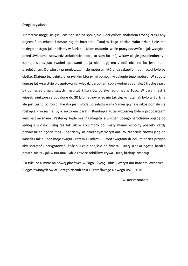 Drogi Krystianie Nareszcie mogę usiąść i cos napisać na spokojnie i oczywiście znalazłem trochę czasu aby pojechać do miasta i dostać się do internetu. Tutaj w Togo bardzo słabo działa i nie ma takiego dostępu jak mieliśmy w Burkina . Mam ostatnio wiele pracy oczywiście jak wszędzie przed Świętami spowiedź ,rekolekcje robię to sam bo mój wikary ciągle jest nieobecny i zajmuje się często swoimi sprawami a ja nie mogę mu zrobić nic no bo jest moim przełożonym. Do wiosek przemieszczam się motorem który już zakupiłem bo inaczej było by ciężko. Dlatego tez dziękuje wszystkim którzy mi pomogli w zakupie tego motoru. W sobotę kończę już wszystkie przygotowania wiec dziś zrobiłem sobie wolne aby znaleźć trochę czasu by pomyśleć o najbliższych i napisać kilka słów co słychać u nas w Togo. W parafii jest 8 wiosek niektóre są oddalone do 20 kilometrów wiec nie tak ciężko tutaj jak było w Burkina ale jest tez tu co robić . Parafia jest młoda bo zaledwie ma 5 miesięcy ale jakoś pomału się rozkręca - wcześniej była sektorem parafii Bombajka gdzie wcześniej byłem proboszczem wiec jest mi znana . Pasterkę będę miał na miejscu a w dzień Bożego narodzenia pojadę do jednej z wiosek .Tutaj tez tak jak w Korsimoro po mszy mamy wspólny posiłek- każdy przyniesie co będzie mógł - będziemy się dzielić tym wszystkim . W Niedziele znowu jadę do wiosek i takie Beda moje święta - razem z Ludźmi - Przed świętami dzieci i młodzież przyjdą aby sprzątać i przygotować kościół i cale obejście na święta . Tutaj szopka będzie bardzo prosta nie tak jak w Burkina .Gdzie zawsze robiliśmy zżywa - tutaj brakuje zwierząt. To tyle co u mnie na nowej placówce w Togo. Życzę Tobie i Wszystkim Braciom Wesołych i Błogosławionych Świat Bożego Narodzenia i Szczęśliwego Nowego Roku 2016. O. JurzystaRobert .