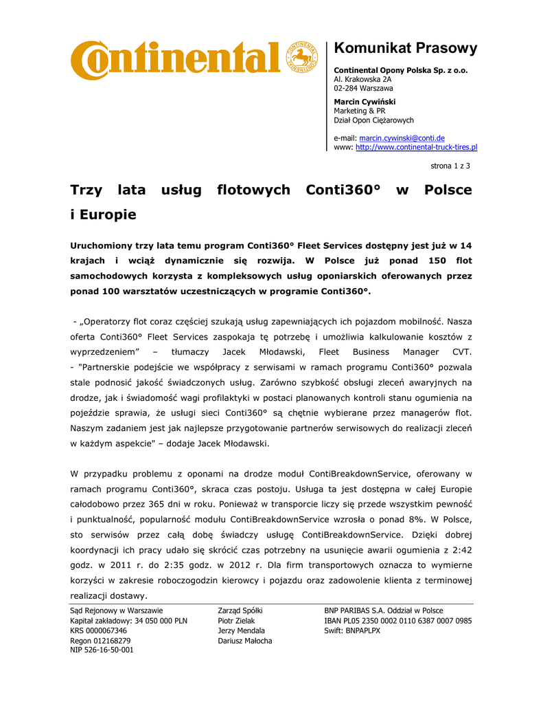 Komunikat Prasowy Continental Opony Polska Sp. z o.o. Al. Krakowska 2A 02-284 Warszawa Marcin Cywiński Marketing & PR Dział Opon Ciężarowych e-mail: [email protected] www: http://www.continental-truck-tires.pl strona 1 z 3 Trzy lata usług flotowych Conti360° w Polsce i Europie Uruchomiony trzy lata temu program Conti360° Fleet Services dostępny jest już w 14 krajach i wciąż dynamicznie się rozwija. W Polsce już ponad 150 flot samochodowych korzysta z kompleksowych usług oponiarskich oferowanych przez ponad 100 warsztatów uczestniczących w programie Conti360°. - „Operatorzy flot coraz częściej szukają usług zapewniających ich pojazdom mobilność. Nasza oferta Conti360° Fleet Services zaspokaja tę potrzebę i umożliwia kalkulowanie kosztów z wyprzedzeniem” – tłumaczy Jacek Młodawski, Fleet Business Manager CVT. - "Partnerskie podejście we współpracy z serwisami w ramach programu Conti360° pozwala stale podnosić jakość świadczonych usług. Zarówno szybkość obsługi zleceń awaryjnych na drodze, jak i świadomość wagi profilaktyki w postaci planowanych kontroli stanu ogumienia na pojeździe sprawia, że usługi sieci Conti360° są chętnie wybierane przez managerów flot. Naszym zadaniem jest jak najlepsze przygotowanie partnerów serwisowych do realizacji zleceń w każdym aspekcie" – dodaje Jacek Młodawski. W przypadku problemu z oponami na drodze moduł ContiBreakdownService, oferowany w ramach programu Conti360°, skraca czas postoju. Usługa ta jest dostępna w całej Europie całodobowo przez 365 dni w roku. Ponieważ w transporcie liczy się przede wszystkim pewność i punktualność, popularność modułu ContiBreakdownService wzrosła o ponad 8%. W Polsce, sto serwisów przez całą dobę świadczy usługę ContiBreakdownService. Dzięki dobrej koordynacji ich pracy udało się skrócić czas potrzebny na usunięcie awarii ogumienia z 2:42 godz. w 2011 r. do 2:35 godz. w 2012 r. Dla firm transportowych oznacza to wymierne korzyści w zakresie roboczogodzin kierowcy i pojazdu oraz zadowolenie klienta z terminowej realizacji dostawy. Sąd Rejonowy w Warszawie Kapitał zakładowy: 34 050 000 PLN KRS 0000067346 Regon 012168279 NIP 526-16-50-001 Zarząd Spółki Piotr Zielak Jerzy Mendala Dariusz Małocha BNP PARIBAS S.A. Oddział w Polsce IBAN PL05 2350 0002 0110 6387 0007 0985 Swift: BNPAPLPX Komunikat Prasowy Continental Opony Polska Sp. z o.o. Al. Krakowska 2A 02-284 Warszawa Marcin Cywiński Marketing & PR Dział Opon Ciężarowych e-mail: [email protected] www: http://www.continental-truck-tires.pl strona 2 z 3 W ramach usługi ContiFleetCheck klienci mogą zdecydować się na powierzenie specjalistom Conti360° monitorowania zużycia opon przez cały okres eksploatacji aż do planowanego zakupu nowych. Moduł ContiFleetCheck pokazuje zachodzące zmiany w stanie zużycia i kondycji opon w czasie eksploatacji oraz dokumentuje podjęte działania w ramach bieżącej obsługi. ContiFleetReporting archiwizuje dla klienta wszystkie dane dotyczące opon, raporty stanu i analizy kosztów oraz zapewnia przejrzystość rozliczeń. Natomiast ContiCasingManagement to moduł obejmujący odbiór, kontrolę i zwrot zużytych opon do bieżnikowania lub recyclingu po zakończeniu ich pierwszego życia. Wraz z rozwojem sieci zwiększa się również ilość klientów i zrealizowanych zleceń. Sprzedaż opon w kanale flotowym rośnie dynamicznie, mimo ponad 20% spadku obrotów na rynku opon ciężarowych w 2012 r. W ubiegłym roku kilkadziesiąt nowych firm podpisało umowy z siecią Conti360°. Łącznie wykonano dla nich ponad 4 tys. zleceń. Zdecydowana większość odbyła się planowo w warsztacie, a tylko ponad 300 na drodze. - „Zależy nam na bezpieczeństwie na drogach, dlatego niezależnie od typu i marki opon zamontowanych na pojeździe, zapewniamy regularne sprawdzanie ogumienia przed wyruszeniem w trasę. Dzięki temu nasi klienci unikają wszystkich konsekwencji usuwania skutków awarii na drodze” - zapewnia Jacek Młodawski. Zdjęcia: - ContiFitmentService - ContiBreakdownService. Continental AG Z osiągniętymi w 2012 roku obrotami w wysokości 32,7 miliardów € Continental jest jednym z wiodących dostawców motoryzacyjnych na świecie. Oferując układy hamulcowe, urządzenia i komponenty zespołów napędowych i podwozi, zestawy wskaźników, systemy informatyczne i rozrywkowe, podzespoły elektroniczne, opony oraz elastomery techniczne, firma Continental znacząco przyczynia się do poprawy bezpieczeństwa na drogach oraz chroni globalny klimat. Continental posiada również znaczące doświadczenie jako partner w dziedzinie sieciowej komunikacji samochodowej. Firma Continental zatrudnia obecnie około 170.000 pracowników w 46 krajach. www.continental-corporation.com Sąd Rejonowy w Warszawie Kapitał zakładowy: 34 050 000 PLN KRS 0000067346 Regon 012168279 NIP 526-16-50-001 Zarząd Spółki Piotr Zielak Jerzy Mendala Dariusz Małocha BNP PARIBAS S.A. Oddział w Polsce IBAN PL05 2350 0002 0110 6387 0007 0985 Swift: BNPAPLPX Komunikat Prasowy Continental Opony Polska Sp. z o.o. Al. Krakowska 2A 02-284 Warszawa Marcin Cywiński Marketing & PR Dział Opon Ciężarowych e-mail: [email protected] www: http://www.continental-truck-tires.pl strona 3 z 3 Dział Opon Jako jeden z wiodących producentów opon na świecie, zatrudniający ponad 42.000 pracowników, Dział Opon osiągnął w 2012 roku sprzedaż ogółem w wysokości ponad 9,7 mld €. Obecnie Dział Opon posiada na całym świecie 22 zakłady zajmujące się produkcją i rozwojem. Szeroka oferta produktów Działu oraz stałe inwestycje w badania i rozwój w znaczący sposób przyczyniają się do osiągnięcia efektywnej pod względem kosztowym i wydajnej ekologicznie mobilności. Opony do pojazdów ciężarowych Dział Opony do Pojazdów Ciężarowych jest jednym z największych producentów opon do samochodów ciężarowych, autobusów i pojazdów przemysłowych n