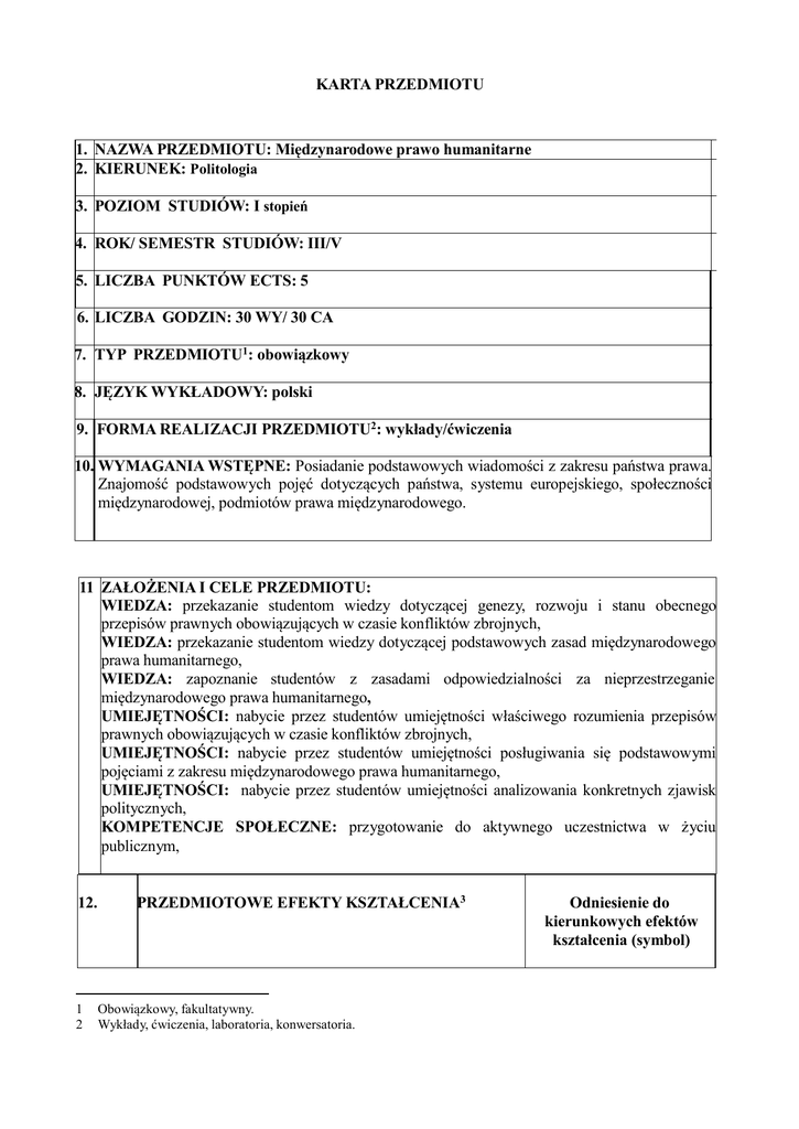 KARTA PRZEDMIOTU 1. NAZWA PRZEDMIOTU: Międzynarodowe prawo humanitarne 2. KIERUNEK: Politologia 3. POZIOM STUDIÓW: I stopień 4. ROK/ SEMESTR STUDIÓW: III/V 5. LICZBA PUNKTÓW ECTS: 5 6. LICZBA GODZIN: 30 WY/ 30 CA 7. TYP PRZEDMIOTU1: obowiązkowy 8. JĘZYK WYKŁADOWY: polski 9. FORMA REALIZACJI PRZEDMIOTU2: wykłady/ćwiczenia 10. WYMAGANIA WSTĘPNE: Posiadanie podstawowych wiadomości z zakresu państwa prawa. Znajomość podstawowych pojęć dotyczących państwa, systemu europejskiego, społeczności międzynarodowej, podmiotów prawa międzynarodowego. 11 ZAŁOŻENIA I CELE PRZEDMIOTU: WIEDZA: przekazanie studentom wiedzy dotyczącej genezy, rozwoju i stanu obecnego przepisów prawnych obowiązujących w czasie konfliktów zbrojnych, WIEDZA: przekazanie studentom wiedzy dotyczącej podstawowych zasad międzynarodowego prawa humanitarnego, WIEDZA: zapoznanie studentów z zasadami odpowiedzialności za nieprzestrzeganie międzynarodowego prawa humanitarnego, UMIEJĘTNOŚCI: nabycie przez studentów umiejętności właściwego rozumienia przepisów prawnych obowiązujących w czasie konfliktów zbrojnych, UMIEJĘTNOŚCI: nabycie przez studentów umiejętności posługiwania się podstawowymi pojęciami z zakresu międzynarodowego prawa humanitarnego, UMIEJĘTNOŚCI: nabycie przez studentów umiejętności analizowania konkretnych zjawisk politycznych, KOMPETENCJE SPOŁECZNE: przygotowanie do aktywnego uczestnictwa w życiu publicznym, 12. 1 2 PRZEDMIOTOWE EFEKTY KSZTAŁCENIA3 Obowiązkowy, fakultatywny. Wykłady, ćwiczenia, laboratoria, konwersatoria. Odniesienie do kierunkowych efektów kształcenia (symbol) WIEDZA P_W 01 Ma podstawową wiedzę o historycznych, ekonomicznych, społecznych K_W03, K_W04,K_W06 P_W 02 Zna i rozumie podstawowe zasady funkcjonowania życia politycznego oraz rolę instytucji państwowych i społecznych. K_W04, K_W05, K_W06 P_W03 Posiada podstawową wiedzę o zasadach demokracji i formach K_W07,K_W13, K_W15 i kulturowych uwarunkowaniach życia politycznego. Zna i rozumie relacje zachodzące między strukturami społecznymi a otoczeniem. uczestnictwa w życiu społecznym i politycznym. Zna i rozumie podstawowe mechanizmy rządzenia i podejmowania decyzji politycznych. P_W 04 Zna podstawową terminologię z zakresu polityki. K_W13, K_W14 UMIEJĘTNOŚCI P_U 01 Dostrzega podstawowe relacje między polityką a zjawiskami historycznymi, ideologicznymi, ekonomicznymi, społecznymi, kulturowymi. Potrafi prawidłowo je interpretować i dostrzegać powiązania między nimi. P_U 02 Potrafi aktywnie i świadomie uczestniczyć w życiu społecznopolitycznym oraz w dyskursie publicznym. P_U 03 Potrafi analizować i wyjaśniać podstawowe mechanizmy funkcjonowania instytucji i organizacji politycznych, społecznych oraz potrafi dokonać analizy podstawowych zjawisk politycznych . K_U01, K_U02, K_05,K_06, K_U11 K_U04, K_U05 K_U05, K_U06,K_U07, K_U12, K_U14 KOMPETENCJE SPOŁECZNE P_K 01 Jest przygotowany do aktywności w sferze publicznej, uznaje i szanuje K_K01, K_K04,K_K08 P_K 02 Ma K_K09, K_K10, K_K12, K_K13 różne punkty widzenia. zdolność kreatywnego rozwiązywania problemów, umie komunikować się z otoczeniem, jest świadomy znaczenia dziedzictwa historycznego, kulturowego i społecznego . 13. METODY OCENY EFEKTÓW KSZTAŁCENIA Symbol przedmiotowego efektu kształcenia 3 4 Metody (sposoby) oceny4 Typ oceny5 Forma dokumentacji Efekty kształcenia w zakresie wiedzy (P_W), umiejętności (P_U) i kompetencji społecznych (P_K). Ocenianie ciągłe (bieżące przygotowanie do zajęć), śródsemestralne zaliczenie pisemne, śródsemestralne zaliczenie ustne, końcowe zaliczenia pisemne, końcowe zaliczenia ustne, egzamin pisemny, egzamin ustny, praca semestralna, ocena umiejętności ruchowych, praca dyplomowa, projekt, kontrola obecności 5 Formująca, podsumowująca. P_W01, P_W02, P_W03, P_W04, P_U01,P_U02, P_U03 P_K01, P_K02 W zakresie CA: ocenianie P_W01, P_W02, P_W03, P_W04, P_U01, P_U02, P_U03, P_K01, P_K02 W zakresie WY: egzamin ustny Podsumowująca Egzamin w formie Formująca i Referaty, punkty za ciągłe (bieżące przygotowanie podsumowująca udział w dyskusji, lista do zajęć), końcowe zaliczenia obecności. ustne. ustnej 14. KRYTERIA OCENY OSIĄGNIĘTYCH EFEKTÓW KSZTAŁCENIA Kryterium opisowe Ocena Kryteria opisowe oceny osiągniętych efektów kształcenia 2 (ndst) Student nie opanował treści programowych przedmiotu i nie zrealizował zakładanych przedmiotowych efektów kształcenia. Nie rozumie podstawowych kategorii ani pojęć. Nie jest w stanie wyjaśnić istoty i przyczyn podstawowych dla przedmiotu zjawisk i procesów. Nie potrafi wykorzystać ich do analizy omawianych zagadnień, nie podejmuje także dyskusji na temat ich miejsca i roli w kontekście specyfiki przedmiotu. 3 (dost) Student opanował podstawowe treści programowe przedmiotu oraz zrealizował w niewielkim zakresie zakładane przedmiotowe efekty kształcenia. Poprawnie definiuje, przynajmniej na jeden z możliwych sposobów, podstawowe kategorie i pojęcia oraz potrafi je wykorzystać do analizy omawianych zjawisk i procesów. Potrafi podać różnicę między nimi, wyjaśnić przyczynę najważniejszych zjawisk. Wykazuje małe zainteresowanie problematyką analizowaną w ramach przedmiotu. Nie podejmuje dyskusji na omawiane tematy. 3+(dost+) Student opanował treści programowe przedmiotu oraz zrealizował zakładane przedmiotowe efekty kształcenia na poziomie poprawnym. Definiuje podstawowe kategorie i pojęcia oraz najważniejsze ujęcia teoretyczne. Umie dostrzec złożoność relacji między nimi, nie potrafi jednak wytłumaczyć ich pochodzenia. Potrafi poprawnie zastosować tę wiedzę do analizy omawianych zagadnień. Wykazuje rosnące zainteresowanie problematyką analizowaną w ramach przedmiotu, włącza się do dyskusji na ten temat. 4 (db) Student opanował treści programowe przedmiotu oraz zrealizował zakładane przedmiotowe efekty kształcenia. Definiuje kate