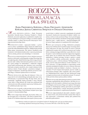 Rodzina Proklamacja dla świata M Rada Prezydenta Kościoła i Rada Dwunastu Apostołów Kościoła Jezusa Chrystusa Świętych w Dniach Ostatnich y, Rada Prezydenta Kościoła i Rada Dwunastu Apostołów Kościoła Jezusa Chrystusa Świętych w Dniach Ostatnich, uroczyście ogłaszamy, że małżeństwo między mężczyzną i kobietą jest wyświęcone od Boga i że rodzina zajmuje centralne miejsce w planie Stworzyciela dotyczącym wiecznego przeznaczenia Jego dzieci. swoich dzieci w miłości i prawości, zaspokajania ich potrzeb fizycznych i duchowych, nauczania ich miłości i służby wzajemnej, zachowywania przykazań Boga i bycia przestrzegającymi prawa obywatelami, niezależnie od tego gdzie mieszkają. Mężowie i żony — matki i ojcowie — staną przed Bogiem, aby być przez Niego osądzeni za wypełnienie tych zobowiązań. Wszystkie istoty ludzkie — mężczyźni i kobiety — są stwo- Rodzina jest wyświęcona od Boga. Małżeństwo pomiędzy rzone na obraz i podobieństwo Boga. Każdy jest umiłowanym synem lub córką niebiańskich rodziców, i dlatego każdy posiada boską naturę i przeznaczenie. Płeć stanowi zasadniczą cechę tożsamości i celu istnienia każdej osoby w jej życiu przed przyjściem na ziemię, podczas życia ziemskiego i w wieczności. Podczas życia przed przyjściem na świat, duchowi synowie i duchowe córki znały i czciły Boga jako swojego Wiecznego Ojca i przyjęły Jego plan, dzięki któremu Jego dzieci mogą otrzymać fizyczne ciało i zdobyć doświadczenia podczas życia na ziemi, aby czynić postępy ku doskonałości i ostatecznie osiągnąć swoje boskie przeznaczenie jako dziedzice życia wiecznego. Boski plan szczęścia umożliwia, aby związki rodzinne trwały nadal po śmierci. Święte obrzędy i przymierza dostępne w świętych świątyniach, umożliwiają ludziom powrót do obecności Boga, a rodzinom zjednoczenie na wieczność. Pierwsze przykazanie, jakie Bóg dał Adamowi i Ewie, na- wiązywało do ich rodzicielskiego potencjału jako mąż i żona. Oświadczamy, że przykazanie Boga dla Jego dzieci, aby się rozmnażały i zapełniały ziemię, pozostaje w mocy. Oświadczamy także, iż Bóg nakazał, aby święta moc prokreacji była wykorzystywana tylko pomiędzy mężczyzną i kobietą, prawnie zaślubionymi jako mąż i żona. Oświadczamy, że sposób, w jaki powstaje życie na ziemi, jest ustanowiony przez Boga. Potwierdzamy świętość życia i jego ważność w wiecznym planie Boga. Mąż i żona mają święty obowiązek, aby kochać i dbać o sie- bie nawzajem oraz o swoje dzieci. „Oto dzieci są darem Pana” (Psalm 127:3). Rodzice mają święty obowiązek wychowywania mężczyzną i kobietą stanowi podstawę Jego wiecznego planu. Dzieci mają prawo do tego, aby przyjść na świat w prawnie zaślubionym związku i być wychowywane przez ojca i matkę, którzy szanują przysięgę małżeńską i są jej całkowicie wierni. Szczęście w życiu rodzinnym może być najpewniej osiągnięte, kiedy opiera się na naukach Pana Jezusa Chrystusa. Udane małżeństwa i rodziny powstają i trwają w oparciu o zasady wiary, modlitwy, pokuty, przebaczenia, szacunku, miłości, współczucia, pracy i zdrowej rekreacji. Według boskiego zamysłu, ojcowie mają przewodniczyć swoim rodzinom w miłości i prawości, i są odpowiedzialni za zapewnienie swoim rodzinom niezbędnych środków do życia i ochrony. Głównym obowiązkiem matek jest dbałość o duchowy i fizyczny rozwój dzieci. W tych świętych obowiązkach, ojcowie i matki, są zobowiązani pomagać sobie wzajemnie, jako równi partnerzy. Niepełnosprawność, śmierć lub inne okoliczności mogą wymagać przystosowania do konkretnej sytuacji. W razie potrzeby powinna służyć pomocą dalsza rodzina. Ostrzegamy te osoby, które łamią przymierze czystości, które molestują współmałżonka albo potomstwo, lub które nie wypełniają swoich obowiązków rodzinnych, pewnego dnia staną przed Bogiem, aby być przez Niego za to sądzeni. Ostrzegamy ponadto, że dezintegracja rodziny sprowadzi na poszczególnych ludzi, społeczeństwa i narody nieszczęścia przepowiedziane przez starożytnych i współczesnych proroków. Wzywamy odpowiedzialnych obywateli i członków rządów na całym świecie, aby promowali takie zasady, które mają na celu zachowanie i wzmacnianie rodziny jako podstawowej jednostki społeczeństwa. Ta proklamacja została przeczytana przez prezydenta Gordona B. Hinckleya jako część jego przesłania podczas Generalnego Spotkania Stowarzyszenia Pomocy, 23 września 1995 roku w Salt Lake City, Utah.