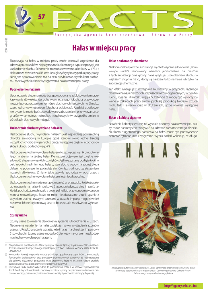 57 PL ISSN 1681-2123 E u r o p e j s k a A g e n c j a B e z p i e c z e ń s t w a i Z d r o w i a w P r a c y Hałas w miejscu pracy Ekspozycja na hałas w miejscu pracy może stanowić zagrożenie dla zdrowia pracowników. Najczęstszym skutkiem tego typu ekspozycji jest uszkodzenie słuchu. Schorzenie to zaobserwowano u kotlarzy w 1731 r. Hałas może również nasilić stres i zwiększyć ryzyko wypadku przy pracy. Niniejsze opracowanienie ma na celu przybliżenie czytelnikom problemu możliwych skutków występowania hałasu w miejscu pracy. Upośledzenie słyszenia Upośledzenie słyszenia może być spowodowane zablokowaniem przekazywania dźwięków do ucha wewnętrznego (głuchota przewodzeniowa) lub uszkodzeniem komórek słuchowych rzęsatych w ślimaku, części ucha wewnętrznego (głuchota odbiorcza). Rzadziej upośledzenie słyszenia może być spowodowane zaburzeniami przetwarzania sygnałów w centralnych ośrodkach słuchowych (w przypadku zmian w ośrodkach słuchowych mózgu). Uszkodzenie słuchu wywołane hałasem Uszkodzenie słuchu wywołane hałasem jest najbardziej powszechną chorobą zawodową w Europie, gdyż stanowi około jednej trzeciej wszystkich chorób związanych z pracą. Występuje częściej niż choroby skóry i układu oddechowego (1). Hałas a substancje chemiczne Niektóre niebezpieczne substancje są ototoksyczne (dosłownie „zatruwające słuch”). Pracownicy narażeni jednocześnie na niektóre z tych substancji oraz głośny hałas ryzykują uszkodzeniem słuchu w większym stopniu niż ci, którzy są narażeni tylko na hałas lub tylko na substancje chemiczne. Ten efekt synergii jest szczególnie zauważalny w przypadku łącznego działania hałasu i niektórych rozpuszczalników organicznych, w tym toluenu, styrenu i disiarczku węgla. Substancje te mogą być wykorzystywane w zakładach pracy zajmujących się produkcją tworzyw sztucznych, farb i lakierów oraz w drukarniach, gdzie również występuje hałas. Hałas a kobiety ciężarne Narażenie kobiety ciężarnej na wysokie poziomy hałasu w miejscu pracy może niekorzystnie wpływać na zdrowie nienarodzonego dziecka. Skutkiem długotrwałego narażenia na hałas może być podwyższone ciśnienie tętnicze krwi i zmęczenie. Wyniki badań wskazują, że długo- Uszkodzenie słuchu wywołane hałasem to zazwyczaj wynik długotrwałego narażenia na głośny hałas. Pierwszym objawem jest zwykle niezdolność słyszenia wysokich dźwięków. Jeśli nie zostaną podjęte kroki w celu redukcji nadmiernego hałasu, stan słuchu osoby narażonej ulega dalszemu pogorszeniu, pojawiąją się również trudności ze słyszeniem niższych dźwięków. Zmiany takie zwykle zachodzą w obu uszach. Uszkodzenie słuchu wywołane hałasem jest nieodwracalne. Uszkodzenie słuchu może nastąpić również w przypadku krótkotrwałego narażenia na hałasy impulsowe (nawet pojedynczy silny impuls), takie jak pochodzące od strzału z broni palnej lub pracy pneumatycznego młotka nitowniczego. Może to mieć nieodwracalne skutki, łącznie z ubytkiem słuchu i trwałymi szumami w uszach. Impulsy mogą również rozerwać błonę bębenkową. Jest to bolesne, ale możliwe do wyleczenia. Szumy uszne Szumy uszne to wrażenie dzwonienia, syczenia lub dudnienia w uszach. Nadmierne narażenie na hałas zwiększa ryzyko wystąpienia szumów usznych. Ryzyko znacznie wzrasta, jeżeli hałas ma charakter impulsowy (np. wybuch). Szumy uszne mogą być pierwszym sygnałem uszkodzenia słuchu wywołanego hałasem. (1) Na podstawie publikacji pt.: „Dane opisujące czynnik łączący zagadnienia BHP i możliwości zatrudnienia”, Europejska Agencja Bezpieczeństwa i Zdrowia w Pracy, 2002, ISBN 92-95007-66-2. (2) Komunikat Komisji w sprawie wytycznych dotyczących oceny czynników chemicznych, fizycznych i biologicznych oraz procesów przemysłowych uznanych za niebezpieczne dla zdrowia ciężarnych pracownic oraz pracownic, które w ostatnim czasie urodziły dziecko lub karmią piersią (dyrektywa Rady 92/85/EWG). (3) Dyrektywa Rady 92/85/EWG z dnia 19 października 1992 r. w sprawie wprowadzenia środków służących wspieraniu poprawy w miejscu pracy bezpieczeństwa i zdrowia pracownic w ciąży, pracownic, które niedawno rodziły i pracownic karmiących piersią „Hałas”, plakat autorstwa Anety Sedlakowej. Dzięki uprzejmości organizatora konkursu na plakat promujący bezpieczeństwo w miejscu pracy – Centralnego Instytutu Ochrony Pracy – Państwowego Instytutu Badawczego, Polska. http://agency.osha.eu.int FA C T S 57 rowcę lub operatora maszyny budowlanej na placu budowy, co może doprowadzić do wypadku. Zwiększone ryzyko wypadków W dyrektywie dotyczącej hałasu (4) jest mowa między innymi o związku między hałasem a wypadkami oraz o wymogu uwzględniania tego związku, szczególnie przy dokonywaniu oceny ryzyka związanego z hałasem. i sygnałów, ˛ maskuje dźwięk zbliżającego się niebezpieczeństwa lub sygna- ˛ pogłębia stres związany z pracą, który, zwiększając obciążenie poznawcze, zwiększa prawdopodobieństwo popełnienia błędów. Zakłócenie komunikacji słownej Skuteczna komunikacja ma zasadnicze znaczenie w miejscu pracy, niezależnie od tego, czy jest to fabryka, plac budowy, centrum obsługi telefonicznej czy szkoła. Dobra komunikacja werbalna (5) zachodzi wtedy, gdy poziom dźwięku przy uchu słuchacza jest o co najmniej 10 dB wyższy od poziomu hałasu otoczenia (tła). Otaczający hałas jest bardzo często odczuwany jako wyraźne zakłócenie komunikacji słownej, szczególnie w przypadkach gdy: ˛ hałas otoczenia występuje często, ˛ słuchacz ma już nieznacznie uszkodzony słuch, ˛ komunikat słowny jest w innym języku niż język ojczysty słuchacza , ˛ stan fizyczny lub psychiczny słuchacza jest zakłócony z uwagi na zły stan zdrowia, zmęczenie lub zwiększone obciążenie pracą pod presją czasu. Wpływ powyższych czynników na b
