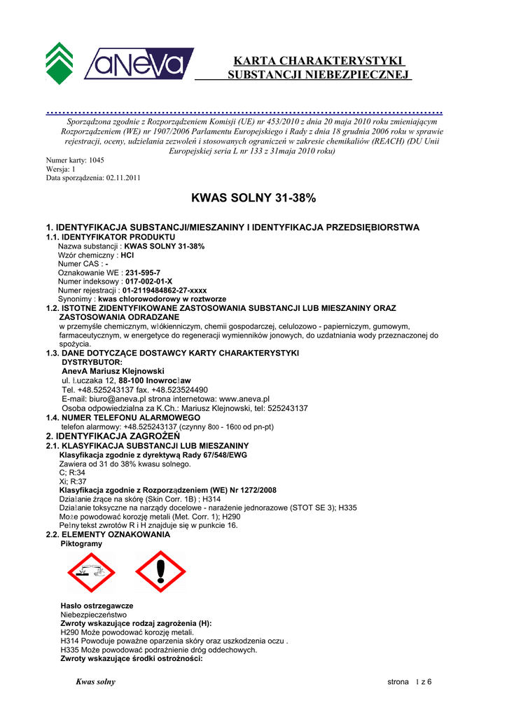 KARTA CHARAKTERYSTYKI SUBSTANCJI NIEBEZPIECZNEJ ………………………………………………………………………………………. Sporządzona zgodnie z Rozporządzeniem Komisji (UE) nr 453/2010 z dnia 20 maja 2010 roku zmieniającym Rozporządzeniem (WE) nr 1907/2006 Parlamentu Europejskiego i Rady z dnia 18 grudnia 2006 roku w sprawie rejestracji, oceny, udzielania zezwoleń i stosowanych ograniczeń w zakresie chemikaliów (REACH) (DU Unii Europejskiej seria L nr 133 z 31maja 2010 roku) Numer karty: 1045 Wersja: 1 Data sporządzenia: 02.11.2011 KWAS SOLNY 31-38% 1. IDENTYFIKACJA SUBSTANCJI/MIESZANINY I IDENTYFIKACJA PRZEDSIĘBIORSTWA 1.1. IDENTYFIKATOR PRODUKTU Nazwa substancji : KWAS SOLNY 31-38% Wzór chemiczny : HCl Numer CAS : Oznakowanie WE : 231-595-7 Numer indeksowy : 017-002-01-X Numer rejestracji : 01-2119484862-27-xxxx Synonimy : kwas chlorowodorowy w roztworze 1.2. ISTOTNE ZIDENTYFIKOWANE ZASTOSOWANIA SUBSTANCJI LUB MIESZANINY ORAZ ZASTOSOWANIA ODRADZANE w przemyśle chemicznym, włókienniczym, chemii gospodarczej, celulozowo - papierniczym, gumowym, farmaceutycznym, w energetyce do regeneracji wymienników jonowych, do uzdatniania wody przeznaczonej do spożycia. 1.3. DANE DOTYCZĄCE DOSTAWCY KARTY CHARAKTERYSTYKI DYSTRYBUTOR: AnevA Mariusz Klejnowski ul. Łuczaka 12, 88-100 Inowrocław Tel. +48.525243137 fax. +48.523524490 E-mail: [email protected] strona internetowa: www.aneva.pl Osoba odpowiedzialna za K.Ch.: Mariusz Klejnowski, tel: 525243137 1.4. NUMER TELEFONU ALARMOWEGO telefon alarmowy: +48.525243137 (czynny 800 - 1600 od pn-pt) 2. IDENTYFIKACJA ZAGROŻEŃ 2.1. KLASYFIKACJA SUBSTANCJI LUB MIESZANINY Klasyfikacja zgodnie z dyrektywą Rady 67/548/EWG Zawiera od 31 do 38% kwasu solnego. C; R:34 Xi; R:37 Klasyfikacja zgodnie z Rozporządzeniem (WE) Nr 1272/2008 Działanie żrące na skórę (Skin Corr. 1B) ; H314 Działanie toksyczne na narządy docelowe - naraźenie jednorazowe (STOT SE 3); H335 Może powodować korozję metali (Met. Corr. 1); H290 Pełny tekst zwrotów R i H znajduje się w punkcie 16. 2.2. ELEMENTY OZNAKOWANIA Piktogramy Hasło ostrzegawcze Niebezpieczeństwo Zwroty wskazujące rodzaj zagrożenia (H): H290 Może powodować korozję metali. H314 Powoduje poważne oparzenia skóry oraz uszkodzenia oczu . H335 Może powodować podrażnienie dróg oddechowych. Zwroty wskazujące środki ostrożności: Kwas solny strona 1 z 6 KARTA CHARAKTERYSTYKI SUBSTANCJI NIEBEZPIECZNEJ ………………………………………………………………………………………. P260 Nie wdychać pyłu/dymu/gazu/mgły/par/rozpylonej cieczy. P303+361+353 W PRZYPADKU KONTATKU ZE SKÓRĄ (lub z włosami): Natychmiast usunąć/zdjąć całą zanieczyszczoną odzież. Spłukać skórę pod strumieniem wody/prysznicem. P304+341 W PRZYPADKU DOSTANIA SIĘ DO DRÓG ODDECHOWYCH: W przypadku trudności z oddychaniem, wyprowadzić lub wynieść poszkodowanego na świeże powietrze i zapewnić warunki do odpoczynku w pozycji umożliwiającej swobodne oddychanie. P305+351+338 W PRZYPADKU DOSTANIA SIĘ DO OCZU: Ostrożnie płukać wodą przez kilka minut. Wyjąć soczewki kontaktowe, jeżeli są i można je łatwo usunąć. Nadal płukać. P309+311 W przypadku narażenia lub złego samopoczucia: Skontaktować się z OŚRODKIEM ZATRUĆ lub z lekarzem. P501.1 Zawartość/pojemnik usuwać zgodnie z krajowymi przepisami. 2.3. INNE ZAGROŻENIA Może gwałtownie reagować z różnymi materiałami (kwasami, metalami nieszlachetnymi) z wydzieleniem substancji niebezpiecznych (wodór). Ocena PBT oraz vPvB: substancja nie jest uważana za trwałą, bioakumulatywną i toksyczną. 3. SKŁAD/INFORMACJA O SKŁADNIKACH 3.1. SUBSTANCJE Nazwa chemiczna KWAS SOLNY 31-38% Numer CAS Oznakowanie WE Numer indeksowy - 231-595-7 017-002-01-X 4. ŚRODKI PIERWSZEJ POMOCY 4.1. OPIS ŚRODKÓW PIERWSZEJ POMOCY - Kontakt z oczami : Płukać oczy co najmniej 15 minut dużą ilością chłodnej wody, najlepiej bieżącej, przy szeroko odchylonej powiece. Unikać silnego strumienia wody ze względu na ryzyko mechanicznego uszkodzenia rogówki. Zapewnić natychmiastową pomoc okulisty. - Kontakt ze skórą : Natychmiast zdjąć zanieczyszczoną odzież, zmyć skórę dużą ilością wody. Zapewnić pomoc lekarza dermatologa. - Wdychanie : Wyprowadzić zatrutego z miejsca narażenia. Zapewnić dostęp świeżego powietrza. Wezwać lekarza. - Połknięcie : Natychmiast wezwać pomoc lekarską. Nie podawać poszkodowanemu nic do picia. Nie prowokować wymiotów (ryzyko perforacji). Nie podejmować prób neutralizacji. Zachować ostrożność przy udzielaniu pierwszej pomocy (substancja żrąca). 4.2. NAJWAŻNIEJSZE OSTRE I OPÓŹNIONE OBJAWY ORAZ SKUTKI NARAŻENIA Skutki zdrowotne narażenia ostrego: Oparzenia skóry, uszkodzenia oczu, nieżyt nosa i podrażnienie krtani, gardła i oskrzeli. Skutki zdrowotne narażenia przewlekłego: Powoduje poważne oparzenia skóry i oczu. 4.3. WSKAZANIA DOTYCZĄCE WSZELKIEJ NATYCHMIASTOWEJ POMOCY LEKARSKIEJ I SZCZEGÓLNEGO POSTĘPOWANIA Z POSZKODOWANYM Zdjąć natychmiast całą skażoną odzież. Płukać skórę/oczy wodą. Odejść w bezpieczne miejsce. 5. POSTĘPOWANIE W PRZYPADKU POŻARU 5.1. ŚRODKI GAŚNICZE Odpowiednie środki gaśnicze: Piasek, piany gaśnicze, woda, dwutlenek węgla. Nieodpowiednie środki gaśnicze: Nie są znane. 5.2. SZCZEGÓLNE ZAGROŻENIA ZWIĄZANE Z SUBSTANCJĄ LUB MIESZANINĄ W przypadku pożaru moga tworzyć się niebezpieczne gazowe produkty lub opary (chlorowodór, chlor). W kontakcie z metalami wydziela się wodór (niebezpieczeństwo eksplozji!). Zbiorniki i pojemniki narażone na działanie ognia lub wysokiej temperatury, o ile to możliwe, usunąć z obszaru zagrożenia; jeżeli nie jest to możliwe - chłodzić pojemniki wodą. 5.3. INFORMACJE DLA STRAŻY POŻARNEJ Przy gaszeniu pożaru należy stosować odzież ochronną i indywidualny aparat do oddychania. 6. POSTĘPOWANIE W PRZYPADKU NIEZAMIERZONEGO UWOLNIENIA