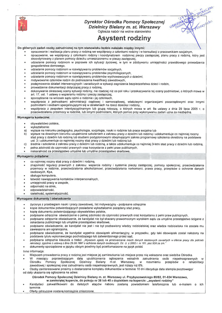Dyrektor Ośrodka Pomocy Społecznej Dzielnicy Bielany m. st. Warszawy O g ła s z a n a b ó r na w o ln e s ta n o w is k o Asystent rodziny Do głównych zadań osoby zatrudnionej na tym stanowisku będzie należało między innymi: • • • • • • • • • • • • • opracowanie i realizacja planu pracy z rodziną w e współpracy z członkami rodziny i w konsultacji z pracownikiem socjalnym, opracowanie, we współpracy z członkam i rodziny i koordynatorem rodzinnej pieczy zastępczej, planu pracy z rodziną, który je s t skoordynowany z planem pom ocy dziecku um ieszczonem u w pieczy zastępczej, udzielanie pomocy rodzinom w poprawie ich sytuacji życiowej, w tym w zdobywaniu umiejętności prawidłowego prowadzenia gospodarstwa domowego, udzielanie pomocy rodzinom w rozwiązywaniu problem ów socjalnych, udzielanie pomocy rodzinom w rozwiązywaniu problem ów psychologicznych, udzielanie pomocy rodzinom w rozwiązywaniu problem ów w ychowawczych z dziećmi, m otywowanie członków rodzin do podnoszenia kwalifikacji zawodowych, podejmowanie działań interwencyjnych i zaradczych w sytuacji zagrożenia bezpieczeństwa dzieci i rodzin, prowadzenie dokum entacji dotyczącej pracy z rodziną, dokonyw anie okresowej oceny sytuacji rodziny, nie rzadziej niż co pół roku i przekazywanie tej oceny podmiotowi, o których mowa w art. 17, ust. 1 ustawy o wspieraniu rodziny i pieczy zastępczej, sporządzanie na wniosek sądu opinii o rodzinie i jej członkach, współpraca z jednostkam i adm inistracji rządowej i sam orządowej, właściwym i organizacjam ipozarządowym i oraz innymi podmiotam i i osobami specjalizującym i się w działaniach na rzecz dziecka i rodziny, współpraca z zespołem interdyscyplinarnym lub grupą roboczą, o których mowa w art. 9a ustawy z dnia 29 lipca 2005 r. o przeciwdziałaniu przem ocy w rodzinie, lub innymi podmiotami, których pom oc przy wykonywaniu zadań uzna za niezbędną. Wymagania konieczne: • • a) b) c) • • obywatelstwo polskie, wykształcenie: wyższe na kierunku pedagogika, psychologia, socjologia, nauki o rodzinie lub praca socjalna lub wyższe na dowolnym kierunku uzupełnione szkoleniem z zakresu pracy z dziećmi lub rodziną i udokum entuje co najmniej roczny staż pracy z dziećmi lub rodziną lub studiam i podyplom owym i obejm ującym i zakres program owy szkolenia określony na podstawie ust. 3 i udokum entuje co najmniej roczny staż pracy z dziećmi lub rodziną lub średnie i szkolenie z zakresu pracy z dziećm i lub rodziną, a także udokum entuje co najmniej 3-Ietni staż pracy z dziećmi lub rodziną, pełna zdolność do czynności prawnych oraz korzystanie z pełni praw publicznych, niekaralność za przestępstwo umyślne lub umyślne przestępstwo skarbowe, Wymagania pożądane: • • • • • • • • co najmniej roczny staż pracy z dziećmi i rodziną, znajom ość regulacji prawnych z zakresu: wsparcia rodziny i system ie pieczy zastępczej, pomocy społecznej, przeciwdziałania przem ocy w rodzinie, przeciwdziałania alkoholizmowi, przeciwdziałania narkomanii, prawa pracy, przepisów o ochronie danych osobowych, Kpa, obsługa komputera, łatwość nawiązywania kontaktów interpersonalnych, um iejętność pracy w zespole, odporność na stres, odpow iedzialność, rzetelność, systematyczność. Wymagane dokumenty i oświadczenia • • • • • • • • • życiorys z przebiegiem nauki i pracy zawodowej, list m otywacyjny - podpisane odręcznie kopie dokum entów potwierdzających posiadane wykształcenie pożądany staż pracy, kopię dokumentu potwierdzającego obywatelstwo polskie, podpisane odręcznie oświadczenie o pełnej zdolności do czynności prawnych oraz korzystaniu z pełni praw publicznych, podpisane odręcznie oświadczenie, że kandydat nie był skazany prawom ocnym wyrokiem sądu za umyślne przestępstwo ścigane z oskarżenia publicznego lub umyślne przestępstwo skarbowe, podpisane oświadczenie, że kandydat nie je st i nie był pozbaw iony władzy rodzicielskiej oraz władza rodzicielska nie została mu zawieszona ani ograniczona, podpisane oświadczenie, że kandydat wypełnia obowiązek alim entacyjny, w przypadku, gdy taki obowiązek został nałożony na podstawie tytułu wykonawczego pochodzącego lub zatwierdzonego przez sąd, podpisana odręcznie klauzula o treści: „Wyrażam zgodę na przetwarzanie moich danych osobowych zawartych w ofercie pracy dla potrzeb rekrutacji, zgodnie z ustawą z dnia 29.08.1997 o ochronie danych osobowych. Dz. U. z 2002 r. nr 101, poz.926 ze zm ." dokum enty sporządzone w języku obcym powinny być przetłum aczone na język polski Inne informacje: • M iejscem prowadzenia pracy z rodziną je st m iejsce jej zam ieszkania lub miejsce przez nią wskazane oraz siedziba Ośrodka. • W m iesiącu poprzedzającym datę upublicznienia ogłoszenia wskaźnik zatrudnienia osób niepełnosprawnych w Ośrodku Pom ocy Społecznej Dzielnicy Bielany m.st. W arszawy, w rozumieniu przepisów o rehabilitacji zawodowej i społecznej oraz zatrudnianiu osób niepełnosprawnych, je st niższy niż 6%. • O soby zainteresowane prosim y o dostarczenie kompletu dokum entów w term inie 10 dni /decyduje data stempla pocztowego/ od daty ukazania się ogłoszenia na adres: Ośrodek Pomocy Społecznej Dzielnicy Bielany m. st. Warszawy ul. Przybyszewskiego 80/82, 01-824 Warszawa, w zamkniętej kopercie, do pokoju nr 38 lub 40 z dopiskiem na kopercie: „asystent rodziny” • • Kandydaci zakwalifikowani do dalszych etapów naboru zostaną powiadomieni telefonicznie lub e-mailem o ich terminie. Oferty odrzucone zostaną kom isyjnie zniszczone._____________________________________________________________________________
