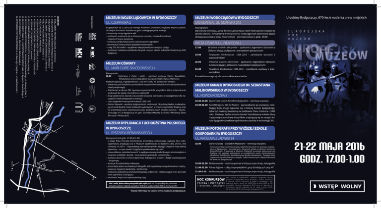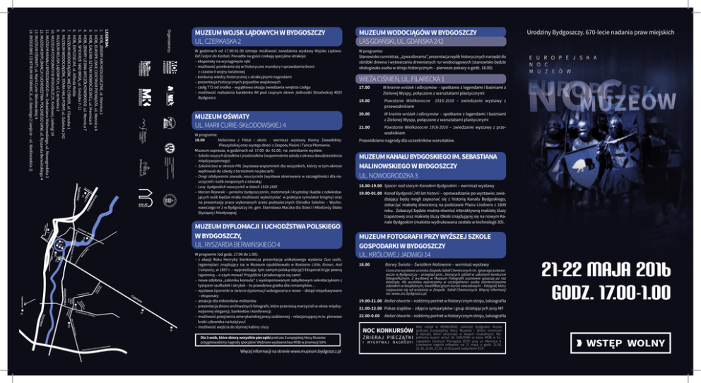Organizatorzy: LEGENDA: 1. MOB, ZBIORY ARCHEOLOGICZNE, ul. Mennica 2 2. MOB, EUROPEJSKIE CENTRUM PIENIĄDZA, ul. Mennica 4 3. MOB, GALERIA SZTUKI NOWOCZESNEJ, ul. Mennica 8 4. MOB, ZBIORY LEONA WYCZÓŁKOWSKIEGO, ul. Mennica 7 5. MOB, SPICHRZE NAD BRDĄ, ul. Grodzka 7-11 6. MOB, EXPLOSEUM, ul. Alfreda Nobla 7. MUZEUM WODOCIĄGÓW, WIEŻA CIŚNIEŃ, ul. Filarecka 1 8. MUZEUM WODOCIĄGÓW, STARA HALA POMP, ul. Gdańska 242 9. MUZEUM WOJSK LĄDOWYCH, ul. Czerkaska 2 10. MUZEUM FOTOGRAFII W BYDGOSZCZY, Królowej Jadwigi 14 11. MUZEUM KANAŁU BYDGOSKIEGO im. Sebastiana Malinowskiego, ul. Nowogrodzka 3 12. MUZEUM DYPLOMACJI I UCHODŹSTWA POLSKIEGO UKW, ul. Ryszarda Berwińskiego 4 13. MUZEUM OŚWIATY, ul. Marii Curie-Skłodowskiej 4 14. BYDGOSKIE CENTRUM INFORMACJI, ul. Batorego 2 (wejście – ul. Niedźwiedzia 1) MUZEUM WOJSK LĄDOWYCH W BYDGOSZCZY UL. CZERKASKA 2 MUZEUM WODOCIĄGÓW W BYDGOSZCZY LAS GDAŃSKI, UL. GDAŃSKA 242 W godzinach od 17.00-01.00 istnieje możliwość zwiedzenia wystawy Wojska Lądowe. Od Cedyni do Karbali. Ponadto na gości czekają specjalne atrakcje: – eksponaty na wyciągnięcie ręki – możliwość przebrania się w historyczne mundury i sprawdzenia broni z czasów II wojny światowej – konkursy wiedzy historycznej z atrakcyjnymi nagrodami – prezentacja historycznych pojazdów wojskowych – czołg T72 od środka – wyjątkowa okazja zwiedzania wnętrza czołgu – możliwość rozłożenia karabinka AK pod czujnym okiem Jednostki Strzeleckiej 4033 Bydgoszcz W programie: Stanowisko rurmistrza, „żywa diorama”, prezentacja replik historycznych narzędzi do obróbki drewna i wytwarzania drewnianych rur wodociągowych (stanowisko będzie obsługiwała osoba w stroju historycznym – pierwsze pokazy o godz. 18.00) MUZEUM OŚWIATY UL. MARII CURIE-SKŁODOWSKIEJ 4 W programie: 18.00 Malarstwo z Pałuk i okolic - wernisaż wystawy Hanny Zawadzkiej-Pleszyńskiej oraz występ dzieci z Zespołu Pieśni i Tańca Płomienie. Muzeum zaprasza, w godzinach od 17.00 do 01.00, na zwiedzanie wystaw: – Szkoła naszych dziadków i pradziadków (wspomnienie szkoły z okresu dwudziestolecia międzywojennego) – Szkolnictwo w okresie PRL (wystawa wspomnień dla wszystkich, którzy w tym okresie wędrowali do szkoły z tornistrem na plecach) – Drogi zdobywania zawodu nauczyciela (wystawa skierowana w szczególności dla nauczycieli i osób związanych z oświatą) – Losy bydgoskich nauczycieli w latach 1939-1945 – Marian Rejewski – genialny bydgoszczanin, matematyk i kryptolog (każda z odwiedzających osób będzie miała możliwość wykorzystać w praktyce symulator Enigmy) oraz na prezentację prace wykonanych przez podopiecznych Ośrodka Szkolno – Wychowawczego nr 2 w Bydgoszczy im. gen. Stanisława Maczka dla Dzieci i Młodzieży Słabo Słyszącej i Niesłyszącej MUZEUM DYPLOMACJI I UCHODŹSTWA POLSKIEGO W BYDGOSZCZY, UL. RYSZARDA BERWIŃSKIEGO 4 W programie (od godz. 17.00 do 1.00): – z okazji Roku Henryka Sienkiewicza prezentacja unikatowego wydania Ouo vadis. (egzemplarz znajdujący się w Muzeum opublikowało w Bostonie Little, Brown, And Company, w 1897 r. – wyprzedzając tym samym polską edycję!) Eksponat kryje pewną tajemnicę – o czym mowa? Przyjdźcie i przekonajcie się sami! – nowa odsłona „saloniku konsula” z wyeksponowanym zabytkowym sekretarzykiem z tysiącem szufladek i skrytek – to prawdziwa gratka dla romantyków… – wystawa Upominki w świecie dyplomacji wzbogacona o nowe – dotąd niepokazywane – eksponaty – atrakcje dla miłośników militariów – prezentacja zbioru archiwalnych fotografii, które przeniosą marzycieli w okres międzywojennej elegancji, bankietów i konferencji. – możliwość przejrzenia amerykańskiej prasy codziennej – relacjonującej m.in. pierwsze kroki człowieka na księżycu! – możliwość wejścia do słynnej kabiny ciszy Dla 3 osób, które zbiorą wszystkie pieczątki podczas Europejskiej Nocy Muzeów przygotowaliśmy nagrody specjalne! Wybrane wydawnictwa MOB w promocji 50% Więcej informacji na stronie www.muzeum.bydgoszcz.pl Urodziny Bydgoszczy. 670-lecie nadania praw miejskich WIEŻA CIŚNIEŃ, UL. FILARECKA 1 17.00 W krainie wróżek i olbrzymów – spotkanie z legendami i baśniami z Zielonej Wyspy, połączone z warsztatami plastycznymi 19.00 Powstanie Wielkanocne przewodnikiem 20.00 W krainie wróżek i olbrzymów – spotkanie z legendami i baśniami z Zielonej Wyspy, połączone z warsztatami plastycznymi 21.00 Powstanie Wielkanocne 1916-2016 – zwiedzanie wystawy z przewodnikiem 1916-2016 – zwiedzanie wystawy z Przewidziano nagrody dla uczestników warsztatów. MUZEUM KANAŁU BYDGOSKIEGO IM. SEBASTIANA MALINOWSKIEGO W BYDGOSZCZY UL. NOWOGRODZKA 3 18.00-19.00 Spacer nad starym Kanałem Bydgoskim – wernisaż wystawy 19.00-01.00 Kanał Bydgoski 240 lat historii – oprowadzanie po wystawie; zwiedzający będą mogli zapoznać się z historią Kanału Bydgoskiego, zobaczyć makietę stworzoną na podstawie Planu Lindnera z 1800 roku. Zobaczyć będzie można również interaktywną makietę śluzy trapezowej oraz makietę śluzy Okole znajdującej się na nowym Kanale Bydgoskim (makieta wydrukowana została w technologii 3D). MUZEUM FOTOGRAFII PRZY WYŻSZEJ SZKOLE GOSPODARKI W BYDGOSZCZY UL. KRÓLOWEJ JADWIGI 14 18.00 Barwy Świata – Światłem Malowane – wernisaż wystawy Coroczna wystawa uczniów Zespołu Szkół Chemicznych im. Ignacego Łukasie- wicza w Bydgoszczy – przegląd prac, biorących udział w szkolnym konkursie fotograficznym. Z wystawą w Muzeum Fotografii uczniowie goszczą po raz dziesiąty. Na wystawę zapraszamy w szczególności osoby zainteresowane udziałem w bezpłatnym, kwalifikacyjnym kursie zawodowym – fotograf, który rozpocznie się od września w Zespole Szkół Chemicznych. Więcej informacji na: www.zsc.bydgoszcz.pl. 19.00-21.00 Atelier otwarte – rodzinny portret w historycznym stroju, luksografia 21.00-22.00 Pokaz slaj