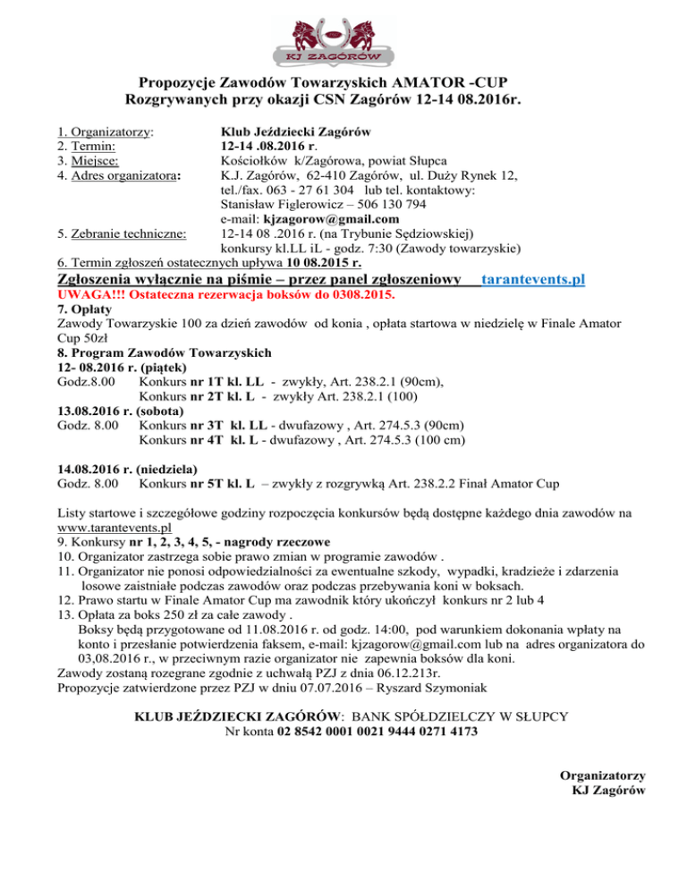 Propozycje Zawodów Towarzyskich AMATOR -CUP Rozgrywanych przy okazji CSN Zagórów 12-14 08.2016r. Klub Jeździecki Zagórów 12-14 .08.2016 r. Kościołków k/Zagórowa, powiat Słupca K.J. Zagórów, 62-410 Zagórów, ul. Duży Rynek 12, tel./fax. 063 - 27 61 304 lub tel. kontaktowy: Stanisław Figlerowicz – 506 130 794 e-mail: [email protected] 5. Zebranie techniczne: 12-14 08 .2016 r. (na Trybunie Sędziowskiej) konkursy kl.LL iL - godz. 7:30 (Zawody towarzyskie) 6. Termin zgłoszeń ostatecznych upływa 10 08.2015 r. 1. Organizatorzy: 2. Termin: 3. Miejsce: 4. Adres organizatora: Zgłoszenia wyłącznie na piśmie – przez panel zgłoszeniowy tarantevents.pl UWAGA!!! Ostateczna rezerwacja boksów do 0308.2015. 7. Opłaty Zawody Towarzyskie 100 za dzień zawodów od konia , opłata startowa w niedzielę w Finale Amator Cup 50zł 8. Program Zawodów Towarzyskich 12- 08.2016 r. (piątek) Godz.8.00 Konkurs nr 1T kl. LL - zwykły, Art. 238.2.1 (90cm), Konkurs nr 2T kl. L - zwykły Art. 238.2.1 (100) 13.08.2016 r. (sobota) Godz. 8.00 Konkurs nr 3T kl. LL - dwufazowy , Art. 274.5.3 (90cm) Konkurs nr 4T kl. L - dwufazowy , Art. 274.5.3 (100 cm) 14.08.2016 r. (niedziela) Godz. 8.00 Konkurs nr 5T kl. L – zwykły z rozgrywką Art. 238.2.2 Finał Amator Cup Listy startowe i szczegółowe godziny rozpoczęcia konkursów będą dostępne każdego dnia zawodów na www.tarantevents.pl 9. Konkursy nr 1, 2, 3, 4, 5, - nagrody rzeczowe 10. Organizator zastrzega sobie prawo zmian w programie zawodów . 11. Organizator nie ponosi odpowiedzialności za ewentualne szkody, wypadki, kradzieże i zdarzenia losowe zaistniałe podczas zawodów oraz podczas przebywania koni w boksach. 12. Prawo startu w Finale Amator Cup ma zawodnik który ukończył konkurs nr 2 lub 4 13. Opłata za boks 250 zł za całe zawody . Boksy będą przygotowane od 11.08.2016 r. od godz. 14:00, pod warunkiem dokonania wpłaty na konto i przesłanie potwierdzenia faksem, e-mail: [email protected] lub na adres organizatora do 03,08.2016 r., w przeciwnym razie organizator nie zapewnia boksów dla koni. Zawody zostaną rozegrane zgodnie z uchwałą PZJ z dnia 06.12.213r. Propozycje zatwierdzone przez PZJ w dniu 07.07.2016 – Ryszard Szymoniak KLUB JEŹDZIECKI ZAGÓRÓW: BANK SPÓŁDZIELCZY W SŁUPCY Nr konta 02 8542 0001 0021 9444 0271 4173 Organizatorzy KJ Zagórów