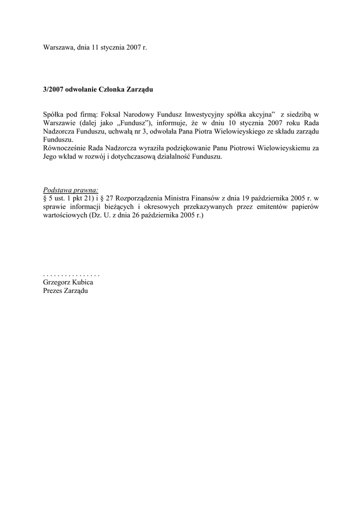 Warszawa, dnia 11 stycznia 2007 r. 3/2007 odwołanie Członka Zarządu Spółka pod firmą: Foksal Narodowy Fundusz Inwestycyjny spółka akcyjna” z siedzibą w Warszawie (dalej jako „Fundusz”), informuje, że w dniu 10 stycznia 2007 roku Rada Nadzorcza Funduszu, uchwałą nr 3, odwołała Pana Piotra Wielowieyskiego ze składu zarządu Funduszu. Równocześnie Rada Nadzorcza wyraziła podziękowanie Panu Piotrowi Wielowieyskiemu za Jego wkład w rozwój i dotychczasową działalność Funduszu. Podstawa prawna: § 5 ust. 1 pkt 21) i § 27 Rozporządzenia Ministra Finansów z dnia 19 października 2005 r. w sprawie informacji bieżących i okresowych przekazywanych przez emitentów papierów wartościowych (Dz. U. z dnia 26 października 2005 r.) ................ Grzegorz Kubica Prezes Zarządu
