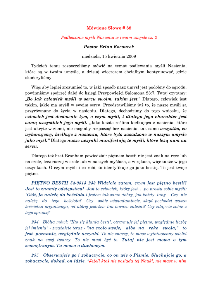 Mówione Słowo # 88 Podlewanie myśli Nasienia w twoim umyśle cz. 2 Pastor Brian Kocourek niedziela, 15 kwietnia 2009 Tydzień temu rozpoczęliśmy mówić na temat podlewania myśli Nasienia, które są w twoim umyśle, a dzisiaj wieczorem chciałbym kontynuować, gdzie skończyliśmy. Więc aby lepiej zrozumieć to, w jaki sposób nasz umysł jest podobny do ogrodu, powinniśmy spojrzeć dalej do księgi Przypowieści Salomona 23:7. Tutaj czytamy: „Bo jak człowiek myśli w sercu swoim, takim jest.” Dlatego, człowiek jest takim, jakie ma myśli w swoim sercu. Przedstawiliśmy już to, że nasze myśli są przyrównane do życia w nasieniu. Dlatego, dochodzimy do tego wniosku, że człowiek jest dosłownie tym, o czym myśli, i dlatego jego charakter jest sumą wszystkich jego myśli. „Jako każda roślina kiełkująca z nasienia, które jest ukryte w ziemi, nie mogłaby rozpocząć bez nasienia, tak samo wszystko, co wykonujemy, kiełkuje z nasienia, które było zasadzone w naszym umyśle jako myśl.” Dlatego nasze uczynki manifestują te myśli, które leżą nam na sercu. Dlatego też brat Branham powiedział: piętnem bestii nie jest znak na ręce lub na czole, lecz raczej w czole lub w naszych myślach, a w rękach, więc także w jego uczynkach. O czym myśli i co robi, to identyfikuje go jako bestię. To jest twoje piętno. PIĘTNO BESTII 54-0513 233 Widzicie zatem, czym jest piętno bestii? Jest to znamię odstępstwa! Jest to człowiek, który jest. . .po prostu sobie myśli: "Otóż, ja należę do kościoła i jestem tak samo dobry, jak każdy inny. Czy nie należę do tego kościoła? Czy sobie uświadamiacie, skąd pochodzi wasza kościelna organizacja, od której jesteście tak bardzo zależni? Czy zdajecie sobie z tego sprawę? 234 Biblia mówi: "Kto się kłania bestii, otrzymuje jej piętno, względnie liczbę jej imienia" - zważajcie teraz - "na czoło swoje, albo na rękę swoją," to jest poznanie, względnie uczynki. To nie znaczy, że masz wytatuowany wielki znak na swej twarzy. To nie musi być to. Tutaj nie jest mowa o tym zewnętrznym. Tu mowa o duchowym. 235 Obserwujcie go i zobaczycie, co on wie o Piśmie. Słuchajcie go, a zobaczycie, dokąd, on idzie. "Jeżeli ktoś nie posiada tej Nauki, nie masz w nim światłości" - mówi Biblia. Rozumiecie? Rozumiecie? Obserwujcie, dokąd on idzie. Patrzcie co on czyni. 236 On mówi: "Otóż, ja należę… Ja jestem protestantem. O, tak. Ja należę do pewnego kościoła. Tak jest." Lecz w niedzielę miej przynajmniej tyle poszanowania wobec tego, aby iść do kościoła, chociaż na zewnątrz pada deszcz. Taki oddala się od Tego, zamiast pójść na zebranie modlitewne. Wy zamykacie kościół, siedzicie w domu i obserwujecie telewizję. On wychodzi z domu, pije i awanturuje się, i postępuje tak, jak reszta tego świata, a jednak należy do kościoła. Pamiętajcie, to jest piętno grzechu. W Ew. Łukasza 6:45 Jezus mówi nam że: słowa, które mówimy pochodzą z obfitości serca. A słowo serce, jak wiemy, znaczy: zrozumienie, które jest zestawieniem wszystkich naszych myśli. Dlatego nasze uczynki i mowa są tylko owocem tego, co manifestuje wnętrze życia nasienia. W 1. Mojżeszowej 1:11 widzimy prawo reprodukcji: że każde nasienie musi zrodzić według swego rodzaju. Dlatego życie, które jest w nasieniu, musi zostać zamanifestowane. A więc, jakiekolwiek życie jest w nasieniu, zamanifestuje się na zewnątrz w odpowiednim sezonie. Nasze myśli wtedy są nasionami naszych uczynków. I dlatego jeśli człowiek jest sprawiedliwy, jest z tego powodu, iż ma prawe myśli. Przypowieści Salomona 12:5 Sprawiedliwi myślą o tym, co prawe, lecz rady bezbożnych są zwodnicze. Zatem, co odróżnia człowieka sprawiedliwego od człowieka grzesznego? Przede wszystkim jego myśli, a następnie jego uczynki. Psalm 10:4 Bezbożny myśli w pysze swojej: Nie będzie dochodził... Nie ma Boga. Bóg nie jest we wszystkich jego myślach. Brat Branham nauczał nas tej prostej zasady, iż zanim rzeczywiście zgrzeszysz w ciele, musisz najpierw myśleć o tym. Dlatego największy bój stoczony kiedykolwiek jest w umyśle. Kiedy wiemy, że Bóg stworzył człowieka na swój obraz, wtedy musimy rozważyć to, jak Bóg manifestuje Swoje myśli i pragnienia serca, tak samo czyni człowiek. Jeremiasz 23:20 Nie uśmierzy się żar gniewu Pana, aż spełni i urzeczywistni zamysły jego serca; w dniach ostatecznych dokładnie to zrozumiecie. Więc, to są dni ostateczne, i my to rozważamy. Twój umysł jest wtedy przypodobany do ogrodu, który rodzi owoce, a czy są dobre czy złe, to zależne jest od tego, co z tym zrobimy. W naturalnym ogrodzie sadzimy nasiona, z których chcemy zebrać plon. Uprawiamy nasz ogród, żeby żadne chwasty nie wyrosły w nim. To wymaga pracy, ciężkiej pracy, lecz jeśli zasiejemy, również będziemy żąć. Problem jest w tym, że istnieje inna osoba, która także chce siać w naszych myślach. Jezus opowiada podobieństwo o dwóch siewcach, którzy poszli siać nasiona. Pierwszym był Syn Człowieczy, a drugim był diabeł. Syn Człowieczy posiał dobre nasienie, które jest Słowem Bożym. Ale diabeł posiał swoje nasienie słowa, które zrodziło kąkol lub chwasty. Jesteśmy podobni do rolników, którzy są odpowiedzialni za ten ogród. Mamy działać jako dobrzy zarządcy dobrego nasienia, którym jest Słowo Boże. Ale jeśli nie jesteśmy naprawdę zainteresowani, jakiego rodzaju żniwo zbierzemy, wtedy nie uprawiamy dobrego nasienia. Pozwalamy na to, by wyrosło cokolwiek. A wynikiem tego są chwasty, które przerastają ogród za każdym razem, a potem to jest prawdziwy nieporządek, aby naprawić to. Dlaczego? Ponieważ chwasty zawsze przerastają Prawdziwe rośliny Pana, bo przede wszystkim są dzikie. A wiemy, że „o wiele więcej dzieci ma nierządnica, niż ta, która ma męża.” Więc widzimy, że każdy czyn jest najpierw popełniony w sercu lub umyśle, zanim