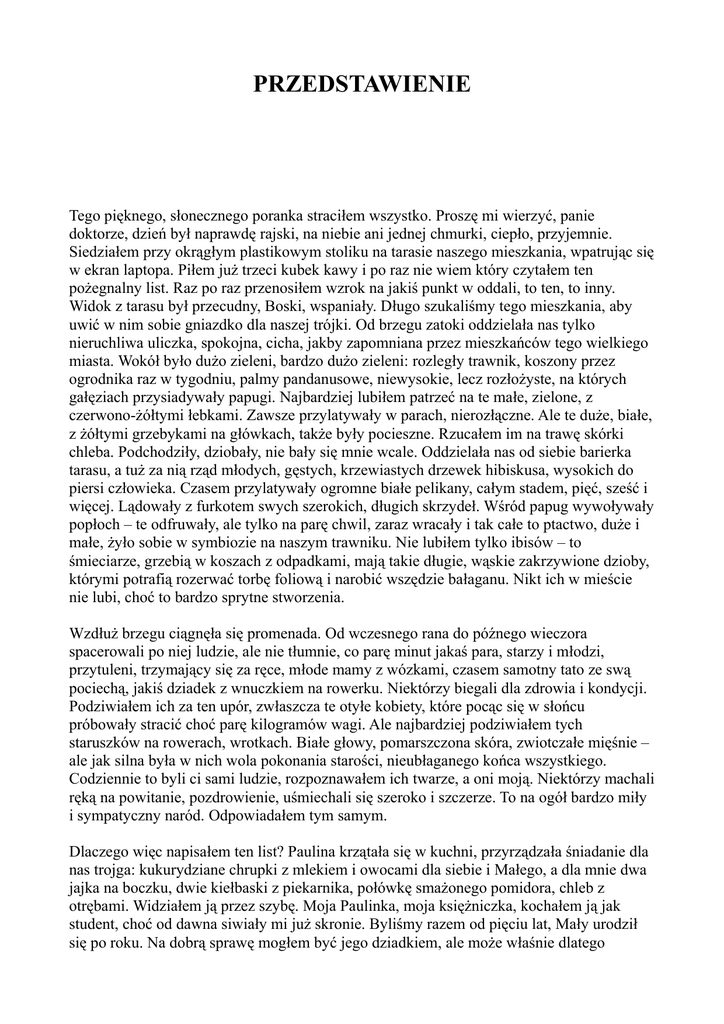 PRZEDSTAWIENIE Tego pięknego, słonecznego poranka straciłem wszystko. Proszę mi wierzyć, panie doktorze, dzień był naprawdę rajski, na niebie ani jednej chmurki, ciepło, przyjemnie. Siedziałem przy okrągłym plastikowym stoliku na tarasie naszego mieszkania, wpatrując się w ekran laptopa. Piłem już trzeci kubek kawy i po raz nie wiem który czytałem ten pożegnalny list. Raz po raz przenosiłem wzrok na jakiś punkt w oddali, to ten, to inny. Widok z tarasu był przecudny, Boski, wspaniały. Długo szukaliśmy tego mieszkania, aby uwić w nim sobie gniazdko dla naszej trójki. Od brzegu zatoki oddzielała nas tylko nieruchliwa uliczka, spokojna, cicha, jakby zapomniana przez mieszkańców tego wielkiego miasta. Wokół było dużo zieleni, bardzo dużo zieleni: rozległy trawnik, koszony przez ogrodnika raz w tygodniu, palmy pandanusowe, niewysokie, lecz rozłożyste, na których gałęziach przysiadywały papugi. Najbardziej lubiłem patrzeć na te małe, zielone, z czerwono-żółtymi łebkami. Zawsze przylatywały w parach, nierozłączne. Ale te duże, białe, z żółtymi grzebykami na główkach, także były pocieszne. Rzucałem im na trawę skórki chleba. Podchodziły, dziobały, nie bały się mnie wcale. Oddzielała nas od siebie barierka tarasu, a tuż za nią rząd młodych, gęstych, krzewiastych drzewek hibiskusa, wysokich do piersi człowieka. Czasem przylatywały ogromne białe pelikany, całym stadem, pięć, sześć i więcej. Lądowały z furkotem swych szerokich, długich skrzydeł. Wśród papug wywoływały popłoch – te odfruwały, ale tylko na parę chwil, zaraz wracały i tak całe to ptactwo, duże i małe, żyło sobie w symbiozie na naszym trawniku. Nie lubiłem tylko ibisów – to śmieciarze, grzebią w koszach z odpadkami, mają takie długie, wąskie zakrzywione dzioby, którymi potrafią rozerwać torbę foliową i narobić wszędzie bałaganu. Nikt ich w mieście nie lubi, choć to bardzo sprytne stworzenia. Wzdłuż brzegu ciągnęła się promenada. Od wczesnego rana do późnego wieczora spacerowali po niej ludzie, ale nie tłumnie, co parę minut jakaś para, starzy i młodzi, przytuleni, trzymający się za ręce, młode mamy z wózkami, czasem samotny tato ze swą pociechą, jakiś dziadek z wnuczkiem na rowerku. Niektórzy biegali dla zdrowia i kondycji. Podziwiałem ich za ten upór, zwłaszcza te otyłe kobiety, które pocąc się w słońcu próbowały stracić choć parę kilogramów wagi. Ale najbardziej podziwiałem tych staruszków na rowerach, wrotkach. Białe głowy, pomarszczona skóra, zwiotczałe mięśnie – ale jak silna była w nich wola pokonania starości, nieubłaganego końca wszystkiego. Codziennie to byli ci sami ludzie, rozpoznawałem ich twarze, a oni moją. Niektórzy machali ręką na powitanie, pozdrowienie, uśmiechali się szeroko i szczerze. To na ogół bardzo miły i sympatyczny naród. Odpowiadałem tym samym. Dlaczego więc napisałem ten list? Paulina krzątała się w kuchni, przyrządzała śniadanie dla nas trojga: kukurydziane chrupki z mlekiem i owocami dla siebie i Małego, a dla mnie dwa jajka na boczku, dwie kiełbaski z piekarnika, połówkę smażonego pomidora, chleb z otrębami. Widziałem ją przez szybę. Moja Paulinka, moja księżniczka, kochałem ją jak student, choć od dawna siwiały mi już skronie. Byliśmy razem od pięciu lat, Mały urodził się po roku. Na dobrą sprawę mogłem być jego dziadkiem, ale może właśnie dlatego kochałem go tym bardziej, tym mocniej, nie jak ojciec, lecz jak dziadek i ojciec w jednej osobie. Całe moje szczęście, całe nasze szczęście. Cały mój świat – Paulinka i Mały. Nigdy nie zapomnę tej chwili, gdy w sali porodowej usłyszałem jego płacz. Zaniósł się tym żałosnym łkaniem – pierwszy oddech, pierwsze spojrzenie na otaczający go świat – a mnie popłynęły z oczu łzy radości. Obok stała pielęgniarka. Gratuluję synka, powiedziała, podając mi chusteczkę higieniczną. Uśmiechnąłem się zawstydzony łzami, bo przecież mężczyzna, zwłaszcza w moim wieku, nie powinien płakać jak beksa. A ja nie mogłem się powstrzymać, uspokoić. W końcu roześmiałem się gwałtownie, na cały głos, nie wiedzieć czemu. Położyłem dłoń na drobnym ramieniu Paulinki i powiedziałem: Dziękuję. Uśmiechnęła się, miała zmęczoną, wyczerpaną twarz. Była druga w nocy, a poród zaczął się o siódmej rano poprzedniego dnia. Lekarz położył Małego na jej piersiach. Był nagi, unurzany jeszcze we krwi i wodach płodowych, miał wilgotne włoski. Już nie płakał, patrzył ufnie w jej oczy, zaraz odszukał pierś i przyssał się swymi malutkimi usteczkami. Paulinka głaskała go dłonią po główce, była taka szczęśliwa. Powiedziała szeptem: Czekałam na tę chwilę całe życie. Kocham cię. Kocham was. Ja też, odpowiedziałem. Pochyliłem się nad nimi i wtuliłem się twarzą w ich ciepłe, kochane ciała. Znów popłynęły mi z oczu łzy. Widziałem przez szybę, jak Mały bawił się klockami na dywanie. Budował coś, skupiając całą swoją uwagę na czynnościach pracowitych rączek. Widać to było w jego czarnych ślepkach. Szkoda będzie go zostawić, szkoda mi Paulinki, ale dłużej już tego piekła nie wytrzymam, pomyślałem wtenczas, panie doktorze. W tym liście zawarłem całą moją rozpacz, pomieszaną ze zwierzęcą agresją. Zresztą czytał pan, oddałem go policji. Chciałem was wszystkich ukarać, abyście wreszcie poczuli się winni mojej krzywdy, mojego upokorzenia, mojego upodlenia. Tak jest! Upodliliście mnie! Odebraliście mi wszystko, co miałem, a miałem tak niewiele. To wasza wina! Dlaczego mi to zrobiliście? Dlaczego akurat mnie? Jestem dobrym człowiekiem, mam dobry charakter, jestem uczciwym obywatelem, płaciłem podatki, pracowałem, dbałem o rodzinę, zapewniłem jej dobrobyt na miarę moich możliwości. Nie piłem, nie paliłem, nie brałem narkotykó