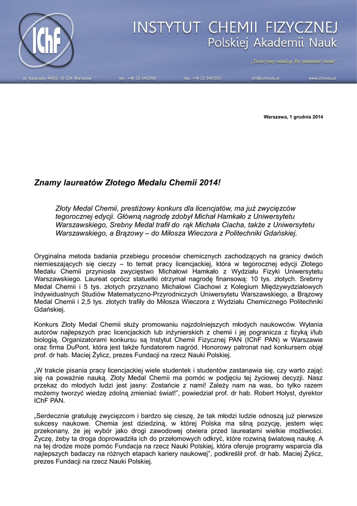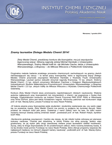Warszawa, 1 grudnia 2014 Znamy laureatów Złotego Medalu Chemii 2014! Złoty Medal Chemii, prestiżowy konkurs dla licencjatów, ma już zwycięzców tegorocznej edycji. Główną nagrodę zdobył Michał Hamkało z Uniwersytetu Warszawskiego, Srebny Medal trafił do rąk Michała Ciacha, także z Uniwersytetu Warszawskiego, a Brązowy – do Miłosza Wieczora z Politechniki Gdańskiej. Oryginalna metoda badania przebiegu procesów chemicznych zachodzących na granicy dwóch niemieszających się cieczy – to temat pracy licencjackiej, która w tegorocznej edycji Złotego Medalu Chemii przyniosła zwycięstwo Michałowi Hamkało z Wydziału Fizyki Uniwersytetu Warszawskiego. Laureat oprócz statuetki otrzymał nagrodę finansową: 10 tys. złotych. Srebrny Medal Chemii i 5 tys. złotych przyznano Michałowi Ciachowi z Kolegium Międzywydziałowych Indywidualnych Studiów Matematyczno-Przyrodniczych Uniwersytetu Warszawskiego, a Brązowy Medal Chemii i 2,5 tys. złotych trafiły do Miłosza Wieczora z Wydziału Chemicznego Politechniki Gdańskiej. Konkurs Złoty Medal Chemii służy promowaniu najzdolniejszych młodych naukowców. Wyłania autorów najlepszych prac licencjackich lub inżynierskich z chemii i jej pogranicza z fizyką i/lub biologią. Organizatorami konkursu są Instytut Chemii Fizycznej PAN (IChF PAN) w Warszawie oraz firma DuPont, która jest także fundatorem nagród. Honorowy patronat nad konkursem objął prof. dr hab. Maciej Żylicz, prezes Fundacji na rzecz Nauki Polskiej. „W trakcie pisania pracy licencjackiej wiele studentek i studentów zastanawia się, czy warto zająć się na poważnie nauką. Złoty Medal Chemii ma pomóc w podjęciu tej życiowej decyzji. Nasz przekaz do młodych ludzi jest jasny: Zostańcie z nami! Zależy nam na was, bo tylko razem możemy tworzyć wiedzę zdolną zmieniać świat!”, powiedział prof. dr hab. Robert Hołyst, dyrektor IChF PAN. „Serdecznie gratuluję zwycięzcom i bardzo się cieszę, że tak młodzi ludzie odnoszą już pierwsze sukcesy naukowe. Chemia jest dziedziną, w której Polska ma silną pozycję, jestem więc przekonany, że jej wybór jako drogi zawodowej otwiera przed laureatami wielkie możliwości. Życzę, żeby ta droga doprowadziła ich do przełomowych odkryć, które rozwiną światową naukę. A na tej drodze może pomóc Fundacja na rzecz Nauki Polskiej, która oferuje programy wsparcia dla najlepszych badaczy na różnych etapach kariery naukowej”, podkreślił prof. dr hab. Maciej Żylicz, prezes Fundacji na rzecz Nauki Polskiej. Oprócz nagród głównych, wyróżnienia i nagrody pieniężne w wysokości 1 000 złotych zdobyli: Mirosław Arczyński z Wydziału Chemii Uniwersytetu Jagiellońskiego, Iwona Gawlik z Wydziału Chemii Uniwersytetu Jagiellońskiego, Maciej Majewski z Wydziału Fizyki Uniwersytetu Warszawskiego i Dawid Zych z Wydziału Matematyki, Fizyki i Chemii Uniwersytetu Śląskiego w Katowicach. Nagrodę przyznawaną przez samych finalistów otrzymał Dawid Zych. Firma DuPont, współorganizator konkursu i fundator nagród, przyznała ponadto trzy dodatkowe wyróżnienia, biorąc pod uwagę takie kryteria jak dorobek publikacyjny autora, znaczenie praktyczne wyników badań i ich wartość naukową, wykorzystanie nowoczesnych metod analitycznych oraz samodzielność prowadzenia badań. Wyróżnienia, połączone z nagrodą finansową wysokości 2 300 zł, otrzymali: Iwona Gawlik, Michał Hamkało i Maciej Majewski. „Duże zainteresowanie konkursem świadczy o tym, że mamy w Polsce młodych naukowców z ogromnym potencjałem. Zrealizowane przez nich badania są warte promowania i mam nadzieję, że w przyszłości znajdą zastosowanie w biznesie. Cieszę, że możemy wspierać młodych i tak niesamowicie zdolnych ludzi w realizacji ich celów”, stwierdził Piotr Gill, dyrektor generalny DuPont Poland. Laureaci tak opisują swoje badania: „Za pomocą złożonego układu optycznego z wiązką femtosekundowych impulsów laserowych udało mi się po raz pierwszy na świecie uzyskać bezpośrednie informacje o zjawiskach katalitycznych zachodzących w obszarze miedzy dwiema fazami w cieczach. Reakcje katalizy międzyfazowej są znane od ponad 40 lat i często stosowane w przemysłowych syntezach, ale ich dokładny mechanizm nie był wyjaśniony. Teraz udało się go poznać, a nawet odkryć nowe, dotychczas nieprzewidziane zależności”, wyjaśnia Michał Hamkało, laureat Złotego Medalu Chemii i autor pracy „Badanie katalizy międzyfazowej za pomocą generacji drugiej harmonicznej”. „Stworzyłem nowy model matematyczny przełącznika genetycznego, czyli mechanizmu umożliwiającego komórce biologicznej przebywanie w jednym z dwóch stanów: w pierwszym w komórce jest dużo białek jednego rodzaju, hamujących produkcję białek drugiego rodzaju, a w drugim stanie jest na odwrót. Dotychczasowe równania opisujące takie przełączniki były bardzo skomplikowane i można je było rozwiązywać tylko numerycznie. Dzięki użyciu teorii gier ewolucyjnych, zajmującej się badaniem populacji oddziałujących ze sobą agentów, teraz przełącznik można opisać jednym stosunkowo prostym wzorem”, mówi Michał Ciach, zdobywca Srebrnego Medalu Chemii, autor pracy „Przełącznik genetyczny w ujęciu teorii gier ewolucyjnych”. „W swojej pracy badałem specyficzne oddziaływanie dwóch białek telomerowych z telomerowymi zakończeniami DNA. Udało się ustalić mechanizm tego oddziaływania i pomyślnie skonfrontować go z dostępnymi danymi eksperymentalnymi, a także zaproponować odmianę mechanizmu, którą prawdopodobnie da się uogólnić na inne typy oddziaływań białko-DNA”, wyjaśnia Miłosz Wieczór, który otrzymał Brązowy Medal Chemii za pracę „A Molecular Dynamics analysis of TRF1/TRF2 mechanisms of sequence recognition and DNA binding”. Wszyscy finaliści konkursu zyskali możliwość odbycia stażu naukowego w Instytucie Chemii Fizycznej P