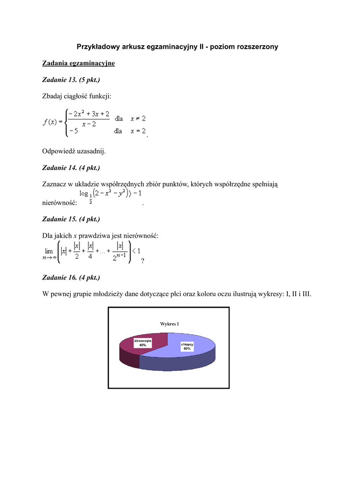 Przykładowy arkusz egzaminacyjny II - poziom rozszerzony Zadania egzaminacyjne Zadanie 13. (5 pkt.) Zbadaj ciągłość funkcji: . Odpowiedź uzasadnij. Zadanie 14. (4 pkt.) Zaznacz w układzie współrzędnych zbiór punktów, których współrzędne spełniają nierówność: . Zadanie 15. (4 pkt.) Dla jakich x prawdziwa jest nierówność: ? Zadanie 16. (4 pkt.) W pewnej grupie młodzieży dane dotyczące płci oraz koloru oczu ilustrują wykresy: I, II i III. Wybrano losowo jedną osobę z tej grupy. Jakie jest prawdopodobieństwo, że ma ona zielone oczy? Zadanie 17. (4 pkt.) Wykorzystując tożsamość: równania: wykaż, że jest rozwiązaniem . Zadanie 18. (5 pkt.) Naszkicuj wykres funkcji: . Na podstawie wykresu funkcji odczytaj przedziały, w których funkcja ta przyjmuje wartości ujemne. Zadanie 19. (12 pkt.) Przekątna przekroju osiowego walca ma długość równą mieć ten walec ? . Jaką największą objętość może Zadanie 20. (11 pkt.) Rozwiąż nierówność do przedziału (0; 1). przy założeniu, że wartość parametru m należy Zadanie 21. (11 pkt.) W równoległoboku ABCD dane są: , zaś środkiem boku AB jest punkt . Wyznacz równanie prostej przechodzącej przez wierzchołki C, D. Wyznacz równanie prostej CE zawierającej wysokość poprowadzoną z wierzchołka C i przecinającej prostą AB w punkcie E. Opisz przy pomocy układu nierówności liniowych zbiór wszystkich punktów należących do trójkąta BCE. MODEL ODPOWIEDZI I SCHEMAT OCENIANIA ARKUSZA EGZAMINACYJNEGO II - POZIOM ROZSZERZONY Max liczba p. Nr Etapy rozwiązania zadania 13. 14. Obliczenie granicy funkcji w punkcie : 2 Porównanie wartości granicy i wartości funkcji oraz stwierdzenie ciągłości w punkcie x = 2 2 Stwierdzenie ciągłości w zbiorze R (z komentarzem) 1 Utworzenie układu nierówności: 2 Ilustracja graficzna zbioru: 15. Obliczenie sumy n początkowych wyrazów ciągu geometrycznego 2 1 Obliczenie granicy: Rozwiązanie nierówności z wartością bezwzględną: 16. Poprawne odczytanie danych z wykresów (opis zdarzeń losowych) Obliczenie prawdopodobieństwa zdarzenia: 0,24 17. Sprowadzenie tożsamości do postaci : Podstawienie: 2 do równania i uzyskanie tezy 18. Zapisanie wzoru funkcji bez wartości bezwzględnej: 1 2 2 2 2 2 Narysowanie wykresu funkcji f w przypadku (*) 1 Narysowanie wykresu funkcji f w przypadku (**) 1 Odczytanie przedziału, w którym funkcja przyjmuje wartości ujemne: (-1;1) 1 19. Wyznaczenie zależności między długością promienia podstawy i długością wysokości walca: punkt - 1 punkt ; Wyznaczenie funkcji objętości walca: -1 2 . Określenie dziedziny funkcji objętości: 1 . Obliczenie pochodnej funkcji objętości: . Wyznaczenie miejsca zerowego pochodnej: 2 . 1 2 Zbadanie znaku pochodnej. 1 Uzasadnienie, że w punkcie 2 wartość funkcji jest największa. 2 Wyznaczenie wartości największej: 1 . 20. Ustalenie dziedziny nierówności: 2 Wykonanie podstawienia pomocniczego np. Rozwiązanie nierówności : 1 2 1 Rozwiązanie nierówności wykładniczych: 2 Wyznaczenie zbioru rozwiązań nierówności: 2 Sformułowanie poprawnej odpowiedzi 1 21. Sporządzenie rysunku wraz z oznaczeniami 1 Wyznaczenie współrzędnych punktów: A, B, C, (po 1 pkt.) Określenie równań prostych AB, CD, CE, BC (po 1 pkt.) Opisanie 3 4 przy pomocy układu nierówności liniowych: 3 Za prawidłowe rozwiązanie każdego z zadań inną metodą (zgodną z poleceniem) od przedstawionej w schemacie przyznajemy maksymalną liczbę punktów.