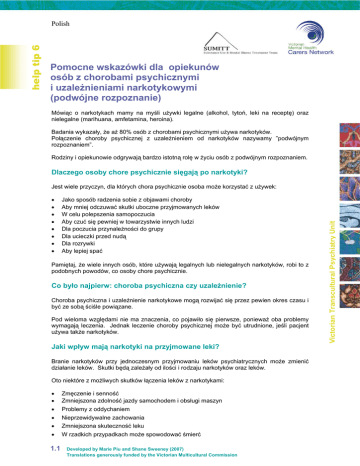 Pomocne wskazówki dla opiekunów osób z chorobami psychicznymi i uzależnieniami narkotykowymi (podwójne rozpoznanie) Mówiąc o narkotykach mamy na myśli używki legalne (alkohol, tytoń, leki na receptę) oraz nielegalne (marihuana, amfetamina, heroina). Badania wykazały, że aż 80% osób z chorobami psychicznymi używa narkotyków. Połączenie choroby psychicznej z uzależnieniem od narkotyków nazywamy ”podwójnym rozpoznaniem”. Rodziny i opiekunowie odgrywają bardzo istotną rolę w życiu osób z podwójnym rozpoznaniem. Dlaczego osoby chore psychicznie sięgają po narkotyki? Jest wiele przyczyn, dla których chora psychicznie osoba może korzystać z używek: • • • • • • • • Jako sposób radzenia sobie z objawami choroby Aby mniej odczuwać skutki uboczne przyjmowanych leków W celu polepszenia samopoczucia Aby czuć się pewniej w towarzystwie innych ludzi Dla poczucia przynależności do grupy Dla ucieczki przed nudą Dla rozrywki Aby lepiej spać Pamiętaj, że wiele innych osób, które używają legalnych lub nielegalnych narkotyków, robi to z podobnych powodów, co osoby chore psychicznie. Co było najpierw: choroba psychiczna czy uzależnienie? Choroba psychiczna i uzależnienie narkotykowe mogą rozwijać się przez pewien okres czasu i być ze sobą ściśle powiązane. Pod wieloma względami nie ma znaczenia, co pojawiło się pierwsze, ponieważ oba problemy wymagają leczenia. Jednak leczenie choroby psychicznej może być utrudnione, jeśli pacjent używa także narkotyków. Jaki wpływ mają narkotyki na przyjmowane leki? Branie narkotyków przy jednoczesnym przyjmowaniu leków psychiatrycznych może zmienić działanie leków. Skutki będą zależały od ilości i rodzaju narkotyków oraz leków. Oto niektóre z możliwych skutków łączenia leków z narkotykami: • • Zmęczenie i senność Zmniejszona zdolność jazdy samochodem i obsługi maszyn • Problemy z oddychaniem • Nieprzewidywalne zachowania • Zmniejszona skuteczność leku • W rzadkich przypadkach może spowodować śmierć 1.1 Developed by Marie Piu and Shane Sweeney (2007) Translations generously funded by the Victorian Multicultural Commission Victorian Transcultural Psychiatry Unit help tip 6 Polish Polish W jaki sposób mogą sobie radzić rodziny? Członkowie rodzin, którzy opiekują się osobą z podwójnym rozpoznaniem, mogą doznawać wielu bolesnych doświadczeń, takich jak: • • Zamartwianie się, problemy ze snem, strach, niepewność, gniew, frustracja, poczucie winy, utrata nadziei, poczucie obcości w stosunku do osoby, którą się opiekują Utrata wagi ciała, przemoc Poczucie napiętnowania i odosobnienia, utrata przyjaciół i znajomych Co pomaga Co nie pomaga • • • • • • • • • • Dojście do porozumienia na temat używania narkotyków. Należy pamiętać, że jakakolwiek redukcja spożycia alkoholu oraz/lub narkotyków jest lepsza niż żadna. Rozmowa z case manager Zrozumienie powodów dla których dana osoba używa narkotyków Rozpoznanie sytuacji, w których może dojść do użycia narkotyków Wyznaczanie granic dopuszczalnego zachowania Robienie zakupów razem z chorą osobą po otrzymaniu przez nią wypłaty Kupowanie tylko niezbędnych rzeczy Pomoc w planowaniu wydatków i robieniu oszczędności na przyszłość • • • • Groźby, krytyka, krzyki Częste dawanie gotówki lub udostępnianie jej na życzenie chorego Żądanie natychmiastowego zaprzestania używania narkotyków Przeszukiwanie rzeczy osobistych Żądanie badania moczu Jeśli coś nie działa, zrezygnuj z tego i wypróbuj jakiś nowy sposób W szczególnych sytuacjach lub w kryzysie może zaistnieć potrzeba szybkiego działania w celu zapewnienia bezpieczeństwa sobie i drugiej osobie. Bezpieczeństwa jest sprawą pierwszorzędnej wagi. Jak pomóc sobie i swojej rodzinie Co pomaga Nie rezygnuj z rzeczy, które lubisz: • • • • • • • • • • • 1.2 Praktyka religii Praca w ogródku Odwiedzanie rodziny i znajomych Zabawa ze zwierzętami domowymi Ćwiczenia fizyczne Relaksacja Znajdź czas na zorganizowanie przyjemnego spędzenia czasu w gronie rodzinnym Zrób listę wspólnych zajęć sprawiających przyjemność całej rodzinie Zachowaj szacunek dla chorego członka rodziny Bierz udział w spotkaniach grup wsparcia dla rodzin Skorzystaj z fachowej pomocy Developed by Marie Piu and Shane Sweeney (2007) Translations generously funded by the Victorian Multicultural Commission Victorian Transcultural Psychiatry Unit • Polish Jak uzyskać pomoc Jeśli angielski nie jest twoim językiem ojczystym, poproś o tłumacza. Może ci też pomóc przeczytanie innych pomocnych wskazówek z tej serii, a szczególnie wskazówki nr 3: Zrozumienie poczucia winy w kontekście choroby psychicznej oraz wskazówki nr 4: Rozpoznanie uczucia żalu z powodu utraty w kontekście choroby psychicznej. Gdzie szukać pomocy Grupy Wsparcia dla Rodzin • Carers Victoria 9650 9966 lub 1800 242 636 – wsparcie dla opiekunów między 8.30 i 16.00 • Family Drug Help line 1300 660 068 – czynna 24 godziny na dobę linia telefoniczna oferująca wsparcie dla rodzin osób uzależnionych • Mental Illness Fellowship Helpline 8486 4222 – informacje na temat grup wsparcia dla rodzin • Directline 1800 888 236 – czynne 24 godziny na dobę poradnictwo, wsparcie i udzielanie skierowań • Suicide Helpline 1300 651 251 – czynne 24 godziny na dobę wsparcie i poradnictwo dla osób o tendencjach samobójczych • Kids Helpline 1800 551 800 – czynne 24 godziny na dobę poradnictwo dla młodych osób z problemami • Bouverie Centre 9376 9844 – poradnictwo rodzinne • Drug Info 1300 858 584 – informacje na temat narkotyków dla opiekunów w różnych językach • Policja 000 1.3 Victorian Transcultural Psychiatry Unit Poradnictwo indywidualne i rodzinne Developed by Marie Piu and Shane Sweeney (2007) Translations generously funded by the Victorian Multicu