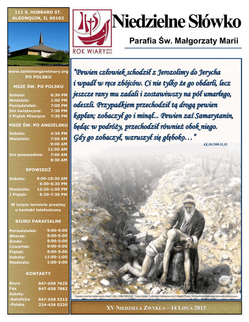 111 S. HUBBARD ST. ALGONQUIN, IL 60102 Niedzielne Słówko Parafia Św. Małgorzaty Marii www.saintmargaretmary.org PO POLSKU MSZE ŚW. PO POLSKU Sobota: Niedziela: Poniedziałek: Dni świąteczne: I Piątek Miesiąca: 6:30 1:00 7:00 7:30 7:30 PM PM PM PM PM MSZE ŚW. PO ANGIELSKU Sobota: Niedziela: Dni powszednie: 4:30 7:00 9:00 11:00 7:00 8:30 PM AM AM AM AM AM “Pewien człowiek schodził z Jerozolimy do Jerycha i wpadł w ręce zbójców. Ci nie tylko że go obdarli, lecz jeszcze rany mu zadali i zostawiwszy na pół umarłego, odeszli. Przypadkiem przechodził tą drogą pewien kapłan; zobaczył go i minął... Pewien zaś Samarytanin, będąc w podróży, przechodził również obok niego. Gdy go zobaczył, wzruszył się głęboko…” Łk 10:130b-31,33 SPOWIEDŹ Sobota: Niedziela: I Piątek: 9:00-10:30 AM 6:00-6:30 PM 12:30-1:00 PM 6:30-7:30 PM W innym terminie prosimy o kontakt telefoniczny BIURO PARAFIALNE Poniedziałek: Wtorek: Środa: Czwartek: Piątek: Sobota: Niedziela: 9:00-5:00 9:00-5:00 9:00-5:00 9:00-5:00 9:00-5:00 11:00-1:00 1:00-3:00 KONTAKTY Biuro Fax Szkoły: -Katolicka -Polska 847-658 7625 847-658 7882 847-658 5313 224-436 0320 XV NIEDZIELA ZWYKŁA – 14 LIPCA 2013 Niedzielne Słówko Od Proboszcza “ Wzruszył się głęboko, podszedł do niego i opatrzył mu rany, zalewając je oliwą i winem”. Drodzy Przyjaciele! Dzisiejsza Ewangelia wyjaśnia nam, co to znaczy okazywać miłość i miłosierdzie naszym bliźnim. Poprzez przykład Dobrego Samarytanina, Jezus wzywa nas do troszczenia się o naszych braci i siostry, którzy są w potrzebie. Chodzi tu nie tylko o krewnych i przyjaciół, ale także o ludzi, których spotykamy w naszym życiu, a którzy potrzebują naszej pomocy. Po opisaniu przykładu Dobrego Samarytanina w Ewangelii, Jezus kieruje do nas polecenie miłości i miłosierdzia, kiedy mówi: “ Idź, i ty czyń podobnie”. W dzisiejszej Ewangelii możemy dostrzec samego Jezusa w osobie Dobrego Samarytanina. Jezus nigdy nie przestał mówić światu, że sam chce być dla niego Dobrym Samarytaninem, że Jego przykazania i sakramenty są lekarstwem na rany spowodowane naszym egoizmem i grzechem. Jezus wyrażał tą prawdę w rożny sposób na przestrzeni dziejów. Nigdy nie przestaje przekonywać nas o tym, że kocha nas całkowicie z pasją i mocą. W XVI wieku przekazał tę prawdę światu w wizjach, które miała Święta Małgorzata Maria Alacocque, pokorna francuska zakonnica, która jest patronką naszej parafii. Wizje te stały się początkiem nabożeństwa do Najświętszego Serca Pana Jezusa. Kiedy Jezus po raz pierwszy objawił się Św. Małgorzacie Marii, stanął przed nią i pokazał jej swoje serce, nazywając je ogniskiem miłości. Następnie sięgnął po jej serce i wziął je do swoich rąk. Pokazał je jej w postaci małego atomu. Następnie włożył je do swojego serca, gdzie zaczęło płonąć płomieniami Jego miłości. Innym razem Jezus pozwolił jej zajrzeć bezpośrednio do wnętrza Jego serca. Święta napisała potem, że było ono tak jasne, jak słońce i tak przeźroczyste, jak kryształ. Na jego szczycie zobaczyła krzyż. Na jednej stronie serca była głęboka rana spowodowana włócznią żołnierza na Kalwarii. Środek serca był opasany pierścieniem z cierni. Jezus wytłumaczył Małgorzacie Marii, że te ciernie wzięły się z obojętności i niewdzięczności, jakich zaznał od mężczyzn i kobiet, których kochał, za których umarł i dla których stał się Dobrym Samarytaninem dla świata. Ewangelia według św. Łukasza 10,25 - 37 Powstał jakiś uczony w Prawie i wystawiając Jezusa na próbę, zapytał: ”Nauczycielu, co mam czynić, aby osiągnąć życie wieczne?”. Jezus mu odpowiedział: ”Co jest napisane w Prawie? Jak czytasz?”. On rzekł: ”Będziesz miłował Pana Boga swego całym swoim sercem, całą swoją duszą, całą swoją mocą i całym swoim umysłem; a swego bliźniego jak siebie samego”. Jezus rzekł do niego: ”Dobrześ odpowiedział. To czyń, a będziesz żył”. Lecz on, chcąc się usprawiedliwić, zapytał Jezusa: ”A kto jest moim bliźnim?”. Jezus, nawiązując do tego, rzekł: ”Pewien człowiek schodził z Jerozolimy do Jerycha i wpadł w ręce zbójców. Ci nie tylko go obdarli, lecz jeszcze rany mu zadali i zostawiwszy na pół umarłego, odeszli. Przypadkiem przechodził tą drogą pewien kapłan; zobaczył go i minął. Tak samo lewita, gdy przyszedł na to miejsce i zobaczył go, minął. Pewien zaś Samarytanin, będąc w podróży, przechodził również obok niego. Gdy go zobaczył, wzruszył się głęboko: podszedł do niego i opatrzył mu rany, zalewając je oliwą i winem; potem wsadził go na swoje bydlę, zawiózł do gospody i pielęgnował go. Następnego zaś dnia wyjął dwa denary, dał gospodarzowi i rzekł: »Miej o nim staranie, a jeśli co więcej wydasz, ja oddam tobie, gdy będę wracał«. Któryż z tych trzech okazał się, według twego zdania, bliźnim tego, który wpadł w ręce zbójców?”. On odpowiedział: ”Ten, który mu okazał miłosierdzie”. Jezus mu rzekł: ”Idź, i ty czyń podobnie”. Jezus jest dla nas przykładem do naśladowania. Nasza droga z Jerycha do Jerozolimy jest drogą naszego życia, na której spotykamy ludzi, którzy potrzebują naszego czasu, naszej modlitwy, dobrego słowa, naszej uwagi, naszych pieniędzy, po prostu potrzebują naszej miłości. Spotykając takich ludzi możemy się zachować jak kapłan i lewita, którzy przeszli na drugą stronę drogi, aby nie pomóc. Ale my jesteśmy chrześcijanami, uczniami Jezusa i chcemy Go naśladować, Jego, który sam stał się dobrym Samarytaninem dla nas i dla całego świata. O. Piotr Sarnicki OFM Conv Niedzielne Słówko Ogłoszenia W poniedziałek 15-go lipca zapraszamy na Mszę Św. o 7 wieczorem i nabożeństwo adoracyjne. Dzisiaj po Mszy Świętej są do nabycia bilety loterii pieniężnej, której losowanie odbędzie się podczas