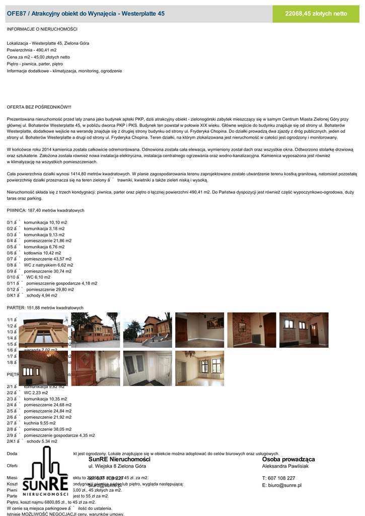 OFE87 / Atrakcyjny obiekt do Wynajęcia - Westerplatte 45 22068,45 złotych netto INFORMACJE O NIERUCHOMOŚCI Lokalizacja - Westerplatte 45, Zielona Góra Powierzchnia - 490,41 m2 Cena za m2 - 45,00 złotych netto Piętro - piwnica, parter, piętro Informacje dodatkowe - klimatyzacja, monitoring, ogrodzenie OFERTA BEZ POŚREDNIKÓW!!! Prezentowana nieruchomość przed laty znana jako budynek apteki PKP, dziś atrakcyjny obiekt - zielonogórski zabytek mieszczący się w samym Centrum Miasta Zielonej Góry przy głównej ul. Bohaterów Westerplatte 45, w pobliżu dworca PKP i PKS. Budynek ten powstał w połowie XIX wieku. Główne wejście do budynku znajduje się od strony ul. Bohaterów Westerplatte, dodatkowe wejście na werandę znajduje się z drugiej strony budynku od strony ul. Fryderyka Chopina. Do działki prowadzą dwa zjazdy z dróg publicznych, jeden od strony ul. Bohaterów Westerplatte a drugi od strony ul. Fryderyka Chopina. Teren działki, na którym zlokalizowana jest nieruchomość w całości jest ogrodzony i monitorowany. W końcówce roku 2014 kamienica została całkowicie odremontowana. Odnowiona została cała elewacja, wymieniony został dach oraz wszystkie okna. Odtworzono stolarkę drzwiową oraz sztukaterie. Założona została również nowa instalacja elektryczna, instalacja centralnego ogrzewania oraz wodno-kanalizacyjna. Kamienica wyposażona jest również w klimatyzację na wszystkich pomieszczeniach. Cała powierzchnia działki wynosi 1414,80 metrów kwadratowych. W planie zagospodarowania terenu zaprojektowane zostało utwardzenie terenu kostką granitową, natomiast pozostałą powierzchnię działki przeznacza się na teren zielony â trawniki, kwietniki a także zieleń niską i wysoką. Nieruchomość składa się z trzech kondygnacji: piwnica, parter oraz piętro o łącznej powierzchni 490,41 m2. Do Państwa dyspozycji jest również część wypoczynkowo-ogrodowa, duży taras oraz parking. PIWNICA: 187,40 metrów kwadratowych 0/1 â 0/2 â 0/3 â 0/4 â 0/5 â 0/6 â 0/7 â 0/8 â 0/9 â 0/10 â 0/11 â 0/12 â 0/K1 â komunikacja 10,10 m2 komunikacja 3,18 m2 komunikacja 9,13 m2 pomieszczenie 21,86 m2 komunikacja 6,76 m2 kotłownia 10,42 m2 pomieszczenie 43,57 m2 WC z natryskiem 6,62 m2 pomieszczenie 30,74 m2 WC 6,10 m2 pomieszczenie gospodarcze 4,18 m2 pomieszczenie 29,80 m2 schody 4,94 m2 PARTER: 151,88 metrów kwadratowych 1/1 â 1/2 â 1/3 â 1/4 â 1/5 â 1/6 â 1/7 â 1/8 â komunikacja 8,53 m2 pomieszczenie gospodarcze 0,95 m2 WC 4,19 m2 pomieszczenie 34,62 m2 pomieszczenie 23,03 m2 weranda 7,02 m2 pomieszczenie 29,82 m2 pomieszczenie z kuchnią 43,72 m2 PIĘTRO: 151,13 metrów kwadratowych 2/1 â 2/2 â 2/3 â 2/4 â 2/5 â 2/6 â 2/7 â 2/8 â 2/9 â 2/K1 â komunikacja 9,82 m2 WC 2,23 m2 komunikacja 10,35 m2 pomieszczenie 24,68 m2 pomieszczenie 24,84 m2 pomieszczenie 21,92 m2 kuchnia 9,55 m2 pomieszczenie 38,05 m2 pomieszczenie gospodarcze 4,35 m2 schody 5,34 m2 Dodatkowym atutem jest to, iż obiekt jest ogrodzony. Lokale znajdujące się w obiekcie można adoptować do celów biurowych oraz usługowych. Oferta wynajmu jest następująca: SunRE Nieruchomości Osoba prowadząca ul. Wiejska 8 Zielona Góra Aleksandra Pawlisiak Miesięczny koszt najmu całego obiektu to 22068,45 zł. jest to 45 zł. za m2. tel. 607 108 227 Koszt wynajęcia poszczególnych kondygnacji piwnica parter lub piętro, wygląda następującą: [email protected] Piwnica, koszt najmu to kwota 7776,00 zł., 45 złotych za m2. Parter, kwota najmu to 8353,40 zł, jest to 55 zł za m2. Piętro, koszt najmu 6800,85 zł., to 45 zł za m2. W cenie są miejsca parkingowe â ilość do ustalenia. Istnieje MOŻLIWOŚĆ NEGOCJACJI ceny, warunków umowy. T: 607 108 227 E: [email protected]