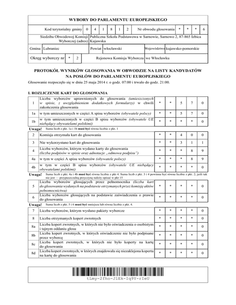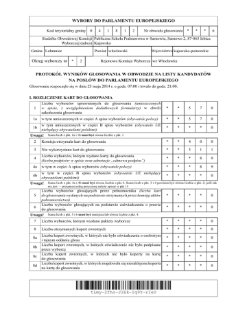WYBORY DO PARLAMENTU EUROPEJSKIEGO Kod terytorialny gminy 0 4 1 8 1 2 Nr obwodu głosowania * * * 6 Siedziba Obwodowej Komisji Publiczna Szkoła Podstawowa w Sarnowie, Sarnowo 2, 87-865 Izbica Wyborczej (adres) Kujawska Gmina Lubraniec Okręg wyborczy nr * Powiat włocławski 2 Województwo kujawsko-pomorskie Rejonowa Komisja Wyborcza we Włocławku PROTOKÓŁ WYNIKÓW GŁOSOWANIA W OBWODZIE NA LISTY KANDYDATÓW NA POSŁÓW DO PARLAMENTU EUROPEJSKIEGO Głosowanie rozpoczęło się w dniu 25 maja 2014 r. o godz. 07:00 i trwało do godz. 21:00. I. ROZLICZENIE KART DO GŁOSOWANIA 1 Liczba wyborców uprawnionych do głosowania (umieszczonych w spisie, z uwzględnieniem dodatkowych formularzy) w chwili zakończenia głosowania * * 5 7 0 1a w tym umieszczonych w części A spisu wyborców (obywatele polscy) * * 5 7 0 * * * * 0 w tym umieszczonych w części B spisu wyborców (obywatele UE niebędący obywatelami polskimi) Uwaga! Suma liczb z pkt. 1a i 1b musi być równa liczbie z pkt. 1 1b 2 Komisja otrzymała kart do głosowania * * 4 0 0 3 Nie wykorzystano kart do głosowania * * 3 1 1 4 Liczba wyborców, którym wydano karty do głosowania (liczba podpisów w spisie oraz adnotacje „odmowa podpisu”) * * * 8 9 4a w tym w części A spisu wyborców (obywatele polscy) * * * 8 9 w tym w części B spisu wyborców (obywatele UE niebędący * * * * 0 obywatelami polskimi) Uwaga! Suma liczb z pkt. 4a i 4b musi być równa liczbie z pkt 4. Suma liczb z pkt. 3 i 4 powinna być równa liczbie z pkt. 2; jeśli tak 4b nie jest — przypuszczalną przyczynę należy opisać w pkt 15 Liczba wyborców głosujących przez pełnomocnika (liczba kart 5 do głosowania wydanych na podstawie otrzymanych przez komisję aktów pełnomocnictwa) Liczba wyborców głosujących na podstawie zaświadczenia o prawie 6 do głosowania Uwaga! Suma liczb z pkt. 5 i 6 musi być mniejsza lub równa liczbie z pkt. 4. * * * * 0 * * * * 0 7 Liczba wyborców, którym wysłano pakiety wyborcze * * * * 0 8 Liczba otrzymanych kopert zwrotnych * * * * 0 * * * * 0 * * * * 0 * * * * 0 * * * * 0 8a 8b 8c 8d Liczba kopert zwrotnych, w których nie było oświadczenia o osobistym i tajnym oddaniu głosu Liczba kopert zwrotnych, w których oświadczenie nie było podpisane przez wyborcę Liczba kopert zwrotnych, w których nie było koperty na kartę do głosowania Liczba kopert zwrotnych, w których znajdowała się niezaklejona koperta na kartę do głosowania tLmy-2fho-JlEk-Iq9Y-rIeU –2– 8e Liczba kopert na kartę do głosowania wrzuconych do urny Uwaga! * * * * 0 Liczba z pkt. 8 nie może być większa od liczby z pkt. 7. II. USTALENIE WYNIKÓW GŁOSOWANIA Komisja stwierdziła, że pieczęcie na urnie pozostały nienaruszone. Po wyjęciu kart z urny Komisja ustaliła na ich podstawie następujące wyniki głosowania: 9 Liczba kart wyjętych z urny * * * 8 9 9a w tym liczba kart wyjętych z kopert na karty do głosowania * * * * 0 Uwaga! Liczba z pkt. 9 pomniejszona o liczbę z pkt. 9a powinna być równa liczbie z pkt. 4. Dodatkowo liczba z pkt. 9a nie może być większa od liczby z pkt. 8e; jeśli tak nie jest — przypuszczalną przyczynę należy opisać w pkt. 16. 10 Liczba kart nieważnych (innych niż urzędowo ustalone lub nieopatrzonych pieczęcią obwodowej komisji wyborczej) * * * * 0 11 Liczba kart ważnych * * * 8 9 * * * * 4 * * * 8 5 Uwaga! 12 Suma liczb z pkt. 10 i 11 musi być równa liczbie z pkt. 9. Jeśli w pkt. 10 liczba jest większa niż 0, przyczynę należy opisać w pkt. 17. Liczba głosów nieważnych (z kart ważnych) Liczba głosów ważnych oddanych łącznie na wszystkie listy kandydatów (z kart ważnych) Uwaga! Suma liczb z pkt. 12 i 13 musi być równa liczbie z pkt. 11. 13 tLmy-2fho-JlEk-Iq9Y-rIeU –3– 14. Na poszczególne listy kandydatów i umieszczonych na nich kandydatów oddano następujące liczby głosów ważnych: Lista nr 1 — KW Solidarna Polska Zbigniewa Ziobro Liczba głosów ważnych oddanych na listę: * * * * 1 Na poszczególnych kandydatów z tej listy oddano następujące liczby głosów ważnych: 1. STACHOWIAK Ireneusz * * * * 0 2. ŁUCZAK Stefan Nikodem * * * * 0 3. KAŁUŻNY Mariusz Piotr * * * * 1 4. KACZMAREK-SŁAWIŃSKA Katarzyna Anna * * * * 0 5. ŁABĘCKI Bogdan * * * * 0 6. MATCZAK Agnieszka Ewa * * * * 0 7. KOTLEWSKA Natalia Jadwiga * * * * 0 8. RUTKOWSKA Ewa Elżbieta * * * * 0 9. KUCZMARSKI Wiesław Andrzej * * * * 0 * * * * 0 * * * * 1 10. CIECIERSKI Sławomir Ryszard Razem Uwaga! Suma głosów oddanych na wszystkich kandydatów z danej listy (rubryka „Razem”) równa się liczbie głosów ważnych oddanych na tę listę. Wyjątek od tej zasady może dotyczyć listy, na której znajduje się nazwisko kandydata skreślonego z listy. Lista nr 2 — Komitet Wyborczy Wyborców Ruch Narodowy Liczba głosów ważnych oddanych na listę: * * * * 2 Na poszczególnych kandydatów z tej listy oddano następujące liczby głosów ważnych: 1. CYWIŃSKA Marta Ewa * * * * 0 2. WILKOWSKI Wojciech Sławomir * * * * 0 3. HRABSKI Piotr Michał * * * * 1 4. SZENDEL Weronika * * * * 0 5. POŁĄCZAK Wojciech * * * * 0 6. BORUCKA Irena * * * * 1 7. ANDUŁA Miłosz * * * * 0 8. LASKOWSKA Julia * * * * 0 9. RZĄDKOWSKI Kamil Piotr * * * * 0 * * * * 0 * * * * 2 10. DŁUGOSZ Rafał Tomasz Razem Uwaga! Suma głosów oddanych na wszystkich kandydatów z danej listy (rubryka „Razem”) równa się liczbie głosów ważnych oddanych na tę listę. Wyjątek od tej zasady może dotyczyć listy, na której znajduje się nazwisko kandydata skreślonego z listy. tLmy-2fho-JlEk-Iq9Y-rIeU –4– Lista nr 3 — KKW SLD-UP Liczba głosów ważnych oddanych na listę: * * * * 6 Na poszczególnych kandydatów z tej listy oddano następujące liczby głosów ważnych: 1. ZEMKE Janusz Władysław * * * * 6 2. KRZYŻANOWSKA Elżbieta * * * * 0 3. POLAK Urszula * * * * 0 4. GRZĄDZIEL Krzysztof * * * * 0 5. IWICKA Urszula * * * * 0 6. KOWAROWSKI Łukasz Mariusz * * * * 0 7. BRZOSKOWSKA Danuta Wio