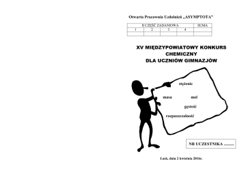 Otwarta Pracownia Uzdolnień „ASYMPTOTA” 1 II CZĘŚĆ ZADANIOWA 2 3 SUMA 4 XV MIĘDZYPOWIATOWY KONKURS CHEMICZNY DLA UCZNIÓW GIMNAZJÓW stężenie masa mol gęstość rozpuszczalność NR UCZESTNIKA .......... Łask, dnia 2 kwietnia 2016r. Część II zadania Przy rozwiązywaniu zadań uczestnik konkursu może korzystać z układu okresowego pierwiastków oraz kalkulatora. Czas przeznaczony na rozwiązywanie zadań wynosi 60 minut. Do rozwiązania są 4 zadania rachunkowe. Zadanie 1 [ 6 pkt.] Pewien związek chemiczny zawiera 44,83% potasu, 18,39% siarki i tlen, a jego masa cząsteczkowa wynosi 174 u. Podaj wzór chemiczny i nazwę tego związku wiedząc, że wzór najprostszy jest równocześnie wzorem rzeczywistym. NOTATKI Zadanie 2 [ 7 pkt.] 500g roztworu Pb(NO3)2 nasyconego w temperaturze 363K schłodzono do temperatury 313K. Oblicz: a) ile gramów soli wykrystalizowało, b) stężenie procentowe roztworu nasyconego, który pozostał po schłodzeniu. Rozpuszczalność tego związku w temp. 363K wynosi 128g, a w temp. 313K wynosi 78g. Zadanie 3 [ 3 pkt.] Oblicz stężenie procentowe roztworu powstałego przez działanie 0,4 g wapnia na 399,62 g wody. Zadanie 4 [4 pkt.] Po eksplozji 35 cm3 mieszaniny wodoru z tlenem pozostało 5 cm3 wodoru. Oblicz, jaki procent objętościowy tlenu zawierała mieszanina gazów przed reakcją.