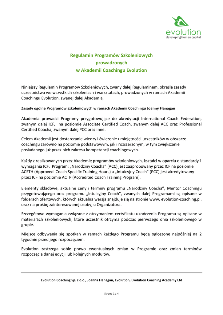 RegulaminProgramówSzkoleniowych prowadzonych wAkademiiCoachinguEvolution NiniejszyRegulaminProgramówSzkoleniowych,zwanydalejRegulaminem,określazasady uczestnictwawewszystkichszkoleniachiwarsztatach,prowadzonychwramachAkademii CoachinguEvolution,zwanejdalejAkademią. ZasadyogólneProgramówszkoleniowychwramachAkademiiCoachinguJoannyFlanagan Akademia prowadzi Programy przygotowujące do akredytacji International Coach Federation, zwanym dalej ICF, na poziomie Associate Certified Coach, zwanym dalej ACC oraz Professional CertifiedCoacha,zwanymdalejPCCorazinne. CelemAkademiijestdostarczaniewiedzyićwiczenieumiejętnościuczestnikówwobszarze coachinguzarównonapoziomiepodstawowym,jakirozszerzonym,wtymzwiększanie posiadanegojużprzeznichzakresukompetencjicoachingowych. KażdyzrealizowanychprzezAkademięprogramówszkoleniowych,kształciwoparciuostandardyi wymaganiaICF.Program:„NarodzinyCoacha”(ACC)jestzaaprobowanyprzezICFnapoziomie ACSTH(ApprovedCoachSpecificTrainingHours)a„IntuicyjnyCoach”(PCC)jestakredytowany przezICFnapoziomieACTP(AccreditedCoachTrainingProgram). Elementy składowe, aktualne ceny i terminy programu „Narodziny Coacha”, Mentor Coachingu przygotowującego oraz programu „Intuicyjny Coach”, zwanych dalej Programami są opisane w folderachofertowych,którychaktualnawersjaznajdujesięnastroniewww.evolution-coaching.pl. oraznaprośbęzainteresowanejosoby,uOrganizatora. SzczegółowewymaganiazwiązanezotrzymaniemcertyfikatuukończeniaProgramusąopisanew materiałach szkoleniowych, które uczestnik otrzyma podczas pierwszego dnia szkoleniowego w grupie. Miejsce odbywania się spotkań w ramach każdego Programu będą ogłoszone najpóźniej na 2 tygodnieprzedjegorozpoczęciem. Evolution zastrzega sobie prawo ewentualnych zmian w Programie oraz zmian terminów rozpoczęciadanejedycjilubkolejnychmodułów. EvolutionCoachingSp.zo.o.,JoannaFlanagan,Evolution,EvolutionCoachingAcademyLtd Strona1z4 Zgłoszenieizasadypłatności Uczestnikiem Programu może być osoba, która zapozna się i zaakceptuje niniejszy regulamin uczestnictwaorazotrzymapisemnepotwierdzenieprzyjęciadoprogramuwysłanedrogąmailową przezJoannęFlanagan. Zgłoszenia swojego uczestnictwa należy dokonać drogą e-mailową lub przez formularz zgłoszeniowyzamieszczonynastronieinternetowej(www.evolution-coaching.pl). Wmomenciedokonaniazgłoszeniaosobazapisywanajestnalistęosóbzainteresowanych. Po zgłoszeniu swojego uczestnictwa, rezerwacji miejsca w danej edycji Programu dokonuje się poprzez wpłatę bezzwrotnej zaliczki w wysokości wskazanej w folderze ofertowym danego programu. Rezerwacja jest ważna do czasu upłynięcia ostatecznego terminu wpłaty całości opłaty za dany Programpodanejwfolderzeofertowymdanegoprogramu. lubwręczonyuczestnikowinazajęciach. W przypadku braku płatności w terminie podanym na fakturze, uczestnik może utracić zaliczkę i zostaćusuniętyzlisty,anajegomiejscemożezostaćwpisanaosobazlistyrezerwowej. Cena Programu ujęta w aktualnym cenniku nie zawiera kosztów przejazdu, noclegu, parkingu, zawieranatomiastkosztmateriałówszkoleniowychwformieelektronicznej,lunchuoraznapojów jakkawa/herbatawprzerwachszkolenia. W przypadku pisemnej rezygnacji z Programu, nie później niż na 21 dni przed terminem rozpoczęcia,uczestniknabywaprawodouczestnictwawprogramie,winnymodpowiadającymmu terminie wciągu 12 kolejnych miesięcy. Możliwa jest tylko jedna zmiana rezerwacji terminu uczestnictwawdanymProgramie. W przypadku pisemnej rezygnacji z Programu, nie później niż na 30 dni przed terminem rozpoczęciasięprogramu,uczestnikmożeubiegaćsięozwrotwpłaconejkwoty,pomniejszonejo zaliczkę. W przypadku pisemnej rezygnacji z Programu, nie później niż na 21 dni przed terminem rozpoczęcia się programu, uczestnik może ubiegać się o zwrot wpłaconej opłaty za Program, w wysokości50%jejwartości,pomniejszonejozaliczkę. Brak pisemnej rezygnacji lub rezygnacja później niż na 21 dni przed terminem rozpoczęcia się Programu,spowodujeobciążeniepełnymikosztamiuczestnictwa. EvolutionCoachingSp.zo.o.,JoannaFlanagan,Evolution,EvolutionCoachingAcademyLtd Strona2z4 EvolutionzastrzegasobieprawodoodwołaniadanejedycjiProgramuzprzyczynniezależnych,w tymniezebraniasięgrupyminimum6uczestników.WprzypadkuodwołaniaProgramu,Evolution zwróci uczestnikom pełną kwotę dokonanej wpłaty za uczestnictwo, łącznie z wpłaconą zaliczką lubnażyczeniewystawizaświadczenieuprawniającedoudziałuwProgramiewinnymterminie. Zasadyuczestniczeniawzajęciachprogramu Uczestników kursów obowiązuje znajomość i zastosowanie się do następujących zasad uczestniczeniawzajęciach: Prowadzący i uczestnicy zobowiązują się do dyskrecji i poszanowania prywatności innych uczestników,zwłaszcza,gdyomawianećwiczeniaprzyjmująosobistycharakter. Uczestnicy wraz z prowadzącymi starają się stworzyć atmosferę wsparcia i otwartości, aktywnie angażują się w ćwiczenia iczęści warsztatowe programu, dając sobie wzajemnie prawo do popełnianiabłędówigotowościuczeniasiędziękinim. Organizatorzy programu mogą poprosić uczestników o zgodę na nagranie fragmentów sesji i o zgodęnarozpowszechnianietychnagrańwśrodkachmasowegoprzekazuwcelachedukacyjnych. Uczestnikprogramumaprawonieudzielićtakiejzgody. Oduczestnikówprogramuoczekujemypunktualności. Używanie telefonów komórkowych podczas sesji jest zabronione, podobnie jak nagrywanie sesji lubjejfragmentówbezzgodyorganizatoraipozostałychuczestników. ZasadyzaliczeniaprogramuiuzyskaniacertyfikatuAkademiiCoachinguEvolution ProgramkończysięcertyfikatemAkademiiCoachinguEvolution W szczególnych przypadkach, gdy dany Program jest wymaganym elementem do uzyskania akredytacji w ICF, uzyskany przez uczestnika Certyfikat jest potwierdzeniem, że osoba odbyła wymaganą ilość godzin szkolenia zgodnego ze standardami iwymaganiami ICF, koniecznego do akredytacji ICF, w przypadku programu „Narodziny Coacha” będzie to certyfika