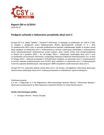 Raport EBI nr 6/2014 2014-02-27 Podjęcie uchwały o dokonaniu przydziału akcji serii C Zarząd CSY S.A. (dalej "Spółka", "Emitent") informuje, iż działając na podstawie art. 439 § 1 KSH, w związku z podjęciem przez Nadzwyczajne Walne Zgromadzenie uchwały nr 4 z dnia 21 października 2013 roku w sprawie podwyższenia kapitału zakładowego Spółki w drodze emisji akcji zwykłych na okaziciela serii C, realizowanej w ramach subskrypcji zamkniętej z zachowaniem przez dotychczasowych akcjonariuszy prawa poboru akcji nowej emisji oraz przeprowadzonej w dniach od 2 grudnia 2013 r. do 18 lutego 2014 r. subskrypcji zamkniętej akcji serii C oraz na podstawie otrzymanych informacji z Krajowego Depozytu Papierów Wartościowych S.A. w dniu 27 lutego 2014 r. dokonał przydziału 3.579.028 akcji zwykłych na okaziciela serii C zrealizowanych w formie zapisów podstawowych oraz 20.972 akcji zwykłych na okaziciela serii C zrealizowanych w formie zapisów dodatkowych, stanowiących 100% wszystkich zaoferowanych akcji serii C. Zarząd CSY S.A. stwierdza dojście emisji akcji serii C do skutku. Szczegółowe informacje dotyczące zakończonej subskrypcji akcji serii C zostaną przekazane w oddzielnym raporcie bieżącym. Podstawa prawna: § 3 ust. 1 Załącznika nr 3 do Regulaminu Alternatywnego Systemu Obrotu "Informacje Bieżące i Okresowe przekazywane w Alternatywnym Systemie Obrotu na rynku NewConnect". Osoby reprezentujące spółkę: • Grzegorz Wrona - Prezes Zarządu