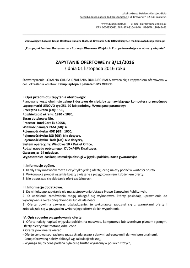 Lokalna Grupa Działania Dunajec-Biała Siedziba, biuro i adres do korespondencji: ul. Browarki 7, 32-840 Zakliczyn www.dunajecbiala.pl e-mail: [email protected] KRS: 0000250022, NIP: 873-310-48-40, REGON: 120246461 ___________________________________________________________________________ Zamawiający: Lokalna Grupa Działania Dunajec-Biała, ul. Browarki 7, 32-840 Zakliczyn, e-mail: [email protected] „Europejski Fundusz Rolny na rzecz Rozwoju Obszarów Wiejskich: Europa inwestująca w obszary wiejskie” ZAPYTANIE OFERTOWE nr 3/11/2016 z dnia 01 listopada 2016 roku Stowarzyszenie LOKALNA GRUPA DZIAŁANIA DUNAJEC-BIAŁA zwraca się z zapytaniem ofertowym w celu określenia kosztów: zakup laptopa z pakietem MS OFFICE. I. Opis przedmiotu zapytania ofertowego: Planowany koszt obejmuje zakup i dostawę do siedziby zamawiającego komputera przenośnego Laptop marki LENOVO typ Z51-70 lub podobny. Wymagane parametry: Przekątna ekranu [cal]: 15.6, Rozdzielczość ekranu: 1920 x 1080, Ekran dotykowy: Nie, Procesor: Intel Core i3-5005U, Wielkość pamięci RAM [GB]: 4, Pojemność dysku HDD [GB]: 1000, Pojemność dysku SSD [GB]: Nie dotyczy, Pojemność dysku Flash [GB]: Nie dotyczy, System operacyjny: Windows 10 + Pakiet Office, Rodzaj napędu optycznego: DVD+/-RW Dual Layer, Gwarancja: 24 miesiące, Wyposażenie: Zasilacz, Instrukcja obsługi w języku polskim, Karta gwarancyjna II. Informacje ogólne. 1. Każdy z wykonawców może złożyć tylko jedną ofertę, cenę należy podać w wartości brutto. 2. Wykonawca ponosi wszelkie koszty związane z przygotowaniem i złożeniem oferty. 3. Nie dopuszcza się składania ofert częściowych. III. Informacje dodatkowe. 1. Do niniejszego zapytania nie ma zastosowania Ustawa Prawo Zamówień Publicznych. 2. O udzielenie zamówienia mogą ubiegać się wykonawcy, którzy posiadają uprawnienia do wykonywania określonej czynności lub działalności. 3. Oferta powinna zawierać oświadczenie, że wykonawca zapoznał się z warunkami oferty i zobowiązuje się w przypadku wyboru jego oferty do ich wypełnienia. IV. Opis sposobu przygotowania oferty. 1. Ofertę należy napisać w języku polskim na maszynie, komputerze lub czytelnym pismem ręcznym. Oferty nieczytelne zostaną odrzucone. 2.Oferta powinna zawierać: - Ofertę cenową sporządzoną przez składającego z danymi adresowymi i danymi personalnymi, - Cenę oferowaną należy obliczyć wg kalkulacji własnej, - Wymaga się by cena podana była ceną brutto wyrażoną w polskich złotych, V. Kryteria oceny oferty. Przy wyborze oferty zamawiający będzie się kierował1: a) ceną złożonej oferty. b) jakością wykonania usługi/towaru, c) czasem realizacji, d) doświadczenie w danej branży VI. Czas realizacji. Listopad 2016 roku VII. Unieważnienie postępowania. Zamawiający unieważni postępowanie, w przypadku brak wpływu jakiejkolwiek oferty lub gdy cena najkorzystniejszej oferty przewyższa kwotę, którą Zamawiający może przeznaczyć na sfinansowanie zamówienia lub wystąpi istotna zmiana okoliczności powodująca, że wykonanie zadania będzie niemożliwe, a czego nie można było przewidzieć na etapie prowadzonego postępowania ofertowego. VIII. Termin i miejsce składania ofert Ofertę należy złożyć do 14 listopada 2016 roku do godz. 14:00 włącznie. Ofertę można składać mailem lub w formie papierowej na adres Stowarzyszenia: Lokalna Grupa Działania Dunajec-Biała, ul. Browarki 7, 32-840 Zakliczyn, w formie elektronicznej skan pdf na adres e-mail: [email protected], Tel / 14 665 37 37. Oferty złożone po terminie nie będą brane pod uwagę. Uprzejmie informujemy, że: - zastrzegamy sobie prawo do swobodnego wyboru oferty oraz do unieważnienia konkursu ofert bez podania przyczyny - nie ponosimy kosztów związanych z przedstawieniem oferty - w przypadku nadesłania niekompletnej oferty zastrzegamy sobie prawo jej odrzucenia bez poinformowania oferenta Zamówienie będzie udzielone zgodnie z zasada konkurencyjności i nie podlega przepisom ustawy Prawo zamówień publicznych. Zapytanie jest wysyłane do potencjalnych oferentów, oraz zamieszczone na stronie internetowej celem wybrania najkorzystniejszej oferty. Zapytanie ofertowe służy rozeznaniu rynku i nie zobowiązuje stowarzyszenia do złożenia Zamówienia. 1 Niepotrzebne skreślić Załącznik nr 1 do zapytania ofertowego nr 3/11/2016 z dnia 01 listopada 2016 roku FORMULARZ OFERTOWY I. NAZWA I ADRES ZAMAWIAJĄCEGO LOKALNA GRUPA DZIAŁANIA DUNAJEC-BIAŁA z siedzibą w Zakliczynie przy ul. Browarki 7, 32-840 Zakliczyn, wpisaną do rejestru stowarzyszeń Krajowego Rejestru Sądowego pod numerem KRS 0000250022 II. DANE DOTYCZĄCE OFERENTA Imię i nazwisko/ Nazwa …………………………………………………………………………………………………………..……………….…… Adres: ……………………………………………………………………………………………………………………………………………………….….. Nr telefonu ….……………………………………………… E – mail ……………………………………..………………….………………………. Osoba upoważniona do kontaktu ………………………………………………...…………………………………………………..…….…… III. PRZEDMIOT ZAMÓWIENIA Dotyczy: zakupu laptopa z pakietem MS OFFICE. IV. SPECYFIKACJA ZAMÓWIENIA Zgodnie z pkt I zapytania ofertowego nr 3/11/2016 z dnia 01 listopada 2016 roku V. CENA Oferuję wykonanie przedmiotu zamówienia za cenę brutto ……………………………….……….. zł (słownie:…………………………………………………………………………………………………………………………………..………………....). VI. 1. 2. OŚWIADCZENIE OFERENTA: Oświadczam, że akceptuję wszystkie warunki zawarte w zapytaniu ofertowym n