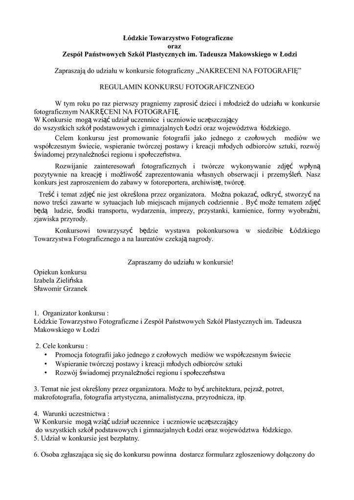 Łódzkie Towarzystwo Fotograficzne oraz Zespół Państwowych Szkół Plastycznych im. Tadeusza Makowskiego w Łodzi Zapraszają do udziału w konkursie fotograficzny „NAKRECENI NA FOTOGRAFIĘ” REGULAMIN KONKURSU FOTOGRAFICZNEGO W tym roku po raz pierwszy pragniemy zaprosić dzieci i młodzież do udziału w konkursie fotograficznym NAKR ĘCENI NA FOTOGRAFI Ę. W Konkursie mogą wziąć udział uczennice i uczniowie uczęszczający do wszystkich szkół podstawowych i gimnazjalnych Ł odzi oraz województwa łódzkiego. Celem konkursu jest promowanie fotografii jako jednego z czołowych mediów we współczesnym świecie, wspieranie twórczej postawy i kreacji młodych odbiorców sztuki, rozwój świadomej przynależności regionu i społeczeństwa. Rozwijanie zainteresowań fotograficznych i twórcze wykonywanie zdjęć wpłyną pozytywnie na kreację i możliwość zaprezentowania własnych obserwacji i przemyśleń. Nasz konkurs jest zaproszeniem do zabawy w fotoreportera, archiwistę, twórcę. Treść i temat zdjęć nie jest określona przez organizatora. Można pokazać, odkryć, stworzyć na nowo treści zawarte w sytuacjach lub miejscach mijanych codziennie . Być może tematem zdjęć będą ludzie, środki transportu, wydarzenia, imprezy, przystanki, kamienice, formy wyobraźni, zjawiska przyrody. Konkursowi towarzyszyć będzie wystawa pokonkursowa w siedzibie Łódzkiego Towarzystwa Fotograficznego a na laureatów czekają nagrody. Zapraszamy do udziału w konkursie! Opiekun konkursu Izabela Zielińska Sławomir Grzanek 1. Organizator konkursu : Łódzkie Towarzystwo Fotograficzne i Zespół Państwowych Szkół Plastycznych im. Tadeusza Makowskiego w Łodzi 2. Cele konkursu : • Promocja fotografii jako jednego z czołowych mediów we współczesnym świecie • Wspieranie twórczej postawy i kreacji młodych odbiorców sztuki • Rozwój świadomej przynależności regionu i społeczeństwa 3. Temat nie jest określony przez organizatora. Może to być architektura, pejzaż, potret, makrofotografia, fotografia artystyczna, animalistyczna, przyrodnicza, itp. 4. Warunki uczestnictwa : W Konkursie mogą wziąć udział uczennice i uczniowie uczęszczający do wszystkich szkół podstawowych i gimnazjalnych Ł odzi oraz województwa łódzkiego. 5. Udział w konkursie jest bezpłatny. 6. Osoba zgłaszająca się się do konkursu powinna dostarcz formularz zgłoszeniowy dołączony do regulaminu wraz z podpisem opiekuna prawnego wyrażającym zgodę na uczestnictwo nieletniego w konkursie, który można pobrać wraz z regulaminem ze strony ŁTF lub ZPSP 7. Uczestnicy konkursu składając swoje zdjęcia wyrażają tym samym zgodę na przetwarzanie przez organizatorów swoich danych na potrzeby konkursu oraz na prezentację zdjęć w formie pokonkursowej. Zdjęcia nagrodzone przechodzą na własność organizatora. Zdjęcia zakwalifikowane do wystawy pokonkursowej będą do odbioru po wystawie w siedzibie Łódzkiego Towarzystwa Fotograficznego. 8. Nadesłanie zdjęć do organizatora jest jednoznaczne z przyjęciem warunków niniejszego regulaminu. 9. Parametry zdjęć : Zdjęcia rozpatrywane będą w dwóch kategoriach Kategoria I: Uczniowie szkół podstawowych: zdjęcia w formacie 15 cm x 21 cm Kategoria II: Uczniowie szkół gimnazjalnych zdjęcia w formacie 20 cm x 30 cm 10. Uczestnik może zgłosić do Konkursu maksymalnie trzy zdjęcia. Każda fotografia musi być podpisana kategorią, imieniem, nazwiskiem, nazwą szkoły. Fotografie kserowane lub skanowane nie będą oceniane. Oceniane będą tylko zdjęcia, które zostaną wywołane lub wydrukowane na papierze fotograficznym. 11. Terminy konkursu. Liczy się termin dostarczenia prac. Termin składania prac upływa dnia 03.11.2015 r. Obrady Jury: 06.11.2015 r. Wystawa pokonkursowa w siedzibie ŁTF: 24.11-12.12.2015 r. 12. Miejsce składania prac i informację organizacyjne: Zdjęcia wraz z formularzem powinny być dostarczone do siedziby ŁTF: osobiście od poniedziałku do piątku w godzinach 10.00-18.00 lub mogą zostać przesłane do ŁTF ul Piotrkowska 102 Łódź 90-004, tel. 42 6330982, e-mail; [email protected] Sposób dostarczenia zdjęć: Prosimy o zabezpieczenie zdjęć w sztywnych płaskich opakowaniach, chroniących przed uszkodzeniem. 13. Jury konkursu :Przy ocenie prac jury oceniać będzie pomysłowość, estetykę wykonania, jakość wykonania. 14. W skład Jury wchodzą członkowie Ł ódzkiego Towarzystwa Fotograficznego, Związku Polskich Artystów Plastyków i Związku Polskich Artystów Fotografików 15. Prace konkursowe i rozstrzygnięcie konkursu: Przyznane będą nagrody i wyróżnienia. 16. Osoby nagrodzone zostaną powiadomione telefonicznie. 17. Wyniki konkursu zostaną zamieszczone na stronie: www.ltf.com.pl i www.plastyklodz.pl 18. Postanowienia końcowe : Organizator nie ponosi odpowiedzialności za działanie osób trzecich, związane z organizacją konkursu oraz szkody związane z podaniem błędnych lub nieaktualnych danych przez uczestników konkursu. Decyzje Komisji Konkursowej są ostateczne. KARTA ZGŁOSZENIA Imię Nazwisko.............................................................................................................................. Telefon szkoły lub kontaktowy.................................................................................................... Adres e-mail................................................................................................................................ Adres szkoły …............................................................................................................................. Lp Tytuł fotografii Uwagi Imię i nazwisko nauczyciela lub opiekuna ............................................................................ podpis autora prac