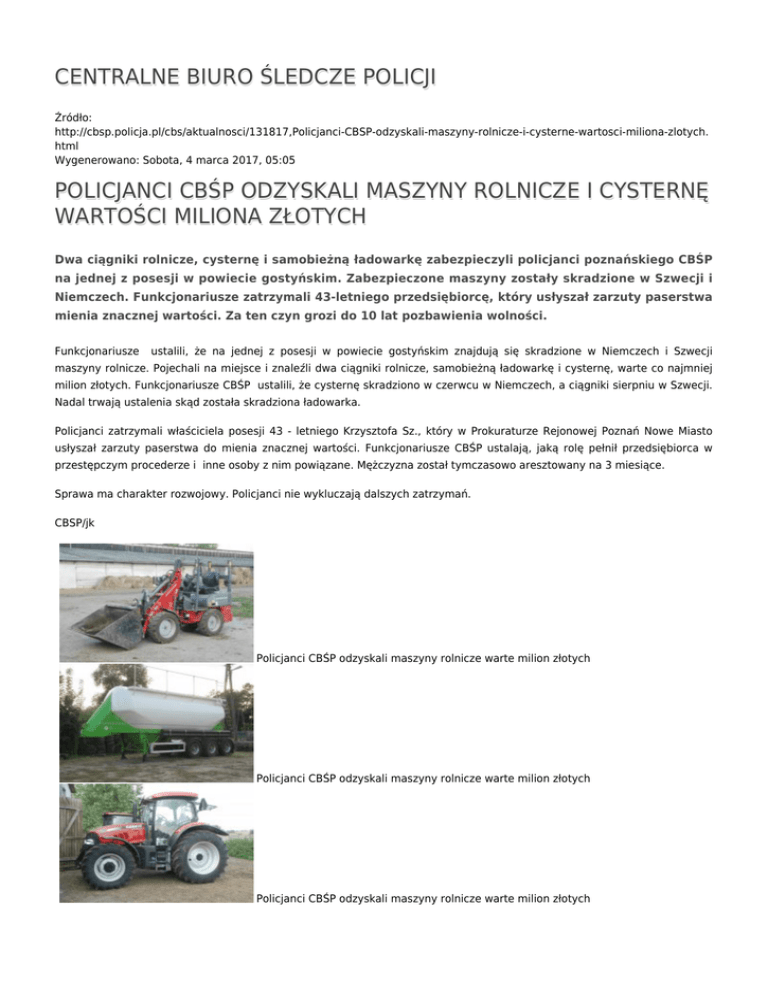 CENTRALNE BIURO ŚLEDCZE POLICJI Źródło: http://cbsp.policja.pl/cbs/aktualnosci/131817,Policjanci-CBSP-odzyskali-maszyny-rolnicze-i-cysterne-wartosci-miliona-zlotych. html Wygenerowano: Sobota, 4 marca 2017, 05:05 POLICJANCI CBŚP ODZYSKALI MASZYNY ROLNICZE I CYSTERNĘ WARTOŚCI MILIONA ZŁOTYCH Dwa ciągniki rolnicze, cysternę i samobieżną ładowarkę zabezpieczyli policjanci poznańskiego CBŚP na jednej z posesji w powiecie gostyńskim. Zabezpieczone maszyny zostały skradzione w Szwecji i Niemczech. Funkcjonariusze zatrzymali 43-letniego przedsiębiorcę, który usłyszał zarzuty paserstwa mienia znacznej wartości. Za ten czyn grozi do 10 lat pozbawienia wolności. Funkcjonariusze ustalili, że na jednej z posesji w powiecie gostyńskim znajdują się skradzione w Niemczech i Szwecji maszyny rolnicze. Pojechali na miejsce i znaleźli dwa ciągniki rolnicze, samobieżną ładowarkę i cysternę, warte co najmniej milion złotych. Funkcjonariusze CBŚP ustalili, że cysternę skradziono w czerwcu w Niemczech, a ciągniki sierpniu w Szwecji. Nadal trwają ustalenia skąd została skradziona ładowarka. Policjanci zatrzymali właściciela posesji 43 - letniego Krzysztofa Sz., który w Prokuraturze Rejonowej Poznań Nowe Miasto usłyszał zarzuty paserstwa do mienia znacznej wartości. Funkcjonariusze CBŚP ustalają, jaką rolę pełnił przedsiębiorca w przestępczym procederze i inne osoby z nim powiązane. Mężczyzna został tymczasowo aresztowany na 3 miesiące. Sprawa ma charakter rozwojowy. Policjanci nie wykluczają dalszych zatrzymań. CBSP/jk Policjanci CBŚP odzyskali maszyny rolnicze warte milion złotych Policjanci CBŚP odzyskali maszyny rolnicze warte milion złotych Policjanci CBŚP odzyskali maszyny rolnicze warte milion złotych Ocena: 4.1/5 (7) Tweetnij paserstwo, kradzieże