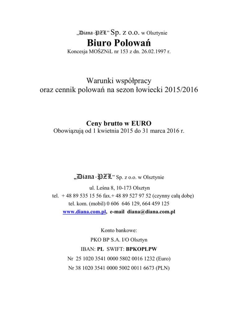 „Diana-PZL” Sp. z o.o. w Olsztynie Biuro Polowań Koncesja MOŚZNiL nr 153 z dn. 26.02.1997 r. Warunki współpracy oraz cennik polowań na sezon łowiecki 2015/2016 Ceny brutto w EURO Obowiązują od 1 kwietnia 2015 do 31 marca 2016 r. „Diana-PZL” Sp. z o.o. w Olsztynie ul. Leśna 8, 10-173 Olsztyn tel. + 48 89 535 15 56 fax.+ 48 89 527 97 52 (czynny całą dobę) tel. kom. (mobil) 0 606 646 129, 664 459 125 www.diana.com.pl, e-mail [email protected] Konto bankowe: PKO BP S.A. I/O Olsztyn IBAN: PL SWIFT: BPKOPLPW Nr 25 1020 3541 0000 5802 0016 1232 (Euro) Nr 38 1020 3541 0000 5002 0011 6673 (PLN) SPIS TREŚCI I. Podstawowe warunki współpracy . . . . . . . . 3 II. Informacje dodatkowe . . . . . . . . . . . . . . . . . .5 III. Świadczenia pobytowe. . . . . . . . . . . . . . . . . 7 IV. Organizacja polowania . . . . . . . . . . . . . . . 8 V. Inne opłaty i usługi . . . . . . . . . . . . . . . . . . . . 9 VI. Gatunki zwierzyny, odstrzały, trofea. . . . . .10 CENNIK POLOWAŃ DLA CUDZOZIEMCÓW Cennik reguluje zasady współpracy oraz ceny i warunki organizacji polowań pomiędzy „Diana-PZŁ” Sp. z o.o. w Olsztynie (Biurem Polowań), dysponentami terenów łowieckich (koła łowieckie, Ośrodki Hodowli Zwierzyny - OHZ) i Zagranicznymi Biurami Polowań (ZBP) oraz myśliwymi zagranicznymi polującymi w ramach tzw. akwizycji własnej. Ceny zawarte w niniejszym cenniku stanowią podstawę do rozliczeń pomiędzy „Diana-PZŁ” Sp. z o. o. a stronami uczestniczącymi w polowaniu. 2 I. PODSTAWOWE WARUNKI WSPÓŁPRACY A. Zasady ogólne. l. „DIANA-PZŁ” Sp. z o.o. w Olsztynie, zwane dalej Biurem Polowań (BP), jest pośrednikiem pomiędzy dysponentami terenów łowieckich zwanych dalej dysponentami a klientem zagranicznym w zakresie organizacji, realizacji i rozliczania polowań w Polsce. 2. Biuro polowań oferuje klientom zagranicznym organizację polowania na terenach łowieckich dysponentów na warunkach określonych w niniejszym CENNIKU POLOWAŃ albo zgodnie z zawartą umową lub kontraktem. 3. Biuro polowań przyjmuje od dysponenta deklarację-ofertę zorganizowania polowania na określoną liczbę zwierzyny danego gatunku na warunkach określonych w cenniku, wyłącznie do sprzedaży komisowej. Dysponent określa również jakość trofeów możliwych do pozyskania w ramach polowania. 4. ZBP lub myśliwy zagraniczny zamawia polowanie określając termin polowania, i preferowany rodzaj kwatery. Określa również interesujące go gatunki zwierzyny, spodziewaną wielkość trofeów oraz preferowany sposób polowania. 5. Biuro polowań nie będzie organizowało polowań dla klientów zagranicznych w następujących terminach: - w okresie Świąt Wielkanocnych - 1 i 2 listopada - 24, 25, 26 grudnia ( Święta Bożego Narodzenia ). 6. Przy obsłudze polowania dla obcokrajowca wskazana jest obecność tłumacza. Szczegółowe zasady jego zatrudnienia są podane na str. 8 niniejszego cennika. Przy organizacji polowań zbiorowych obecność tłumacza jest obowiązkowa. 7. Od ogólnej sumy brutto należności za polowanie, wyliczonej na podstawie niniejszego cennika (bez ubezpieczenia i kosztów manipulacyjnych) Biuro Polowań – Diana–PZŁ pobiera prowizję w wysokości 10 % w przypadku akwizycji własnej lub 15 % w przypadku pośrednictwa ZBP. B. Zamówienia, zmiany, anulowania, opłaty karne l. Biuro polowań zamawia u dysponenta polowanie w ramach złożonej przez niego deklaracji-oferty nie później niż 7 dni przed planowaną datą rozpoczęcia polowania. Realizacja zamówienia złożonego w terminie późniejszym będzie wymagała każdorazowo uprzedniej zgody dysponenta. 2. Biuro polowań ma prawo dokonywania zmiany terenów, liczby myśliwych, programu imprezy lub anulowania całej imprezy najpóźniej na 3 dni przed datą rozpoczęcia polowania bez ponoszenia kosztów. 3. Po uzgodnieniu szczegółowych warunków polowania BP przesyła myśliwemu lub ZBP Voucher (tj. dokument potwierdzający rezerwację polowania) Adresat Voucheru jest zobowiązany w terminie 3 tygodni wpłacić zaliczkę w wysokości określonej przez Biuro Polowań na podstawie złożonego zamówienia i niniejszego 3 cennika po uwzględnieniu rodzaju polowania oraz długości pobytu. Kopię Voucheru otrzymuje wraz z zamówieniem polowania również dysponent łowiska. 4. W przypadku anulowania polowania przez myśliwego: a) w terminie do 2 tygodni przed planowanym terminem polowania następuje zwrot wpłaconej zaliczki pomniejszonej o koszt przelewu bankowego. b) w terminie krótszym niż 2 tygodnie przed planowanym terminem polowania biuro polowań potrąci i zatrzyma z wpłaconej zaliczki 50 Euro kosztów manipulacyjnych. c) w terminie krótszym niż 3 dni przed planowanym terminem polowania biuro polowań potrąci i zatrzyma z wpłaconej zaliczki koszt 2 dni zakwaterowania liczonego wg Kat. I oraz koszt 2 dni organizacji polowania wg zamówienia. 5. W przypadku niedotrzymania przez ZBP lub myśliwego zagranicznego polującego w ramach akwizycji własnej terminu i warunków określonych w pkt 3. BP ma prawo odmówić przeprowadzenia zamówionego polowania. 6. Ewentualne koszty ponoszone przez dysponenta przy anulowaniu imprezy w okresie 3 dni poprzedzających polowanie lub opóźnieniu przyjazdu myśliwego(-ych) będą rekompensowane przez BP do wysokości uzgodnionej przez biuro polowań i dysponenta, jednak nie większej niż 80 % kosztów określonych w pkt. 4 lit. c 7. Jeżeli myśliwy zagraniczny dokona bezprawnego odstrzału zwierzyny ( np. w okresie ochronnym, lub gatunku podlegającego ochronie), stosuje się opłaty określone w rozporządzeniu Ministra Środowiska z dnia 21.06.2005 r. w sprawie zwierzyny bezprawnie pozyskanej. W przypadku dokonania odstrzału bez zgody podprowadzającego ( członka PZŁ wydelegowanego przez dysponenta do wskazania zwierzyny do odstrzału) myśliwy zagraniczny wpłaca 200 % ceny należnej za odstrzał danej zwierzyny i określonej w niniejszym cenniku. W 