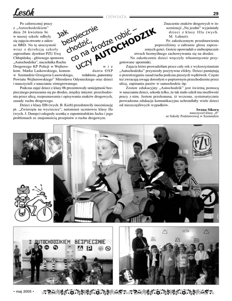 oświata Po całorocznej pracy z „Autochodzikiem” dnia 26 kwietnia br. w naszej szkole odbyły się zajęcia otwarte z zakresu BRD. Na tę uroczystość wraz z dyrekcją szkoły zaprosiłam: dyrektor PZU Ewę Chłopińską - głównego sponsora „Autochodzika”, naczelnika Ruchu Drogowego KP Policji w Wejherow i e kom. Marka Laskowskiego, komendanta OSP w Szemudzie Grzegorza Lasowskiego, redaktora „panoramy Powiatu Wejherowskiego” Mirosława Odynieckiego oraz dzieci i nauczycieli z nauczania zintegrowanego. Podczas zajęć dzieci z klasy 0b prezentowały umiejętność bezpiecznego poruszania się po drodze, między innymi: przechodzenia przez ulicę, rozpoznawania i opisywania znaków drogowych, zasady ruchu drogowego. Dzieci z klasy IIIb (wych. B. Kiełt) przedstawiły inscenizację pt. „Zwierzęta na wycieczce”, natomiast uczniowie klasy IIa (wych. J. Dampc) odegrały scenkę o zapominalskim Jacku i jego problemach ze znajomością przepisów o ruchu drogowym. 29 Znaczenie znaków drogowych w inscenizacji „Na jezdni” wyjaśniały dzieci z klasy IIIa (wych. M. Lekner). Po zakończonym przedstawieniu popro siliśmy o zabranie głosu zaproszonych gości. Goście opowiadali o niebezpieczeństwach bezmyślnego zachowywania się na drodze. Na zakończenie dzie ci wręczyły własnoręcznie przygotowane upominki. Zajęcia które prowadziłam przez cały rok z wykorzystaniem „Autochodzika” przyniosły pozytywne efekty. Dzieci pamiętają o przestrzeganiu zasad ruchu podczas pieszych wędrówek. Często też zwracają uwagę dorosłym o poprawnym przechodzeniu przez ulicę, zapinaniu pasów w samochodzie itp. Zestaw edukacyjny „Autochodzik” jest świetną pomocą w nauczaniu dzieci, szkoda tylko, że tak mało szkół ma możliwość pracy z nim. Jestem przekonana, iż wczesna, systematycznie prowadzona edukacja komunikacyjna uchroniłaby wiele dzieci od nieszczęśliwych wypadków. Iwona Sikora ie – n k z ć K i c a I J b e i Z o p r z D , e e ć i O z b dz od CH o r h d c a TO n co y AU cz u • maj 2005 • nauczyciel klasy „0” ze Szkoły Podstawowej w Szemudzie 30 kultura BIBLIOTEKA PUBLICZNA GMINY SZEMUD Z A P R A S Z A GODZINY OTWARCIA BIBLIOTEK: Szemud Poniedziałek Wtorek Środa Czwartek Piątek Sobota 11:00 - 20:00 11:00 - 20:00 nieczynne 11:00 - 20:00 11:00 - 20:00 11:00 - 16:00 OGŁOSZENIA Dnia 08.06.br. o godz.11.00. zapraszamy na spotkanie osoby specjalnej troski z okazji Dnia Dziecka * Kielno Poniedziałek Wtorek Środa Czwartek Piątek 10:00 - 17:00 10:00 - 17:00 nieczynne 10:00 - 17:00 11:00 - 18:00 Łebno Poniedziałek Wtorek Środa Czwartek Piątek 10:30 - 16:30 10:30 - 16:30 nieczynne 10:30 - 16:30 8:30 - 14:30 W bibliotece w Szemudzie można nabyć kasety i płyty DVD z przyjęcia I Komunii w parafii Szemud. * INTERNET Biblioteka w Szemudzie i Kielnie informuje, że w godzinach pracy biblioteki istnieje możliwość korzystania z Internetu przez czytelników i innych użytkowników. Biblioteka w Szemudzie ma dwa stanowiska komputerowe, które otrzymała w ramach ogólnopolskiego programu ikonk@. SERDECZNIE ZAPRASZAMY Biblioteka Publiczna w Kielnie organizuje naukę języka niemieckiego i angielskiego Informacje i zapisy w godzinach pracy biblioteki Bojano Poniedziałek Wtorek Środa Czwartek Piątek 11:00 - 14:00 14:00 - 17:00 nieczynne 11:00 - 14:00 14:00 - 17:00 Biblioteka Częstkowo Z powodu urlopu macierzyńskiego biblioteka nieczynna. Informacja o pełnieniu dyżurów ukaże się w następnym numerze Lesôka. SERDECZNIE ZAPRASZAMY WSZYSTKICH KOMBATANTÓW NASZEJ GMINY na spotkanie w dniu 22.06 (środa) o godz. 10.00 do Wiejskiego Ośrodka Kultury w Szemudzie Bronisława Licbarska (Będzie możliwość uregulowania składek na ww. spotkaniu) Ponadto: możliwość tłumaczenia z języka niemieckiego i na niemiecki oraz korepetycje Sprzedaż drzewek i krzewów owocowych i ozdobnych Szemud, ul. Wejherowska 18 codziennie w godz. 9.00 - 19.00 tel. 676 11 88 WIDEOFILMOWANIE Filmowanie imprez okolicznościowych (wesela, chrzty itp.) Filmy reklamowe, czołówki, nagrywanie płyt wszystkich formatów (DVD, DV, D8, SVCD), kopiowanie kaset wideo na DVD i odwrotnie. Montaż i wykonanie techniką cyfrowo-komputerową Biblioteka Szemud tel. 676 11 88, 676 12 20 Chcesz mieć stary VHS na DVD? - zadzwoń • maj • 2005 • 31 kultura PASOWANIE UCZNIÓW KLAS PIERWSZYCH NA CZYTELNIKA BIBLIOTEK PUBLICZNYCH GMINY SZEMUD Jak co roku we wszystkich Bibliotekach Publicznych naszej gminy miały miejsce doniosłe wydarzenia – pasowanie na czytelnika. Uczniowie klas pierwszych przybyli do bibliotek, które same swoim istnieniem świadczą o rozwoju kultury. Biblioteki bowiem są skarbnicą piśmiennictwa, przez które człowiek wyraża swój zmysł twórczy, inteligencję, znajomość świata i ludzi. W dniu 11 lutego br. do Biblioteki Publicznej w Łebnie przybyły dzieci z klasy I ze Szkoły Podstawowej w celu pasowania na czytelnika biblioteki. Z pewnością książka towarzyszyła im już niejednokrotnie w życiu. Najmłodsze dzieci szkolne bardzo chętnie przychodzą do bilioteki, czytają baśnie, które kształtują wyobraźnię. Chcą poznawać i oswajać świat i pragną, by był dobry i sprawiedliwy, a bohater zawsze odnosił zwycięstwo. Pragnęło by się, aby nowo pasowani uczniowie w przyszłości zaliczali się do aktywnych czytelników biblioteki. 4 i 9 marca br. uczniowie klas pierwszych wraz ze swoimi paniami, K. Grzonkowską i S. Telepko, brnęli przez zaśnieżone Kielno by dotrzeć do Biblioteki. Głównym celem tego spotkania było przygotowanie dzieci do świadomego, swobodnego i samodzielnego korzystania z pomieszczeń i zbiorów bibliotecznych. Dzieci zapoznały się także z nowymi pojęciami i ich znaczeniem. Następnie wszyscy obecni wzięli udział w konkursie, gdzie na podstawie cytatów ustalali, o jakie postaci chodzi i w jakich wierszach występują, po czym nastąpiło uroczyste pasowanie. Nowi czytelnicy ślubowali szanować ks