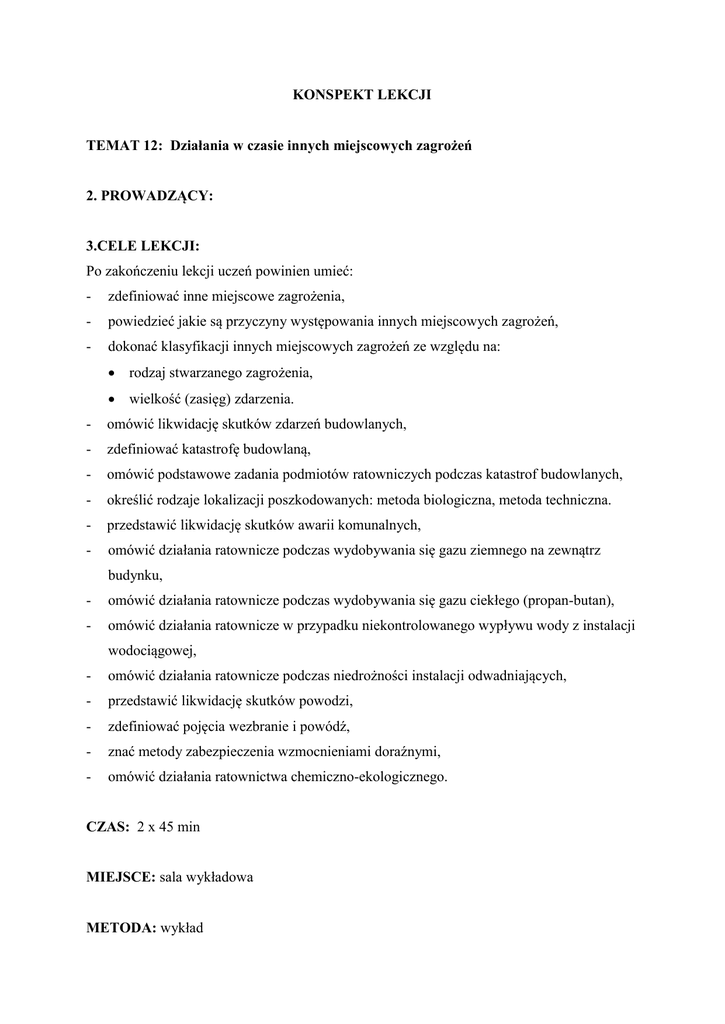 KONSPEKT LEKCJI TEMAT 12: Działania w czasie innych miejscowych zagrożeń 2. PROWADZĄCY: 3.CELE LEKCJI: Po zakończeniu lekcji uczeń powinien umieć: - zdefiniować inne miejscowe zagrożenia, - powiedzieć jakie są przyczyny występowania innych miejscowych zagrożeń, - dokonać klasyfikacji innych miejscowych zagrożeń ze względu na: rodzaj stwarzanego zagrożenia, wielkość (zasięg) zdarzenia. - omówić likwidację skutków zdarzeń budowlanych, - zdefiniować katastrofę budowlaną, - omówić podstawowe zadania podmiotów ratowniczych podczas katastrof budowlanych, - określić rodzaje lokalizacji poszkodowanych: metoda biologiczna, metoda techniczna. - przedstawić likwidację skutków awarii komunalnych, - omówić działania ratownicze podczas wydobywania się gazu ziemnego na zewnątrz budynku, - omówić działania ratownicze podczas wydobywania się gazu ciekłego (propan-butan), - omówić działania ratownicze w przypadku niekontrolowanego wypływu wody z instalacji wodociągowej, - omówić działania ratownicze podczas niedrożności instalacji odwadniających, - przedstawić likwidację skutków powodzi, - zdefiniować pojęcia wezbranie i powódź, - znać metody zabezpieczenia wzmocnieniami doraźnymi, - omówić działania ratownictwa chemiczno-ekologicznego. CZAS: 2 x 45 min MIEJSCE: sala wykładowa METODA: wykład POMOCE DYDAKTYCZNE: rzutnik multimedialny + prezentacja tematu PowerPoint Część Zagadnienia Czas lekcji I. Część wstępna: meldunek, sprawdzenie obecności II. III. Przedstawienie tematu i celu zajęć Część zasadnicza 1. Inne miejscowe zdarzenia definicja, przyczyny, 3 min 2 min 20 min klasyfikacja. 2. Likwidacja skutków zdarzeń budowlanych definicja, 15 min podstawowe zadania, rodzaje lokalizacji poszkodowanych. 3. Likwidacja skutków awarii komunalnych 15 min wydobywanie się gazu ziemnego, ciekłego, wypływ wody, niedrożność instalacji odwadniających. 4. Likwidacja skutków powodzi definicje, działania 25 min ratownicze, metody zabezpieczania doraźnego. 10 min 5. Działania ratownictwa chemiczno-ekologicznego IV. Część końcowa: Podsumowanie, czas na ewentualne pytania 5 min. Uwagi