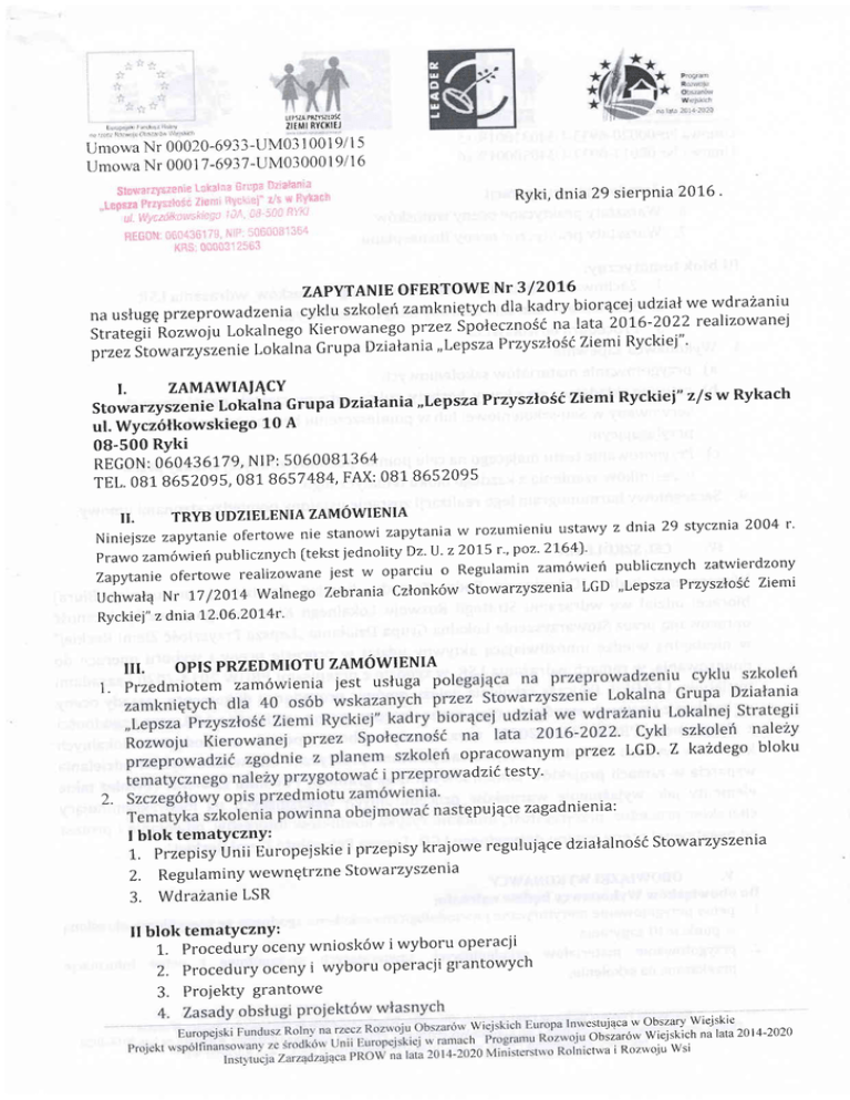 Zapytanie ofertowe nr 3/2016 - Lepsza Przyszłość Ziemi Ryckiej