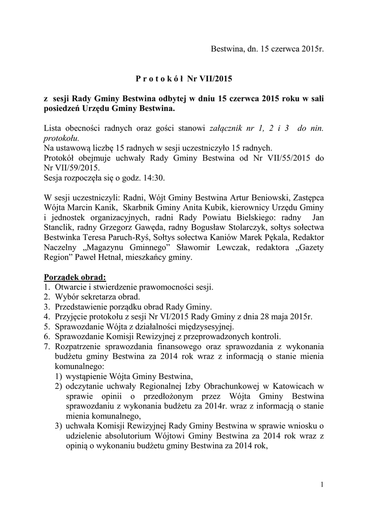 Bestwina, dn. 15 czerwca 2015r. P r o t o k ó ł Nr VII/2015 z sesji Rady Gminy Bestwina odbytej w dniu 15 czerwca 2015 roku w sali posiedzeń Urzędu Gminy Bestwina. Lista obecności radnych oraz gości stanowi załącznik nr 1, 2 i 3 do nin. protokołu. Na ustawową liczbę 15 radnych w sesji uczestniczyło 15 radnych. Protokół obejmuje uchwały Rady Gminy Bestwina od Nr VII/55/2015 do Nr VII/59/2015. Sesja rozpoczęła się o godz. 14:30. W sesji uczestniczyli: Radni, Wójt Gminy Bestwina Artur Beniowski, Zastępca Wójta Marcin Kanik, Skarbnik Gminy Anita Kubik, kierownicy Urzędu Gminy i jednostek organizacyjnych, radni Rady Powiatu Bielskiego: radny Jan Stanclik, radny Grzegorz Gawęda, radny Bogusław Stolarczyk, sołtys sołectwa Bestwinka Teresa Paruch-Ryś, Sołtys sołectwa Kaniów Marek Pękala, Redaktor Naczelny „Magazynu Gminnego” Sławomir Lewczak, redaktora „Gazety Region” Paweł Hetnał, mieszkańcy gminy. Porządek obrad: 1. Otwarcie i stwierdzenie prawomocności sesji. 2. Wybór sekretarza obrad. 3. Przedstawienie porządku obrad Rady Gminy. 4. Przyjęcie protokołu z sesji Nr VI/2015 Rady Gminy z dnia 28 maja 2015r. 5. Sprawozdanie Wójta z działalności międzysesyjnej. 6. Sprawozdanie Komisji Rewizyjnej z przeprowadzonych kontroli. 7. Rozpatrzenie sprawozdania finansowego oraz sprawozdania z wykonania budżetu gminy Bestwina za 2014 rok wraz z informacją o stanie mienia komunalnego: 1) wystąpienie Wójta Gminy Bestwina, 2) odczytanie uchwały Regionalnej Izby Obrachunkowej w Katowicach w sprawie opinii o przedłożonym przez Wójta Gminy Bestwina sprawozdaniu z wykonania budżetu za 2014r. wraz z informacją o stanie mienia komunalnego, 3) uchwała Komisji Rewizyjnej Rady Gminy Bestwina w sprawie wniosku o udzielenie absolutorium Wójtowi Gminy Bestwina za 2014 rok wraz z opinią o wykonaniu budżetu gminy Bestwina za 2014 rok, 1 4) odczytanie uchwały Regionalnej Izby Obrachunkowej w Katowicach w sprawie zaopiniowania wniosku Komisji Rewizyjnej Rady Gminy Bestwina, 5) opinia komisji stałych Rady Gminy Bestwina w sprawie wykonania budżetu gminy za 2014 rok, 6) dyskusja nad sprawozdaniami, 7) podjęcie uchwały w sprawie rozpatrzenia i zatwierdzenia sprawozdania finansowego i sprawozdania z wykonania budżetu Gminy Bestwina za 2014r., 8) podjęcie uchwały w sprawie udzielenia absolutorium Wójtowi Gminy Bestwina z tytułu wykonania budżetu gminy Bestwina za 2014 rok. 8. Rozpatrzenie projektu uchwały w sprawie przyjęcia planu gospodarki niskoemisyjnej dla Gminy Bestwina. 9. Informacje bieżące. 10.Wnioski i zapytania radnych oraz rad sołeckich. 11.Udzielenie odpowiedzi na wnioski i zapytania. 12.Zamknięcie sesji. Ad.1 Przewodniczący Rady Jerzy Stanclik przywitał serdecznie wszystkich radnych Rady Gminy Bestwina, Wójta Artura Beniowskiego oraz wszystkich obecnych na sali obrad wymienionych na wstępie. Otworzył VII sesję VII kadencji Rady Gminy. Na podstawie listy obecności radnych stwierdził prawomocność sesji, gdyż w sesji uczestniczyło 15 radnych na 15 radnych ustawowego składu Rady Gminy. Ad.2 Sekretarzem obrad, zgodnie z harmonogramem, jednogłośnie wybrany został radny Grzegorz Owczarz. Ad.3 Przewodniczący Rady Gminy Jerzy Stanclik przedstawił porządek obrad, który otrzymali wszyscy radni (zał. Nr 4 do nin. protokołu). 1. 2. 3. 4. 5. 6. 7. Otwarcie i stwierdzenie prawomocności sesji. Wybór sekretarza obrad. Przedstawienie porządku obrad Rady Gminy. Przyjęcie protokołu z sesji Nr VI/2015 Rady Gminy z dnia 28 maja 2015r. Sprawozdanie Wójta z działalności międzysesyjnej. Sprawozdanie Komisji Rewizyjnej z przeprowadzonych kontroli. Rozpatrzenie sprawozdania finansowego oraz sprawozdania z wykonania budżetu gminy Bestwina za 2014 rok wraz z informacją o stanie mienia komunalnego: 2 1) wystąpienie Wójta Gminy Bestwina, 2) odczytanie uchwały Regionalnej Izby Obrachunkowej w Katowicach w sprawie opinii o przedłożonym przez Wójta Gminy Bestwina sprawozdaniu z wykonania budżetu za 2014r. wraz z informacją o stanie mienia komunalnego, 3) uchwała Komisji Rewizyjnej Rady Gminy Bestwina w sprawie wniosku o udzielenie absolutorium Wójtowi Gminy Bestwina za 2014 rok wraz z opinią o wykonaniu budżetu gminy Bestwina za 2014 rok, 4) odczytanie uchwały Regionalnej Izby Obrachunkowej w Katowicach w sprawie zaopiniowania wniosku Komisji Rewizyjnej Rady Gminy Bestwina, 5) opinia komisji stałych Rady Gminy Bestwina w sprawie wykonania budżetu gminy za 2014 rok, 6) dyskusja nad sprawozdaniami, 7) podjęcie uchwały w sprawie rozpatrzenia i zatwierdzenia sprawozdania finansowego i sprawozdania z wykonania budżetu Gminy Bestwina za 2014r., 8) podjęcie uchwały w sprawie udzielenia absolutorium Wójtowi Gminy Bestwina z tytułu wykonania budżetu gminy Bestwina za 2014 rok. 8. Rozpatrzenie projektu uchwały w sprawie przyjęcia planu gospodarki niskoemisyjnej dla Gminy Bestwina. 9. Informacje bieżące. 10.Wnioski i zapytania radnych oraz rad sołeckich. 11.Udzielenie odpowiedzi na wnioski i zapytania. 12.Zamknięcie sesji. Następnie na wniosek Wójta Gminy Bestwina wniósł o wprowadzenie do porządku obrad dodatkowego projektu uchwały w sprawie: - zmiany uchwały Nr VI/54/2015 Rady Gminy Bestwina z dnia 28 maja 2015r. o przystąpieniu do sporządzenia miejscowego planu zagospodarowania przestrzennego Gminy Bestwina w sołectwie Kaniów przy północno zachodniej granicy gminy. Głos zabrał Wójt Gminy Bestwina informując radnych, że zmianie ulega załącznik graficzny do Uchwały. Starosta Bielski otrzymał informację z Urzędu Marszałkowskiego, że tereny które są wokół Parku Techniki Lotniczej wraz z wydłużeniem pasa startowego w kierunku północnym mogą zostać objęte projektem rewitalizacji. Aby mogło dojść do rewitalizacji terenu plan zagospodarowania musi zostać zmieniony. Obszar zmiany został poszerzony. Całość zmiany planu zagospodarowania przestrzennego jest finansowana przez Starostwo 