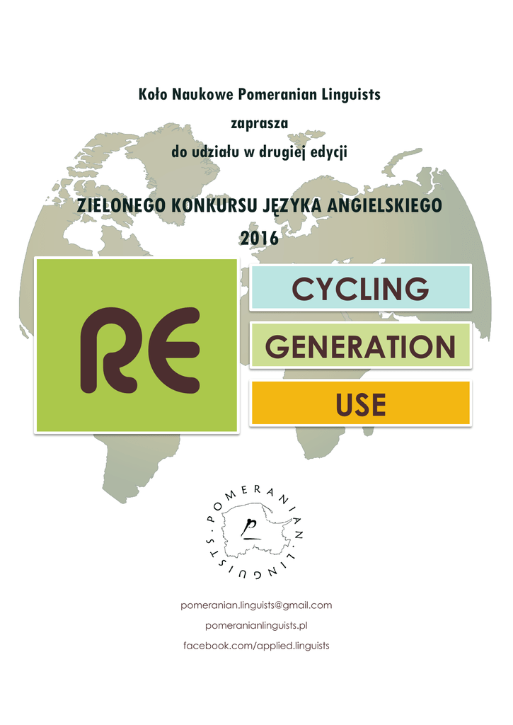 Koło Naukowe Pomeranian Linguists zaprasza do udziału w drugiej edycji ZIELONEGO KONKURSU JĘZYKA ANGIELSKIEGO 2016 RE CYCLING GENERATION USE [email protected] pomeranianlinguists.pl facebook.com/applied.linguists Regulamin Zielonego Konkursu Języka Angielskiego 2016 – Recycling, Regeneration, Reuse organizowanego w ramach Pomorskiego Festiwalu Nauki 2-3 czerwca 2016 r. 1. Organizatorem Konkursu jest Koło Naukowe Pomeranian Linguists, działające przy Instytucie Neofilologii Akademii Pomorskiej w Słupsku. 2. Celem konkursu jest: 1) promowanie nauki języków specjalistycznych od najmłodszych lat przez pryzmat współczesnych problemów związanych z ochroną środowiska, 2) edukacja w zakresie ochrony środowiska, 3) znalezienie innowacyjnych sposobów na recykling, powtórne wykorzystanie materiałów/produktów, rekuperację energii, 4) propagowanie odpowiedzialnych zachowań proekologicznych, 5) uświadomienie roli języka angielskiego we współczesnych mediach (Internet), 6) rozwijanie pozajęzykowych środków wyrazu (poster: rysunek, grafika, zdjęcie, schemat itp.). 3. Konkurs przeznaczony jest dla uczniów szkół podstawowych w obrębie Miasta Słupska i Powiatu Słupskiego. 4. Uczestnikami konkursu mogą być wszyscy uczniowie klas 1-3 (kategoria klas 1-3) oraz klas 4-6 (kategoria klas 4-6) szkół podstawowych z terenu Miasta Słupska i Powiatu Słupskiego. 5. Opis konkursu. 5.1. Konkurs składa się z dwóch etapów. a. Etap I – wewnątrzszkolny. 1)W ramach etapu wewnątrzszkolnego nauczyciele języka angielskiego ogłoszą konkurs na o tematyce ujętej w nazwie konkursu „Recycling, Regeneration, Reuse”. Pod opieką nauczycieli plastyki i języków obcych uczniowie indywidualnie wykonają prace plastyczne – plakaty w formacie A2, techniką dowolną, które promować będą innowacyjne sposoby na recykling, powtórne wykorzystanie materiałów/produktów, rekuperację energii. 2) Jeden uczeń może wykonać tylko jedną pracę. 3) Praca musi zostać wykonana samodzielnie. 4) Językiem przekazu treści tekstowych jest język angielski. 5) Dyrektor szkoły powoła Szkolną Komisję Konkursową, w skład której powinien wchodzić nauczyciel języków obcych oraz nauczyciel przyrody. Szkolna Komisja Konkursowa wyłoni dwie zwycięskie prace na szczeblu szkolnym (jedna praca uczniów klas 1-3, jedna praca uczniów klas 4-6). Sposób wyłonienia zwycięzców, w tym kryteria oceny, określi Szkolna Komisja Konkursowa. 6) Rozstrzygnięcia na etapie szkolnym zapadną do 13 maja 2016 roku. 7) Zwycięskie prace – jedna na poziomie klas 1-3 oraz jedna na poziomie klas 4-6 – muszą zostać przekazane – osobiście bądź drogą pocztową – Organizatorowi w nieprzekraczalnym terminie do 20 maja 2016 roku na adres: Instytut Neofilologii, Koło Naukowe Pomeranian Linguists, Akademia Pomorska w Słupsku, Słupsk, ul. Słowiańska 8. 8) Każda praca powinna zawierać na odwrocie następujące informacje: a. imię i nazwisko uczestnika, b. nazwę i adres szkoły, c. klasę. 1 b. Etap II – Finały. 1) W ramach etapu finałowego powołana zostanie Uczelniana Komisja Konkursowa, która wyłoni zwycięzców finałów Konkursu w kategorii klas 1-3 oraz w kategorii klas 4-6 na podstawie przesłanych na adres Organizatora prac. 2) Obrady Uczelnianej Komisji Konkursowej przewidziane są w dniach 23 - 27 maja 2016 roku. Prace Komisji odbywać się będą w siedzibie Organizatora przy ul. Słowiańskiej 8. 3) Ogłoszenie wyników i gala finałowa odbędzie się podczas Pomorskiego Festiwalu Nauki, 2 czerwca 2016 o godz. 12.00 w auli Instytutu Filologii Akademii Pomorskiej w Słupsku przy ul. Słowiańskiej 8. 4) Wyniki ustalone i ogłoszone przez Uczelnianą Komisję Konkursową są ostateczne. 5) Prace konkursowe zostaną zaprezentowane w auli Instytutu Neofilologii Akademii Pomorskiej w Słupsku w budynku przy ul. Słowiańskiej 8. na okres trwania Pomorskiego Festiwalu Nauki. Elektroniczne kopie prac zostaną również zamieszczone w galerii online na stronie internetowej Koła Naukowego Pomeranian Linguists ( www.pomeranianlinguists.pl). Lista zwycięzców zostanie opublikowana na głównej stronie internetowej Akademii Pomorskiej w Słupsku ( www.apsl.edu.pl). 6) Prace dostarczone Organizatorowi do etapu finałowego nie będą zwracane, a prawa autorskie do nich przechodzą na Organizatora. 6. Kryteria oceny. 6.1. Szkolne Komisje Konkursowe indywidualnie określą kryteria oceny na poziomie wewnątrzszkolnym. 6.2. Uczelniana Komisja Konkursowa przyjmuje następujące kryteria oceny: a. Zgodność projektu z tematyką Konkursu (20% punktów). b. Zawartość treściowa i poprawność językowa (25% punktów). c. Oryginalność zaproponowanych działań proekologicznych (25% punktów). d. Estetyka wykonania (10% punktów). e. Ogólny poziom przekazu (20% punktów). 7. Nagrody 7.1. Organizator przewidział dyplomy uczestnictwa dla wszystkich finalistów Konkursu. Ponadto Organizator przewidział nagrody dla zwycięzców etapu finałowego w poszczególnych kategoriach: klas 1-3 oraz klas 4-6. Nagrodzone będą: miejsce pierwsze, drugie i trzecie w kategorii klas 1-3 oraz miejsce pierwsze, drugie i trzecie w kategorii klas 4-6. 7.2. Organizator zastrzega sobie prawo przyznania dodatkowych nagród-wyróżnień. Kontakt: Koło Naukowe Pomeranian Linguists tel. 782-31-75-16 e-mail:[email protected] www.pomeranianlinguists.pl Informacja dodatkowa: Proponuje się, aby podczas lekcji języków obcych wprowadzona została niezbędna terminologia dotycząca omawianej problematyki. Potrzebna terminologia może zostać wprowadzona m.in. przy wykorzystaniu gry Recycle City (https://www3.epa.gov/recyclecity/dumptown.htm), dzięki której nauczyciel może omówić podane w grze rozwiązania i zawarte w niej terminy dotyczące recyklingu. Zachęca się, aby podczas lekcji przyrody omówiona została problematyka recyclingu, powtórnego wykorzystania materiałów/produktów oraz, aby wprowadzo
