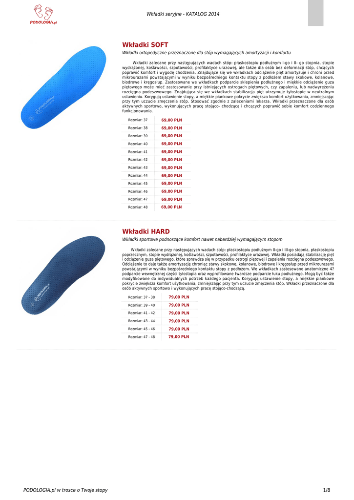 Wkładki seryjne - KATALOG 2014 Wkładki SOFT Wkładki ortopedyczne przeznaczone dla stóp wymagających amortyzacji i komfortu Wkładki zalecane przy następujących wadach stóp: płaskostopiu podłużnym I-go i II- go stopnia, stopie wydrążonej, koślawości, szpotawości, profilaktyce urazowej, ale także dla osób bez deformacji stóp, chcących poprawić komfort i wygodę chodzenia. Znajdujące się we wkładkach odciążenie pięt amortyzuje i chroni przed mikrourazami powstającymi w wyniku bezpośredniego kontaktu stopy z podłożem stawy skokowe, kolanowe, biodrowe i kręgosłup. Zastosowane we wkładkach podparcie sklepienia podłużnego i miękkie odciążenie guza piętowego może mieć zastosowanie przy istniejących ostrogach piętowych, czy zapaleniu, lub nadwyrężeniu rozcięgna podeszwowego. Znajdująca się we wkładkach stabilizacja pięt utrzymuje tyłostopie w neutralnym ustawieniu. Korygują ustawienie stopy, a miękkie piankowe pokrycie zwiększa komfort użytkowania, zmniejszając przy tym uczucie zmęczenia stóp. Stosować zgodnie z zaleceniami lekarza. Wkładki przeznaczone dla osób aktywnych sportowo, wykonujących pracę stojąco- chodzącą i chcących poprawić sobie komfort codziennego funkcjonowania. Rozmiar: 37 69,00 PLN Rozmiar: 38 69,00 PLN Rozmiar: 39 69,00 PLN Rozmiar: 40 69,00 PLN Rozmiar: 41 69,00 PLN Rozmiar: 42 69,00 PLN Rozmiar: 43 69,00 PLN Rozmiar: 44 69,00 PLN Rozmiar: 45 69,00 PLN Rozmiar: 46 69,00 PLN Rozmiar: 47 69,00 PLN Rozmiar: 48 69,00 PLN Wkładki HARD Wkładki sportowe podnoszące komfort nawet nabardziej wymagającym stopom Wkładki zalecane przy następujących wadach stóp: płaskostopiu podłużnym II-go i III-go stopnia, płaskostopiu poprzecznym, stopie wydrążonej, koślawości, szpotawości, profilaktyce urazowej. Wkładki posiadają stabilizację pięt i odciążenie guza piętowego, które sprawdza się w przypadku ostrogi piętowej i zapalenia rozcięgna podeszwowego. Odciążenie to daje także amortyzację chroniąc stawy skokowe, kolanowe, biodrowe i kręgosłup przed mikrourazami powstającymi w wyniku bezpośredniego kontaktu stopy z podłożem. We wkładkach zastosowano anatomiczne 4? podparcie wewnętrznej części tyłostopia oraz wyprofilowane twardsze podparcie łuku podłużnego. Mogą być także modyfikowane do indywidualnych potrzeb każdego pacjenta. Korygują ustawienie stopy, a miękkie piankowe pokrycie zwiększa komfort użytkowania, zmniejszając przy tym uczucie zmęczenia stóp. Wkładki przeznaczone dla osób aktywnych sportowo i wykonujących pracę stojąco-chodzącą. PODOLOGIA.pl w trosce o Twoje stopy Rozmiar: 37 - 38 79,00 PLN Rozmiar: 39 - 40 79,00 PLN Rozmiar: 41 - 42 79,00 PLN Rozmiar: 43 - 44 79,00 PLN Rozmiar: 45 - 46 79,00 PLN Rozmiar: 47 - 48 79,00 PLN 1/8 Wkładki seryjne - KATALOG 2014 Wkładki pełne Wkładki pełne podpierające sklepienia podłużne i poprzeczne stóp Zastosowanie: Wkładki ortopedyczne są stosowane przy zapobieganiu schorzeniom stóp oraz leczeniu lub łagodzeniu istniejących już schorzeń stóp. Zasada działania: W trakcie stosowania wyrobu, czyli noszenia wkładki, jego konstrukcja wymusza przybranie przez stopę prawidłowej pozycji wymaganej dla danego schorzenia, umożliwiając prawidłowy sposób chodzenia i poruszania się. W przypadku istniejących wad wkładka wstrzymuje proces pogłębiania się wady, a następnie przy zastosowaniu odpowiedniej procedury leczniczej zdefiniowanej przez lekarza pozwala na cofnięcie się / ustanie wady. Przeznaczenie: Dla osób z płaskostopiem poprzecznym i podłużnym. Zmniejszają dolegliwości bólowe stóp. Zmniejszają ryzyko powstawania modzeli i odcisków na podeszwowej stronie stopy. Miękkie, piankowe elementy zwiększają komfort użytkowania obuwia. Stosować zgodnie z zaleceniami lekarza. Przeciwwskazania: Duża deformacja stóp, rany i owrzodzenia podeszwowej strony stóp. PODOLOGIA.pl w trosce o Twoje stopy Rozmiar: 36 25,00 PLN Rozmiar: 37 25,00 PLN Rozmiar: 38 25,00 PLN Rozmiar: 39 25,00 PLN Rozmiar: 40 25,00 PLN Rozmiar: 41 25,00 PLN Rozmiar: 42 25,00 PLN Rozmiar: 43 25,00 PLN Rozmiar: 44 25,00 PLN Rozmiar: 45 25,00 PLN Rozmiar: 46 25,00 PLN 2/8 Wkładki seryjne - KATALOG 2014 Wkładki 3/4 z pelotą metatarsalną Wkładki 3/4 z pelotą metatarsalną łezką Zastosowanie: Wkładki ortopedyczne są stosowane przy zapobieganiu schorzeniom stóp oraz leczeniu lub łagodzeniu istniejących już schorzeń stóp. Zasada działania: W trakcie stosowania wyrobu, czyli noszenia wkładki, jego konstrukcja wymusza przybranie przez stopę prawidłowej pozycji wymaganej dla danego schorzenia, umożliwiając prawidłowy sposób chodzenia i poruszania się. W przypadku istniejących wad wkładka wstrzymuje proces pogłębiania się wady, a następnie przy zastosowaniu odpowiedniej procedury leczniczej zdefiniowanej przez lekarza pozwala na cofnięcie się / ustanie wady. Przeznaczenie: Dla osób z płaskostopiem poprzecznym. Korzystnie zmieniają rozkład nacisków w okolicy główek kości śródstopia. Zmniejszają dolegliwości bólowe stóp w obrębie przodostopia. Zmniejszają ryzyko powstawania modzeli i odcisków na podeszwowej stronie stopy. Stosować zgodnie z zaleceniami lekarza. Przeciwwskazania: Duża deformacja stóp, rany i owrzodzenia podeszwowej strony stóp. Rozmiar: 35 - 36 20,00 PLN Rozmiar: 37 - 38 20,00 PLN Rozmiar: 39 - 40 20,00 PLN Rozmiar: 41 - 42 20,00 PLN Półwkładki z pelotą metatarsalną Półwkładki z pelotą metatarsalną dla stóp z obniżonym łukiem poprzecznym Zastosowanie: Wkładki ortopedyczne są stosowane przy zapobieganiu schorzeniom stóp oraz leczeniu lub łagodzeniu istniejących już schorzeń stóp. Zasada działania: W trakcie stosowania wyrobu, czyli noszenia wkładki, jego konstrukcja wymusza przybranie przez stopę prawidłowej pozycji wymaganej dla danego schorzenia, umożliwiając prawidłowy sposób chodzenia i poruszania się. W przypadku istniejących wad 