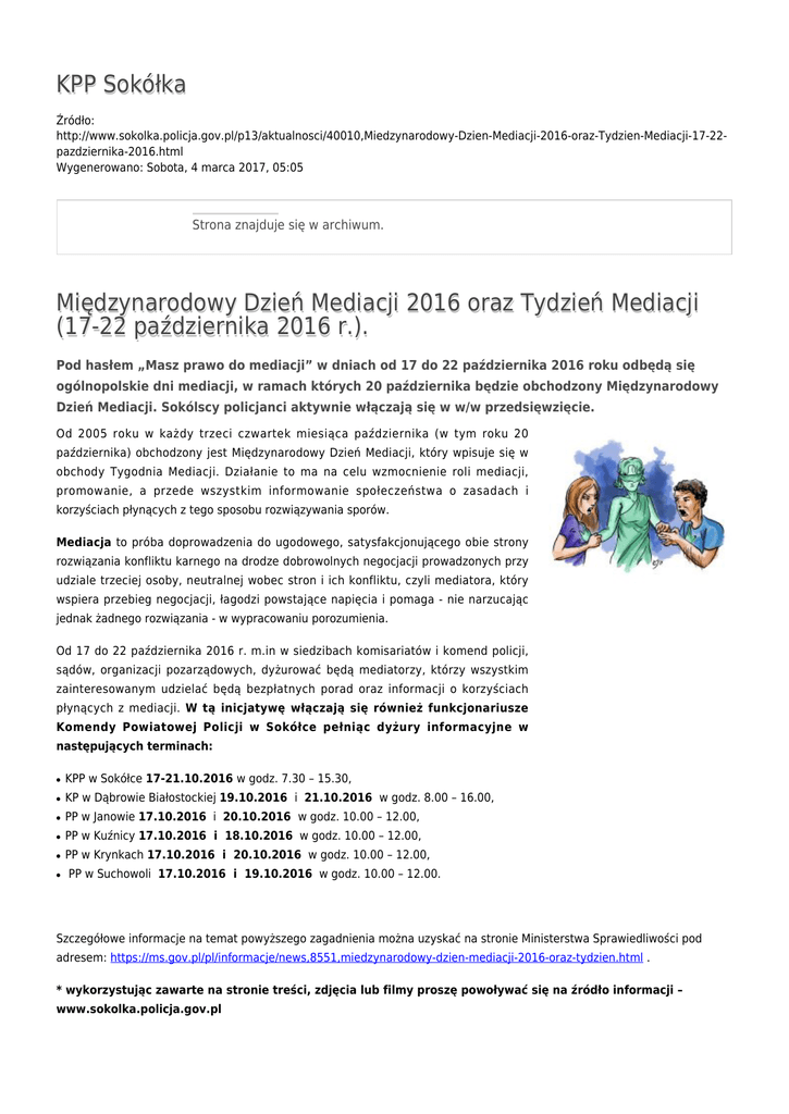 KPP Sokółka Źródło: http://www.sokolka.policja.gov.pl/p13/aktualnosci/40010,Miedzynarodowy-Dzien-Mediacji-2016-oraz-Tydzien-Mediacji-17-22pazdziernika-2016.html Wygenerowano: Sobota, 4 marca 2017, 05:05 Strona znajduje się w archiwum. Międzynarodowy Dzień Mediacji 2016 oraz Tydzień Mediacji (17-22 października 2016 r.). Pod hasłem „Masz prawo do mediacji” w dniach od 17 do 22 października 2016 roku odbędą się ogólnopolskie dni mediacji, w ramach których 20 października będzie obchodzony Międzynarodowy Dzień Mediacji. Sokólscy policjanci aktywnie włączają się w w/w przedsięwzięcie. Od 2005 roku w każdy trzeci czwartek miesiąca października (w tym roku 20 października) obchodzony jest Międzynarodowy Dzień Mediacji, który wpisuje się w obchody Tygodnia Mediacji. Działanie to ma na celu wzmocnienie roli mediacji, promowanie, a przede wszystkim informowanie społeczeństwa o zasadach i korzyściach płynących z tego sposobu rozwiązywania sporów. Mediacja to próba doprowadzenia do ugodowego, satysfakcjonującego obie strony rozwiązania konfliktu karnego na drodze dobrowolnych negocjacji prowadzonych przy udziale trzeciej osoby, neutralnej wobec stron i ich konfliktu, czyli mediatora, który wspiera przebieg negocjacji, łagodzi powstające napięcia i pomaga - nie narzucając jednak żadnego rozwiązania - w wypracowaniu porozumienia. Od 17 do 22 października 2016 r. m.in w siedzibach komisariatów i komend policji, sądów, organizacji pozarządowych, dyżurować będą mediatorzy, którzy wszystkim zainteresowanym udzielać będą bezpłatnych porad oraz informacji o korzyściach płynących z mediacji. W tą inicjatywę włączają się również funkcjonariusze Komendy Powiatowej Policji w Sokółce pełniąc dyżury informacyjne w następujących terminach: ● KPP w Sokółce 17-21.10.2016 w godz. 7.30 – 15.30, ● KP w Dąbrowie Białostockiej 19.10.2016 i 21.10.2016 w godz. 8.00 – 16.00, ● PP w Janowie 17.10.2016 i 20.10.2016 w godz. 10.00 – 12.00, ● PP w Kuźnicy 17.10.2016 i 18.10.2016 w godz. 10.00 – 12.00, ● PP w Krynkach 17.10.2016 i 20.10.2016 w godz. 10.00 – 12.00, ● PP w Suchowoli 17.10.2016 i 19.10.2016 w godz. 10.00 – 12.00. Szczegółowe informacje na temat powyższego zagadnienia można uzyskać na stronie Ministerstwa Sprawiedliwości pod adresem: https://ms.gov.pl/pl/informacje/news,8551,miedzynarodowy-dzien-mediacji-2016-oraz-tydzien.html . * wykorzystując zawarte na stronie treści, zdjęcia lub filmy proszę powoływać się na źródło informacji – www.sokolka.policja.gov.pl Ocena: 0/5 (0) Tweetnij