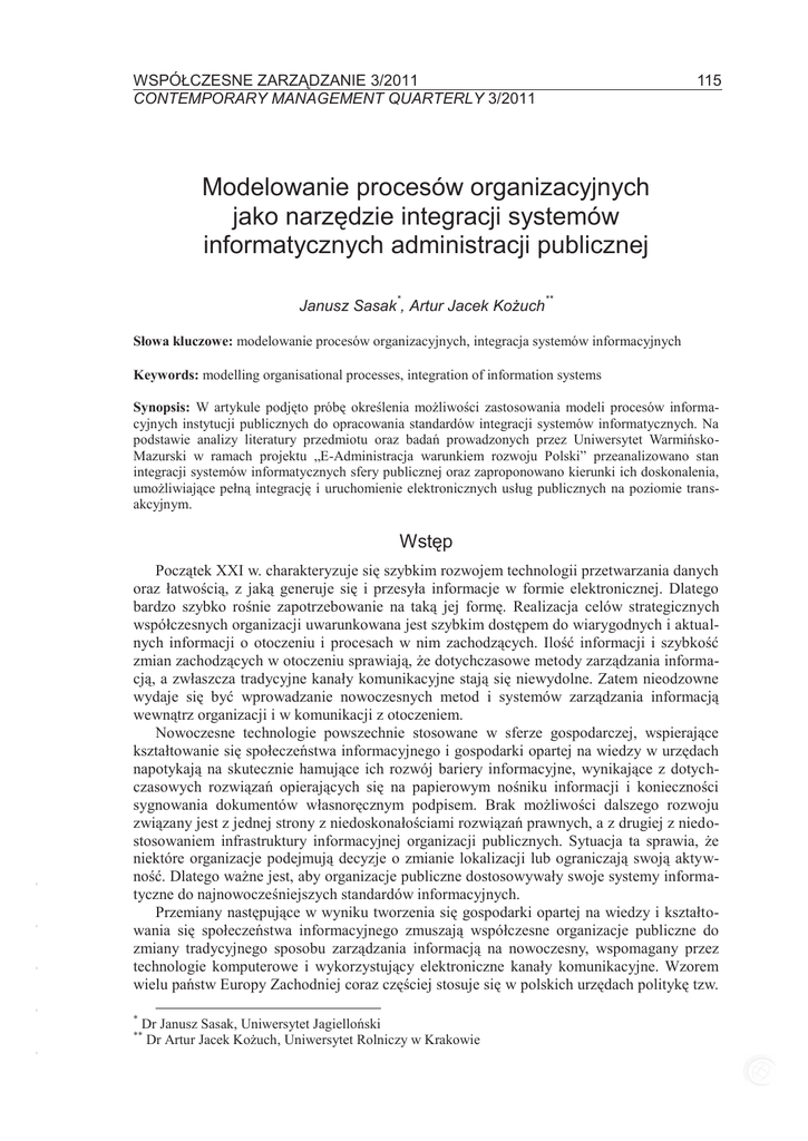 WSPÓŁCZESNE ZARZĄDZANIE 3/2011 CONTEMPORARY MANAGEMENT QUARTERLY 3/2011 115 Modelowanie procesów organizacyjnych jako narzędzie integracji systemów informatycznych administracji publicznej * Janusz Sasak , Artur Jacek Kożuch ** Słowa kluczowe: modelowanie procesów organizacyjnych, integracja systemów informacyjnych Keywords: modelling organisational processes, integration of information systems Synopsis: W artykule podjęto próbę określenia możliwości zastosowania modeli procesów informacyjnych instytucji publicznych do opracowania standardów integracji systemów informatycznych. Na podstawie analizy literatury przedmiotu oraz badań prowadzonych przez Uniwersytet WarmińskoMazurski w ramach projektu „E-Administracja warunkiem rozwoju Polski” przeanalizowano stan integracji systemów informatycznych sfery publicznej oraz zaproponowano kierunki ich doskonalenia, umożliwiające pełną integrację i uruchomienie elektronicznych usług publicznych na poziomie transakcyjnym. Początek XXI w. charakteryzuje się szybkim rozwojem technologii przetwarzania danych oraz łatwością, z jaką generuje się i przesyła informacje w formie elektronicznej. Dlatego bardzo szybko rośnie zapotrzebowanie na taką jej formę. Realizacja celów strategicznych współczesnych organizacji uwarunkowana jest szybkim dostępem do wiarygodnych i aktualnych informacji o otoczeniu i procesach w nim zachodzących. Ilość informacji i szybkość zmian zachodzących w otoczeniu sprawiają, że dotychczasowe metody zarządzania informacją, a zwłaszcza tradycyjne kanały komunikacyjne stają się niewydolne. Zatem nieodzowne wydaje się być wprowadzanie nowoczesnych metod i systemów zarządzania informacją wewnątrz organizacji i w komunikacji z otoczeniem. Nowoczesne technologie powszechnie stosowane w sferze gospodarczej, wspierające kształtowanie się społeczeństwa informacyjnego i gospodarki opartej na wiedzy w urzędach napotykają na skutecznie hamujące ich rozwój bariery informacyjne, wynikające z dotychczasowych rozwiązań opierających się na papierowym nośniku informacji i konieczności sygnowania dokumentów własnoręcznym podpisem. Brak możliwości dalszego rozwoju związany jest z jednej strony z niedoskonałościami rozwiązań prawnych, a z drugiej z niedostosowaniem infrastruktury informacyjnej organizacji publicznych. Sytuacja ta sprawia, że niektóre organizacje podejmują decyzje o zmianie lokalizacji lub ograniczają swoją aktywność. Dlatego ważne jest, aby organizacje publiczne dostosowywały swoje systemy informatyczne do najnowocześniejszych standardów informacyjnych. Przemiany następujące w wyniku tworzenia się gospodarki opartej na wiedzy i kształtowania się społeczeństwa informacyjnego zmuszają współczesne organizacje publiczne do zmiany tradycyjnego sposobu zarządzania informacją na nowoczesny, wspomagany przez technologie komputerowe i wykorzystujący elektroniczne kanały komunikacyjne. Wzorem wielu państw Europy Zachodniej coraz częściej stosuje się w polskich urzędach politykę tzw. - - - - Wstęp * Dr Janusz Sasak, Uniwersytet Jagielloński Dr Artur Jacek Kożuch, Uniwersytet Rolniczy w Krakowie - ** 116 J. Sasak, A. J. Kożuch, Modelowanie procesów organizacyjnych… J. Sasak, A. J. Kożuch, Modelling organisational processes as… trzech kroków: jeden kontakt, jedna osoba, jedno miejsce. Oznacza to, że klienci urzędu spotykają się z jednym urzędnikiem, w jednym miejscu i w większości przypadków jeden kontakt wystarcza do załatwienia sprawy. Dzięki temu system informacyjno-komunikacyjny urzędu postrzegany jest jako bardziej przyjazny obywatelowi, co sprawia, że zwiększa się zrozumienie mechanizmów biurokratycznego funkcjonowania, a praca urzędnika staje się bardziej wydajna i efektywna. Realizacja tej idei wymaga jednakże pełnej integracji systemów komputerowych wspomagających pracę urzędników. Jakość sprawowania władzy i sposób obsługi klientów administracji publicznej zależy od wybranego i zastosowanego modelu zarządzania przepływem informacji, wykorzystywanych kanałów komunikacyjnych i rozwiązań technicznych tak wewnątrz urzędu, jak i na styku z otoczeniem. Zmiana standardów funkcjonowania współczesnej administracji wymaga sprawnej transformacji systemów informatycznych. Dlatego też za cel niniejszego opracowania przyjęto zbadanie możliwości zastosowania modelowania procesów organizacyjnych jako narzędzia integracji systemów informatycznych współczesnej administracji publicznej. Na potrzeby opracowania dokonano przeglądu aktualnej literatury przedmiotu. Ocenę stanu systemów informatycznych administracji publicznej i główne bariery ich integracji określono na podstawie literatury przedmiotu i badań własnych autorów. Udział autorów jako ekspertów w projekcie „E-administracja warunkiem rozwoju Polski” prowadzonym przez Uniwersytet Warmińsko-Mazurski pozwolił na określenie przydatności modelowania procesów jako narzędzia standaryzacji wymiany informacji w administracji publicznej. - - - - - Stan systemów informatycznych administracji publicznej Dynamiczny rozwój nauki, techniki, a w szczególności technologii elektronicznego przetwarzania danych daje wiele możliwości rozwoju w zakresie opracowywania i wdrażania nowych produktów oraz kanałów świadczenia usług. Ważną cechą obecnej gospodarki jest też rosnąca konkurencja międzynarodowa i globalizacja. Współczesne organizacje dążą do osiągnięcia dużej elastyczności i efektywności zaangażowanych środków. Strategie rozwojowe organizacji gospodarczych zostały przeorientowane z koncepcji produkcyjnych na marketingowe, w których duży nacisk kładzie się na sprawność przetwarzania informacji i możliwość elektronicznej wymiany danych z organizacjami publicznymi. Dąbrowska i współautorzy podają, że w 2008 r. według rankingu dostępności usług publicznych Polska zna