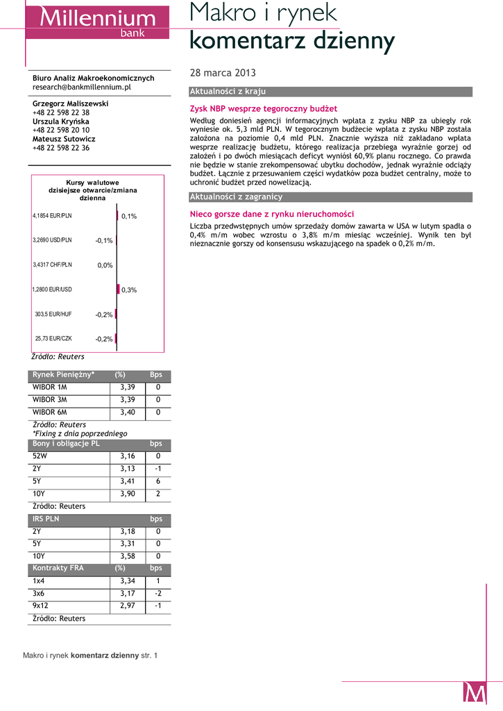 28 marca 2013 Biuro Analiz Makroekonomicznych [email protected] Aktualności z kraju Grzegorz Maliszewski +48 22 598 22 38 Urszula Kryńska +48 22 598 20 10 Mateusz Sutowicz +48 22 598 22 36 Zysk NBP wesprze tegoroczny budżet Kursy walutowe dzisiejsze otwarcie/zmiana 0,0 0,0 0,0 0,0 dzienna 4,1854 EUR/PLN Według doniesień agencji informacyjnych wpłata z zysku NBP za ubiegły rok wyniesie ok. 5,3 mld PLN. W tegorocznym budżecie wpłata z zysku NBP została założona na poziomie 0,4 mld PLN. Znacznie wyższa niż zakładano wpłata wesprze realizację budżetu, którego realizacja przebiega wyraźnie gorzej od założeń i po dwóch miesiącach deficyt wyniósł 60,9% planu rocznego. Co prawda nie będzie w stanie zrekompensować ubytku dochodów, jednak wyraźnie odciąży budżet. Łącznie z przesuwaniem części wydatków poza budżet centralny, może to uchronić budżet przed nowelizacją. 0,0 Nieco gorsze dane z rynku nieruchomości 0,1% 3,2690 USD/PLN -0,1% 3,4317 CHF/PLN 0,0% 1,2800 EUR/USD Liczba przedwstępnych umów sprzedaży domów zawarta w USA w lutym spadła o 0,4% m/m wobec wzrostu o 3,8% m/m miesiąc wcześniej. Wynik ten był nieznacznie gorszy od konsensusu wskazującego na spadek o 0,2% m/m. 0,3% 303,5 EUR/HUF -0,2% 25,73 EUR/CZK -0,2% Źródło: Reuters Rynek Pieniężny* (%) Bps WIBOR 1M 3,39 0 WIBOR 3M 3,39 0 WIBOR 6M 3,40 0 Źródło: Reuters *Fixing z dnia poprzedniego Bony i obligacje PL bps 52W 3,16 0 2Y 3,13 -1 5Y 3,41 6 10Y 3,90 2 Źródło: Reuters IRS PLN bps 2Y 3,18 0 5Y 3,31 0 10Y Kontrakty FRA Aktualności z zagranicy 3,58 (%) 0 bps 1x4 3,34 1 3x6 3,17 -2 9x12 2,97 -1 Źródło: Reuters Makro i rynek komentarz dzienny str. 1 Notowania złotego Kursy USD/PLN i EUR/PLN /bid z zamknięcia/ 3,30 4,24 4,22 3,25 4,20 4,18 3,20 4,16 4,14 3,15 4,12 3,10 4,10 USDPLN /lewa skala/ EURPLN 400 360 320 280 240 200 7 mar 12 mar 15 mar 2Y 20 mar 25 mar 5Y 28 mar 0 3,0 -2 0,16 0 0 1,85 USD/PLN 3,1813/3,2400 Stabilizacja notowań, sentyment międzynarodowego rynku związany z sytuacją na Cyprze, stopniowo rosnące oczekiwania na obniżki stóp przez RPP, Zmiany w notowaniach EURUSD, 5 CHF/PLN 3,3900/3,4550 Zmiany w notowaniach EURCHF, 0 EUR/USD 1,2800/1,3100 Zawirowania wokół Cypru i finalne uzgodnienie warunków pomocy finansowej, obawy o niestabilność polityczną we Włoszech, dane z Niemiec. -10 -15 1,5 0,75 0,5 0,0 -0,03 -20 1,27 0,25 -25 0,29 -30 -0,5 -35 2Y 5Y Zmiana rentowności bundów (bp) 10Y 2013-03-28 Bundy Uzasadnienie 4,1550/4,200 -5 2,0 Treasury Obligacje – Rynek krajowy Rentowności krajowego długu nadal poruszają się w rytm notowań obligacji na rynkach bazowych, gdzie inwestorzy w związku z wciąż utrzymującą się niepewnością szukają bezpiecznych aktywów, do których ostatnio zaliczane są także polskie papiery. Wpływu na wycenę polskich obligacji nie miały Obligacje - Rynki bazowe Obligacje krajowe rentowności i ich zmiana dzienna 4,5 6 4,0 3,5 3,0 5 3,13 3,90 3,41 2 2,0 1,5 1,0 0,5 4 3 2,5 6 2 1 0 -1 -1 0,0 -2 2Y 5Y zmiana dzienna w bp (prawa oś) 10Y 2013-03-28 Makro i rynek komentarz dzienny str. 2 włoskiego długu, na której sprzedano obligacje na kwotę niższą od maksymalnego planu podaży. Dzisiejsza sesja ma szansę przynieść lekką poprawę nastrojów po tym jak dziś rano pozytywnie zaskoczyły dane o produkcji przemysłowej w Niemczech, a na Cyprze stopniowo normalizuje się sytuacja sektora bankowego. EUR/PLN 0 2,5 1,0 Tak jak wskazywaliśmy we wczorajszym raporcie środowa sesja nie przyniosła zmian w dotychczasowym obrazie notowań eurodolara. Kurs EUR/USD kontynuował trend spadkowy wyznaczając wczoraj najniższy od połowy listopada ubiegłego roku poziom 1,2750. Wczoraj rynek negatywnie odebrał między innymi wyniki aukcji Nasze oczekiwania na dzisiaj Kurs Wsparcie/Opór 10Y Bundy i Treasuries rentowności i ich zmiana dzienna 3,5 listopada 2012 roku. Na gruncie analizy technicznej jednak wskaźnik RSI zaczyna tworzyć dywergencję z notowaniami kursu USD/PLN, sugerując możliwość wystąpienia korekty. Dzisiejsze poranne informacje o wyniku głosowania RPP nad obniżką stóp procentowych w lutym pozostały bez wpływu na polskie aktywa. Nie oczekujemy także, aby zaplanowany na dziś odczyt kwartalnego salda rachunku bieżącego mógł wpłynąć na wycenę polskiej waluty. Nadal dominować będzie sentyment międzynarodowego rynku. Zagranica - kurs EUR/USD Spready obligacji PLN vs. EUR 4 mar Środa zgodnie z oczekiwaniami nie przyniosła istotnych zmian w wycenie złotego w relacji do euro w związku z brakiem potencjalnych impulsów i okresem przedświątecznym sprzyjającym stabilizacji notowań. Kurs EUR/PLN nadal utrzymuje się w przedziale 4,16 – 4,20 oczekując na przyszłotygodniowe dane z krajowej i globalnej gospodarki. Dynamiczny przebieg mają natomiast notowania kursu USD/PLN, które odzwierciedlają tendencje umacniania się dolara na międzynarodowym forexie. Wczoraj złoty do dolara był najsłabszy od Wczoraj głównym wydarzeniem dnia była aukcja włoskich obligacji, na której sprzedano dwie serie papierów o łącznej wartości 6,91 mld EUR z oferowanej puli 5-7 mld EUR. 5-let. obligacje (czerwiec 2018) o wartość 3,91 mld EUR sprzedano z rentownością 3,65% najwyższą od października ubiegłego roku (wobec 3,59% poprzednio), stosunek popytu do podaży natomiast wyniósł 1,22 (wobec 1,61 wcześniej). 10-letni tenor (maj 2023) sprzedano za 3 mld EUR z rentownością 4,66% (pop. 4,83%) i stosunkiem bid-to-cover 1,33 (pop. 1,65). Wyniki aukcji zostały negatywnie przyjęte przez rynek i przyczyniły się do zwiększonego zainteresowania papierami niemieckimi. dzisiejsze informacje o wyniku głosowania RPP w lutym. Najważniejszym wydarzeniem bieżącego tygodnia może okazać się publikacja planu podaży papierów przez Ministerstwo Finansów. Będzie ona miała miejsce w jutro. Kalendarium Data Godz. Wskaźnik/Wydarzenie Kraj Okres Ostatnie dane Prognoza Millennium Kon