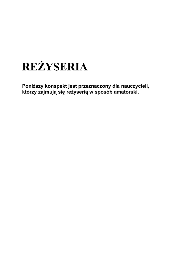 REŻYSERIA Poniższy konspekt jest przeznaczony dla nauczycieli, kt•rzy zajmują się reżyserią w spos•b amatorski. 2 Konspekt porusza następujące problemy: I. TWORZY INSCENIZACJĘ II. ANALIZUJE SZTUKĘ. III. ZROBIĆ PLAN PR‚B; IV. Żelazne zasady gry aktorskiej; V. Zasady ruchu na scenie VI. Uwagi dodatkowe odnośnie gry aktor…w VII. Realizacja pr…b; Reżyser – co robi? I. TWORZY INSCENIZACJĘ – co to znaczy? 1. Ustala obsadę aktorską. Czym się kieruje przy obsadzie? a) Prowadzące role musza grać najlepsi aktorzy, aby mogli udźwignąć przedstawienie. b) Aktorzy musza mieć predyspozycje do kreowanych rƒl. 3 II. ANALIZUJE SZTUKĘ. 1. Ustala konflikty między postaciami – Co to znaczy? Aktorzy na scenie musza wiedzieć, jaki maja stosunek do partnera scenicznego i co chcą uzyskać od niego (po co weszli na scenę i co chcą ‘załatwić’.) 2. Analiza teksty ma na celu: a) zmierzenie czasu; b) wyrzucenie z tekstu kwestii powtarzających się i będące opowiadaniem (monologi, opisy). c) zostawić dialogi, kt•re są niezbędne i posuwają akcje do przodu. d) Unikać ilustracji tekstu. Grać na kontrze – co to znaczy - jeśli postać jest negatywna szukać dobrych cech i odwrotnie; REŻYSER MUSI POWIEDZIEĆ AKTOROM W JEDNYM ZDANIU, O CZYM BĘDZIE ROBIŁ PRZEDSTAWIENIE! III. ZROBIĆ PLAN PR‚B; a) Zebrać wszystkich aktor•w, rozdać egzemplarze, czytać w r•żnych wariantach obsadowych, żeby wyłonić najlepszych do danej roli. b) Należy wykonać co najmniej cztery pr•by przy stole, żeby wytłumaczyć każdemu z osobna jego postać i ustalić stosunki między partnerami. c) Dopiero z tekstem nauczonym na pamięć wejść na scenę. d) Aktor na scenie nie jest w stanie myśleć o interpretacji, jak nie wie, co m•wi, a co dopiero o sytuacji czy o stosunku do kolegi. 4 IV. Żelazne zasady gry aktorskiej; a) Przy ustawieniu sytuacji scenicznych należy pamiętać, że scena nie znosi monotonii, tak w braku działania, czyli ruchu, jak i braku konfliktu w dialogu. b) Należy pamiętać o konieczności zmian rytm•w w chodzeniu i m•wieniu; c) Podstawa gry aktora jest intencja w działaniu; d) Aktorzy musza wiedzieć a widz musi wierzyć, że jest świadkiem ‘dziania się czegoś na scenie’. Nikt nie znosi słuchania pustych tyrad; V. Zasady ruchu na scenie są w 90% zawsze takie same, można tylko zmieniać warianty. a) Zawsze staramy się wypełnić scenę; Rysunek I 5 b) Chodzimy po przekątnych i kołami okrągło; Rysunek II c) Powietrze między aktorami Rysunek III 6 d) Nigdy tak Rys: IV, Rys. V 7 Rys. VI VI. Uwagi dodatkowe odnośnie gry aktor…w a) NIC TYLKO DLA SYTUACJI – nawet, gdy siadamy to musimy wiedzieć, po co siadamy; b) Jak aktor chodzi to nie m•wi, bo ‘zatupuje’ tekst; c) Drugi plan nie gra. d) Sytuacja na scenie jest wynikiem potrzeby wewnętrznej aktora. e) Jeśli jakaś osoba dramatu gra na proscenium to aktorzy w głębi musza być stonowani i ruszać się cztery razy wolniej (zwolniona klatka filmu) f) Maksyma aktora na scenie brzmi następująco: ‘załatw swoją sprawę i wychodź. (np. chce zdobyć kawałek drewna, bo marze, żeby wystrugać pajaca. 8 Aktor przychodzi w konkretnym znanym mu celu. Jakie środki aktorskie zastosuje aktor, żeby zdobyć pniak to sprawa do omƒwienia z reżyserem). g) wszyscy aktorzy na scenie nie mogą poruszac się jednocześnie. h) przed każda pr•bą reżyser powinien popracować 5-10 min. Z aktorami nad rozruszaniem aparatu m•wienia. VII. Plan pr…b; Reżyseruje się przedstawienie scenami, począwszy od pierwszych, np. dwie sceny i na dana godziną maja przyjść aktorzy. Aktorzy z następnych dwu scen przychodzą dwie godziny pƒźniej. Dopiero po kilku takich prƒbach wszystkie sceny łączy się w całość. Aktor nie może czekać na wejście na scenę do prƒby po dwie lub trzy godziny, bo ‘wszystko powietrze, jak z balonu z niego ujdzie’. Czekając długi czas jest niezdolny do kreowania propozycji oraz wypompowany nuda i czekaniem. AKTOR MUSI BYĆ NAŁADOWANY I ŚWIEŻY DO PRACY. Na pierwszym etapie prƒb (dokąd reżyser nie zamknie całości sytuacji), te sceny, ktƒre są najsłabsze należy powtarzać w nieskończoność, aż do skutku. Wszystkie sceny starać się powtarzać często, żeby aktorzy nie zapomnieli INTENCJI I USTAWIONYCH SYTUACJI. Dopiero w końcowym etapie prƒb ‘leci się całością’. Wtedy wyłapuje się jeszcze najsłabsze momenty. Jeśli w przedstawieniu są ilustracje muzyczne czy dźwiękowe starać się wprowadzić je stosunkowo wcześnie, ażeby aktor się z nimi oswoił, to samo dotyczy wszystkich rekwizytƒw, ktƒrymi aktor będzie się posługiwał w trakcie przedstawienia. 9 10 11 12 13