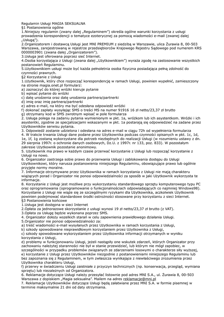 Regulamin Usługi MAGIA SEKSUALNA §1 Postanowienia ogólne 1.Niniejszy regulamin (zwany dalej „Regulaminem”) określa ogólne warunki korzystania z usługi prowadzenia korespondencji o tematyce ezoterycznej za pomocą wiadomości e-mail (zwanej dalej „Usługą”). 2.Organizatorem i dostawcą Usługi jest MNI PREMIUM z siedzibą w Warszawie, ulica Żurawia 8, 00-503 Warszawa, zarejestrowaną w rejestrze przedsiębiorców Krajowego Rejestru Sądowego pod numerem KRS 0000003901 (zwana dalej „Organizatorem”). 3.Usługa jest oferowana poprzez sieć Internet. 4.Osoba korzystająca z Usługi (zwana dalej „Użytkownikiem”) wyraża zgodę na zastosowanie wszystkich postanowień Regulaminu. 5.Użytkownikiem usługi może być każda pełnoletnia osoba fizyczna posiadająca pełną zdolność do czynności prawnych. §2 Korzystanie z Usługi 1.Użytkownik, który chce rozpocząć korespondencję w ramach Usługi, powinien wypełnić, zamieszczony na stronie magia.onet.pl formularz: a) zaznaczyć do której wróżki kieruje pytanie b) wpisać pytanie do wróżki c) datę urodzenia oraz datę urodzenia partnera/partnerki d) imię oraz imię partnera/partnerki e) adres e-mail, na który ma być odesłana odpowiedź wróżki f) dokonać zapłaty wysyłając SMS o treści MS na numer 91916 16 zł netto/23,37 zł brutto g) otrzymany kod w SMS zwrotnym wpisać w pole formularza 2. Usługa polega na zadaniu pytania wymienionym w pkt. 1a, wróżkom lub ich asystentkom. Wróżki i ich asystentki, zgodnie ze specjalizacjami wskazanymi w pkt. 1a postarają się odpowiedzieć na zadane przez Użytkowników serwisu pytania. 3. Odpowiedź zostanie udzielona i odesłana na adres e-mail w ciągu 72h od wypełnienia formularza 4. W trakcie trwania Usługi dane podane przez Użytkownika podczas czynności opisanych w pkt. 1c, 1d, 1e, 1f, 1g zostaną wykorzystane dla potrzeb niezbędnych do realizacji Usługi (w rozumieniu ustawy z dn. 29 sierpnia 1997r. o ochronie danych osobowych, Dz.U. z 1997r. nr 133, poz. 833). W pozostałym zakresie Użytkownik pozostanie anonimowy. 5. Użytkownik ma prawo w każdym czasie przerwać korzystanie z Usługi lub rozpocząć korzystanie z Usługi na nowo. 6. Organizator zastrzega sobie prawo do przerwania Usługi i zablokowania dostępu do Usługi Użytkownikowi, który narusza postanowienia niniejszego Regulaminu, obowiązujące prawo lub ogólnie przyjęte normy moralne. 7. Informacje otrzymywane przez Użytkownika w ramach korzystania z Usługi nie mają charakteru wiążących porad i Organizator nie ponosi odpowiedzialności za sposób w jaki Użytkownik wykorzysta te informacje. 8. Korzystanie z Usługi jest możliwe przy wykorzystaniu standardowego sprzętu komputerowego typu PC oraz oprogramowania (oprogramowanie o funkcjonalnościach odpowiadających co najmniej Windows98). Korzystanie z Usługi nie wiąże się ze szczególnymi ryzykami dla Użytkownika, aczkolwiek Użytkownik powinien podejmować standardowe środki ostrożności stosowane przy korzystaniu z sieci Internet. §3 Postanowienia końcowe 1.Usługa jest dostępna w sieci Internet 2.Opłata za jednorazowe skorzystanie z usługi wynosi 19 zł netto/23,37 zł brutto (z VAT). 3.Opłata za Usługę będzie wykonana poprzez SMS. 4. Organizator dołoży wszelkich starań w celu zapewnienia prawidłowego działania Usługi. 5.Organizator nie ponosi odpowiedzialności za: a) treść wiadomości e-mail wysyłanych przez Użytkownika w ramach korzystania z Usługi, b) szkody spowodowane nieprawidłowym korzystaniem przez Użytkownika z Usługi, c) szkody spowodowane wykorzystaniem przez Użytkownika informacji otrzymanych w wyniku korzystania z Usługi, d) problemy w funkcjonowaniu Usługi, jeżeli nastąpiły one wskutek zdarzeń, których Organizator przy zachowaniu należytej staranności nie był w stanie przewidzieć, lub którym nie mógł zapobiec, w szczególności w przypadku problemów związanych ze zdarzeniami losowymi o charakterze siły wyższej, e) korzystanie z Usługi przez Użytkowników niezgodnie z postanowieniami niniejszego Regulaminu lub bez zapoznania się z Regulaminem, w tym zwłaszcza wynikające z niewłaściwego zrozumienia przez Użytkownika charakteru Usługi, f) przerwy w świadczeniu Usługi zaistniałe z przyczyn technicznych (np. konserwacja, przegląd, wymiana sprzętu) lub niezależnych od Organizatora. 6. Reklamacje dotyczące Usługi należy przesyłać listownie pod adres MNI S.A., ul. Żurawia 8, 00-503 Warszawa z dopiskiem „Magia seksualna”. Mailem na adres [email protected] 7. Reklamacje Użytkowników dotyczące Usługi będą załatwiane przez MNI S.A. w formie pisemnej w terminie maksymalnie 21 dni od daty otrzymania.