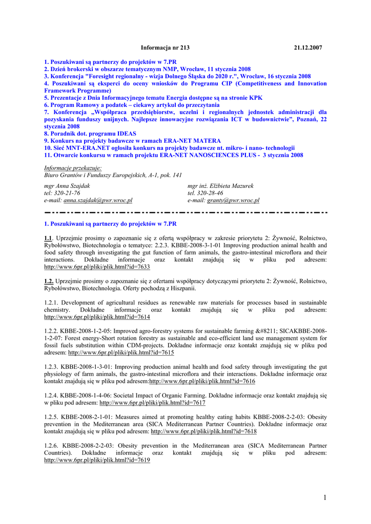 Informacja nr 213 21.12.2007 1. Poszukiwani są partnerzy do
