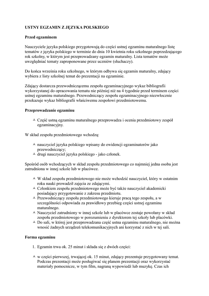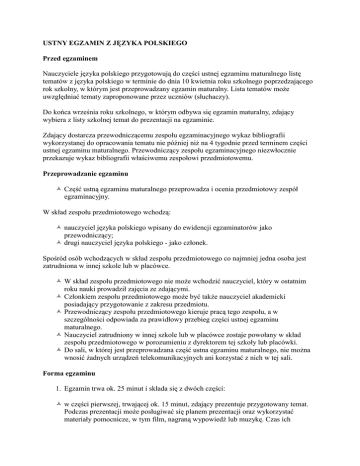 USTNY EGZAMIN Z JĘZYKA POLSKIEGO Przed egzaminem Nauczyciele języka polskiego przygotowują do części ustnej egzaminu maturalnego listę tematów z języka polskiego w terminie do dnia 10 kwietnia roku szkolnego poprzedzającego rok szkolny, w którym jest przeprowadzany egzamin maturalny. Lista tematów może uwzględniać tematy zaproponowane przez uczniów (słuchaczy). Do końca września roku szkolnego, w którym odbywa się egzamin maturalny, zdający wybiera z listy szkolnej temat do prezentacji na egzaminie. Zdający dostarcza przewodniczącemu zespołu egzaminacyjnego wykaz bibliografii wykorzystanej do opracowania tematu nie później niż na 4 tygodnie przed terminem części ustnej egzaminu maturalnego. Przewodniczący zespołu egzaminacyjnego niezwłocznie przekazuje wykaz bibliografii właściwemu zespołowi przedmiotowemu. Przeprowadzanie egzaminu Część ustną egzaminu maturalnego przeprowadza i ocenia przedmiotowy zespół egzaminacyjny. W skład zespołu przedmiotowego wchodzą: nauczyciel języka polskiego wpisany do ewidencji egzaminatorów jako przewodniczący; drugi nauczyciel języka polskiego - jako członek. Spośród osób wchodzących w skład zespołu przedmiotowego co najmniej jedna osoba jest zatrudniona w innej szkole lub w placówce. W skład zespołu przedmiotowego nie może wchodzić nauczyciel, który w ostatnim roku nauki prowadził zajęcia ze zdającymi. Członkiem zespołu przedmiotowego może być także nauczyciel akademicki posiadający przygotowanie z zakresu przedmiotu. Przewodniczący zespołu przedmiotowego kieruje pracą tego zespołu, a w szczególności odpowiada za prawidłowy przebieg części ustnej egzaminu maturalnego. Nauczyciel zatrudniony w innej szkole lub w placówce zostaje powołany w skład zespołu przedmiotowego w porozumieniu z dyrektorem tej szkoły lub placówki. Do sali, w której jest przeprowadzana część ustna egzaminu maturalnego, nie można wnosić żadnych urządzeń telekomunikacyjnych ani korzystać z nich w tej sali. Forma egzaminu 1. Egzamin trwa ok. 25 minut i składa się z dwóch części: w części pierwszej, trwającej ok. 15 minut, zdający prezentuje przygotowany temat. Podczas prezentacji może posługiwać się planem prezentacji oraz wykorzystać materiały pomocnicze, w tym film, nagraną wypowiedź lub muzykę. Czas ich wykorzystania nie może być dłuższy niż 5 minut. Czas ten wliczany jest do całkowitego czasu prezentacji. W trakcie prezentacji członkowie przedmiotowego zespołu egzaminacyjnego nie przerywają wypowiedzi zdającego, chyba że zostanie przekroczony limit czasu, w takim przypadku należy poczekać, aż zdający skończy rozpoczętą przez siebie myśl; część druga, trwająca ok. 10 minut, polega na rozmowie zdającego z zespołem przedmiotowym. Pytania członków przedmiotowego zespołu egzaminacyjnego mogą dotyczyć jedynie prezentowanego tematu i bibliografii. Jeżeli zdający nie wygłosi prezentacji lub zaprezentuje temat inny niż zgłoszony w deklaracji ostatecznej, lub nie dostarczy bibliografii w wyznaczonym terminie, zespół przedmiotowy nie przeprowadza z nim rozmowy. Pytania zadane przez przedmiotowy zespół egzaminacyjny w czasie rozmowy po prezentacji odnotowywane są w protokole indywidualnym; podczas egzaminu zdający może wykorzystać (o ile temat na to pozwala) przygotowane przez siebie materiały pomocnicze (np. film, nagranie, ilustracje, plansze). Wykaz materiałów pomocniczych zgłasza wraz z bibliografią; w czasie egzaminu zdający może korzystać z planu prezentacji, który okazuje do wglądu przed przystąpieniem do egzaminu (objętość planu nie powinna przekraczać jednej strony formatu A-4; nie jest wymagane wcześniejsze złożenie planu). Ocenianie egzaminu Ocenie podlegają wszystkie elementy egzaminu zgodnie z obowiązującymi kryteriami oceniania. W trakcie prezentacji członkowie przedmiotowego zespołu egzaminacyjnego indywidualnie oceniają każdego zdającego. Swoje propozycje nanoszą na kartę indywidualnej oceny. Przedmiotowy zespół egzaminacyjny ustala wynik egzaminu każdego zdającego bezpośrednio po jego wyjściu z sali egzaminacyjnej. W przypadku braku możliwości uzgodnienia wyniku egzaminu przez zespół, decydujący głos ma przewodniczący. Wynik ustalony przez zespół jest ostateczny. Podczas ustalania wyników w sali nie mogą przebywać zdający. Wyniki tej części egzaminu przewodniczący przedmiotowego zespołu egzaminacyjnego ogłasza tego samego dnia, o godzinie określonej w harmonogramie. Zasady oceniania ustnej części egzaminu W ustnej części egzaminu ocenie podlegają: prezentacja tematu (zawartość merytoryczna i kompozycja wypowiedzi), rozmowa o problemach związanych z prezentowanym zagadnieniem i sprawność językowa w obu częściach egzaminu. Za ustną część egzaminu zdający może uzyskać 20 punktów w następującym układzie: za prezentację tematu: 5 pkt (3 za zawartość merytoryczną , 2 za kompozycję) – 25% ogólnej punktacji, za rozmowę: 7 pkt – 35% ogólnej punktacji, za język: 8 pkt (oceniany w obu częściach egzaminu) – 40% ogólnej punktacji. Wyniki egzaminu maturalnego w części ustnej Zdający zdał egzamin maturalny w części ustnej z języka polskiego, jeżeli uzyskał co najmniej 30% punktów możliwych do uzyskania. Szczegółowe kryteria oceniania znajdują się Aneksie do egzaminu maturalnego od 2010 roku (Egzamin maturalny od 2010 roku. Aneks), zamieszczonym na stronie internetowej Centralnej Komisji Egzaminacyjnej http://www.cke.edu.pl/images/stories/Aneks_inf_mat/Aneksy_2010/aneks_2010.pdf Egzamin dla osób niesłyszących zdający przystępuje do części ustnej egzaminu z języka polskiego zdający ma prawo do zdawania części ustnej egzaminu z języka polskiego w języku migowym lub przygotowania prezentacji na piśmie, w przypadku, kiedy zdający nie zna języka migowego i nie mówi. ZASADY SPORZĄDZANIA BIBLIOGRAFII Bibliografia – uporz